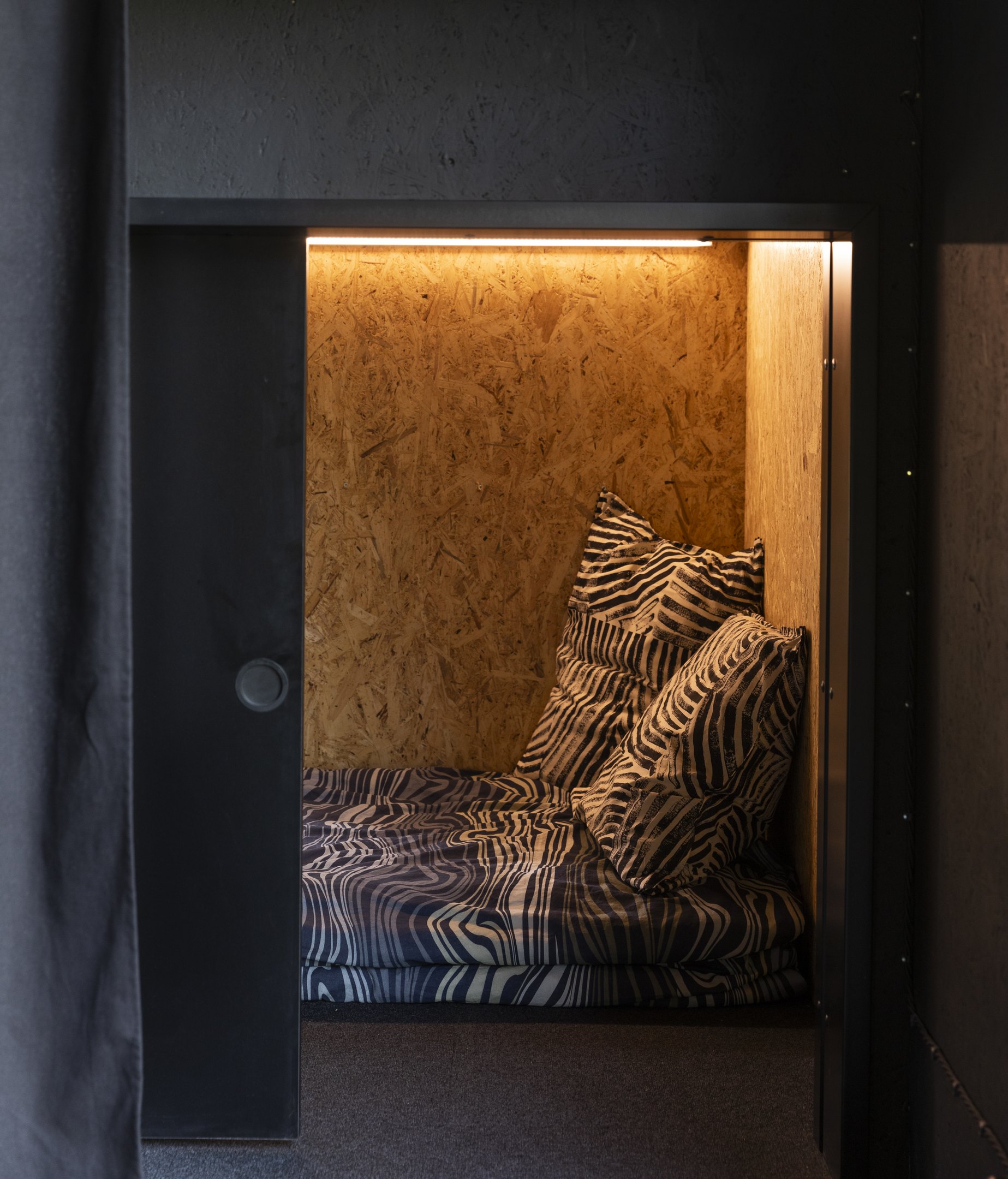 Following Tanizaki´s remark, the aesthetics of the project are interpreting two different types of “shadows”. First, the buildings surfaces are meant for studying the interplay of light and shadow. The reused planks of the façade make a relief that changes its appearance in relation to Earth´s rotation. Inside, the walls are covered with black, translucent and softly undulating full-height curtains. Together with black floor and ceiling, they generate a calming, meditative environment. As a radical paradigm shift to a fully circular economy begins with change of values, house Shadow offers a safe space for contemplating new ways of building and living in harmony with our home planet.