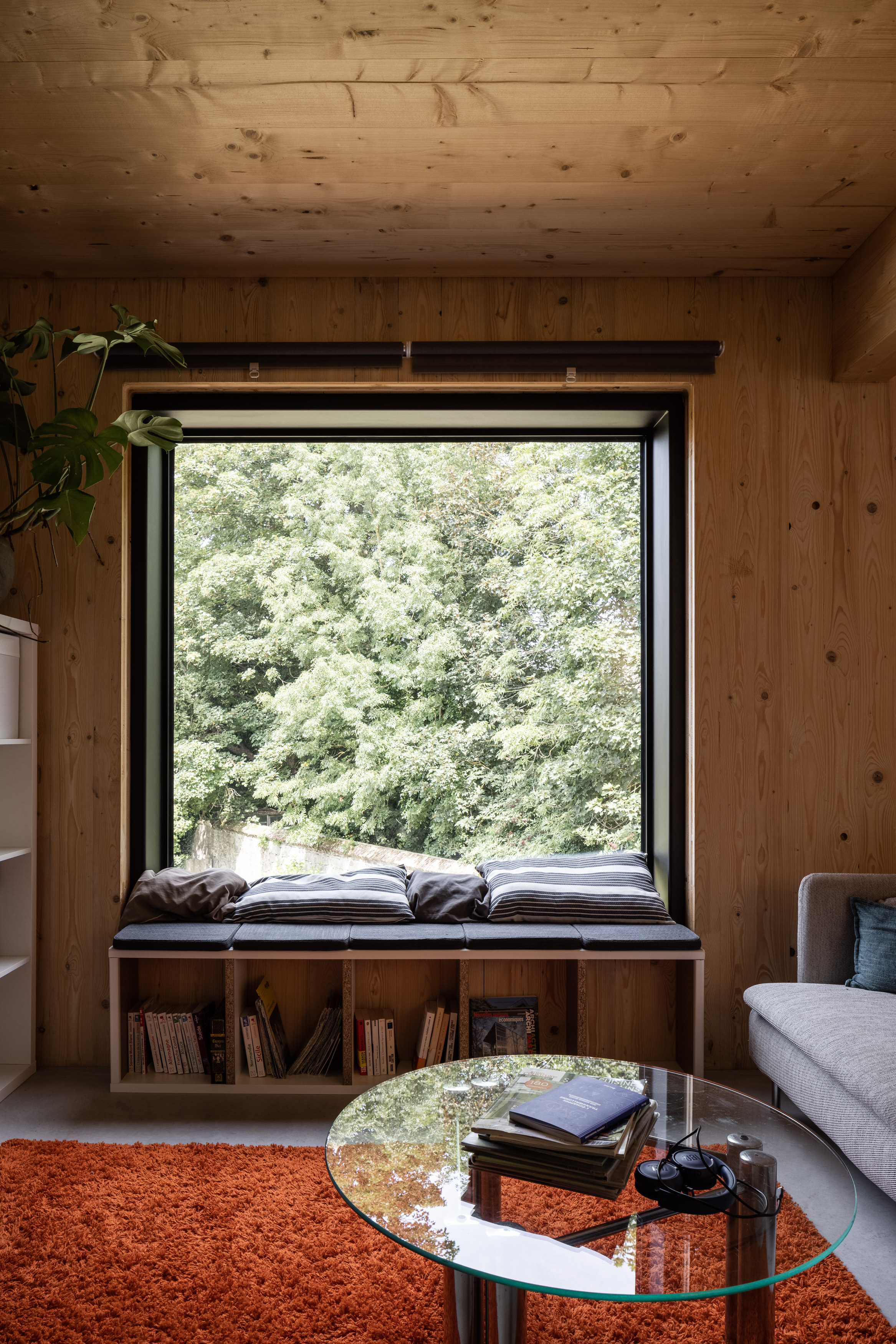 The project prioritizes environmentally responsible construction through the use of cross-laminated timber (CLT), a material with low environmental impact, excellent insulation properties, and a reduced carbon footprint. The building’s compact design minimizes energy loss, while large glazed openings optimize natural light and passive heating. A rooftop terrace and green spaces enhance biodiversity, while shared facilities reduce individual energy consumption and material waste.