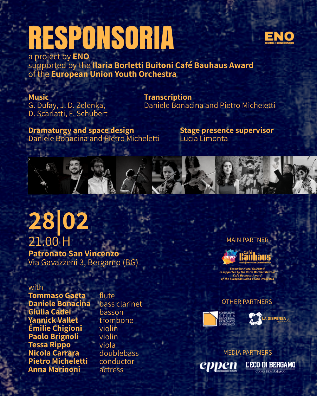 Responsoria’s launch concert (28.02.2025) will take place in Bergamo’s Patronato San Vincenzo, an Association supporting those facing marginalisation, homelessness, and poverty. Before their performance, the ENO musicians will serve supper in the canteen, open to both regular visitors and residents of the Association and to new audience members. "We think", says ensemble spokesperson Daniele Bonacina, "this idea supports an even closer exchange between performers and audience, and raises citizen awareness of the reality and value of the work of an organisation like Patronato san Vincenzo."