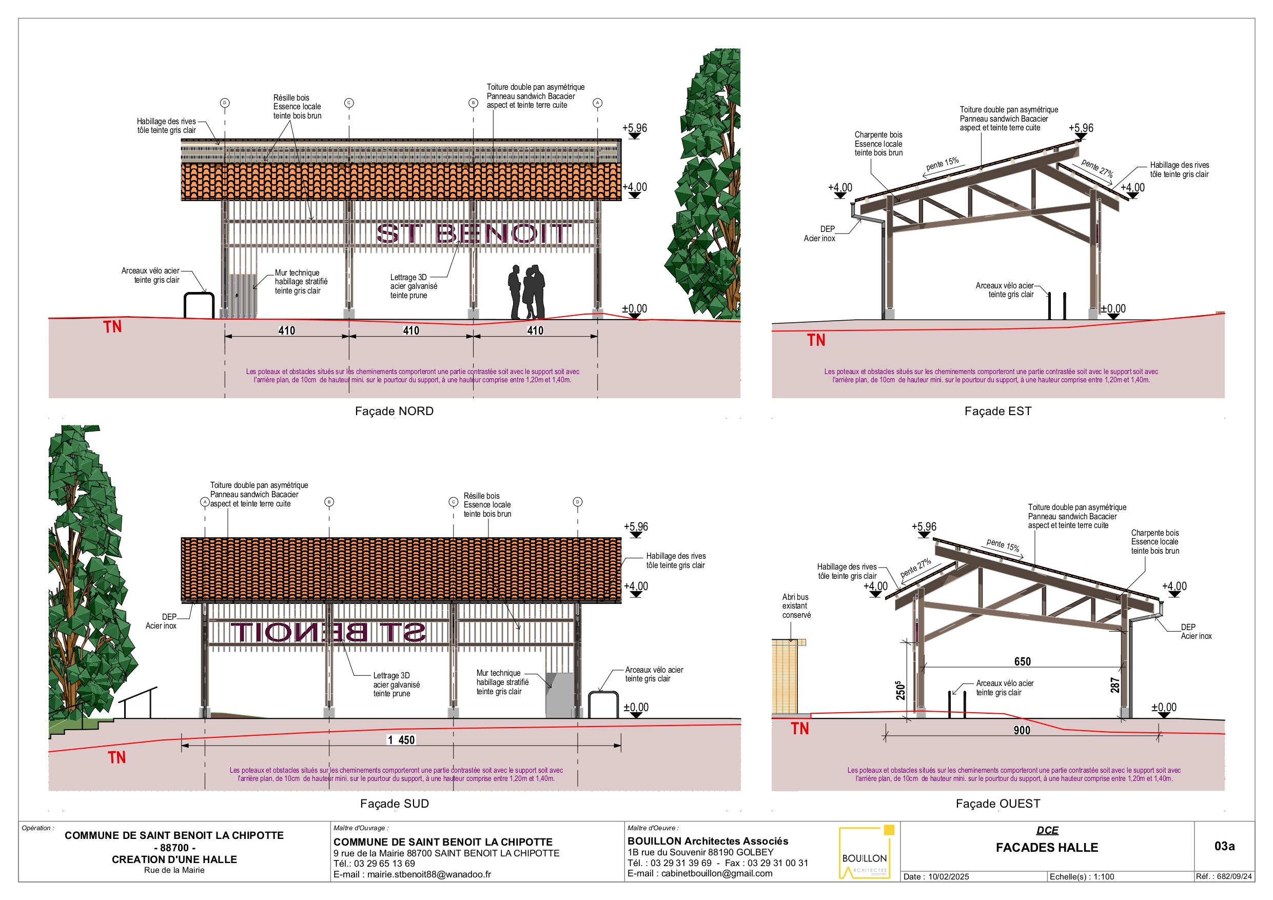 The hall will be designed to accommodate photovoltaic panels in the future. It will constitute a green lung in the village center, and constitutes the first stage of requalification of this rural commune, since a second phase is planned with the creation of a path towards the Town Hall square, the Church passing through a developed and secured space on communal land including a ruined building to be redeveloped in a future project.