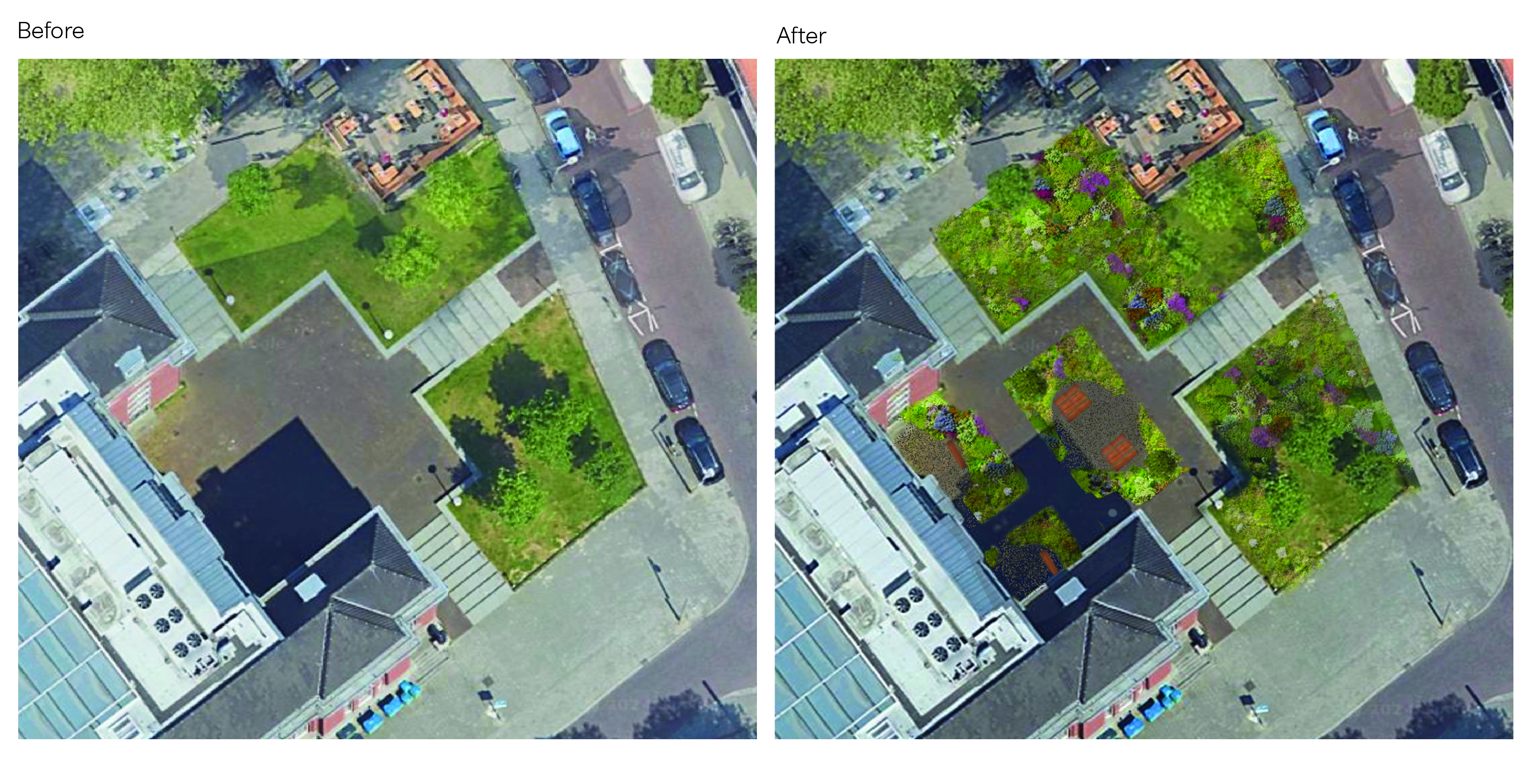 Affordability was also a key consideration in the design of the square. The design focuses on the removal of parts of the tiling, rather than taking everything out. Some of the original tiles are kept in place to serve as pathways through the garden. The planting plan keeps weekly student maintenance and half-yearly municipal maintenance in mind. Gardening moments will be open to residents of the area but will be organized from the study-association of the university. The main cost of the project is the renovation itself, after which costs can be kept low as a result of the enthusiastic involvement of the community.