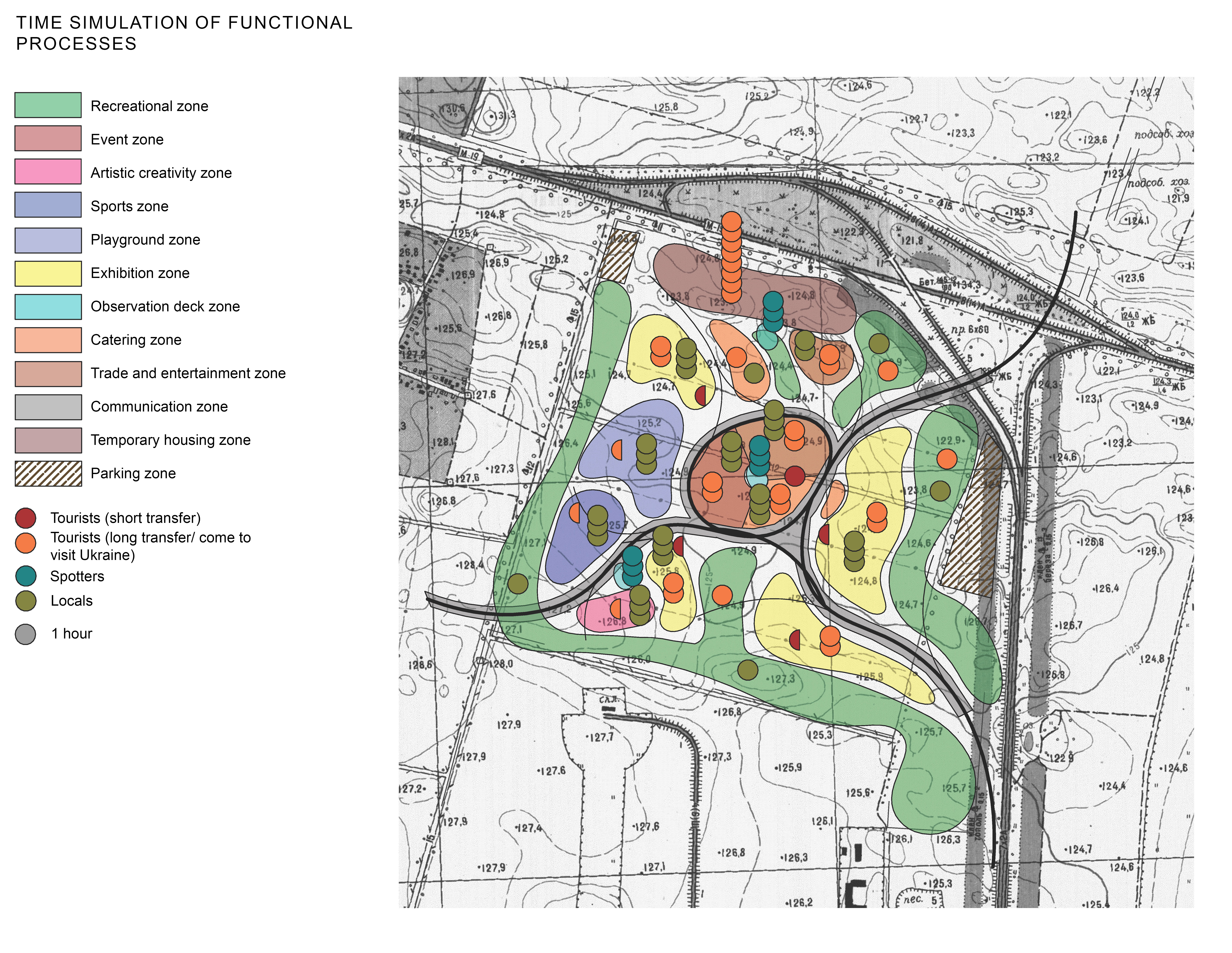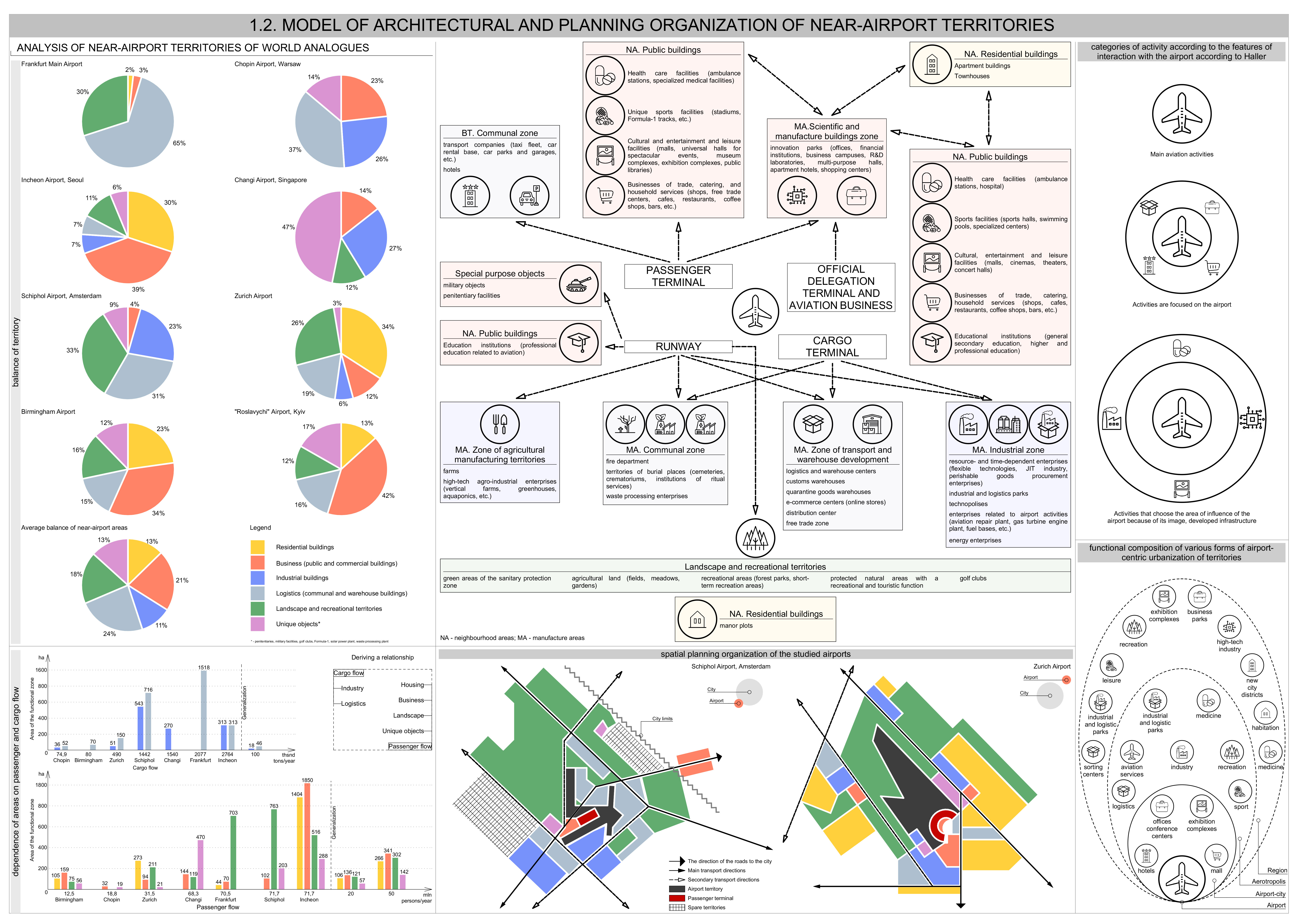 Before the design process began, an analysis of scientific studies and existing solutions related to this topic was conducted. This work resulted in a theoretical justification for the architectural and planning organization of airport impact zones. It includes principles, compliance requirements, and a comprehensive model of airport-adjacent areas, detailing what can be located there, how elements interconnect, and how to balance functional spaces.