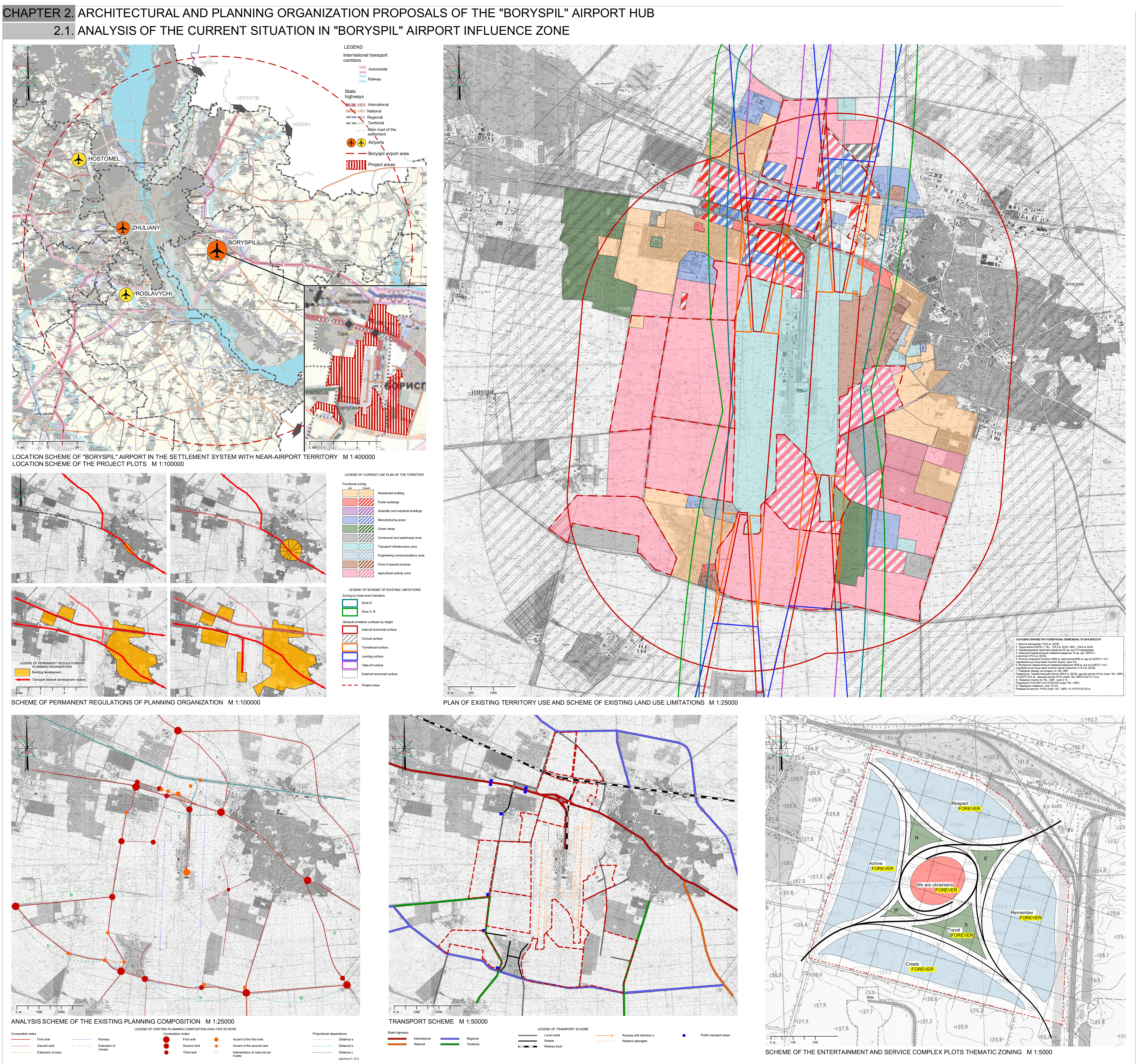 During the design process, I also relied on the work of researchers who studied modelling and architectural-planning organization of transport hubs (I. Dreval, V. Shchurova, O. Ryabova), the placement of monofunctional developments near airports (N. Avdeyeva, O. Semikina), the architectural-planning organization of airport development objects (H. Ageyeva, M. Kasim), aerotropolises or airport cities (J. Kasarda, K. Veretennikova, S. Timchenko, D. Rundin, N. Ismailova), inclusive harmonization and design of the architectural environment (N. Shebek), as well as counteracting the spread of noise and electromagnetic fields (L. Levchenko).