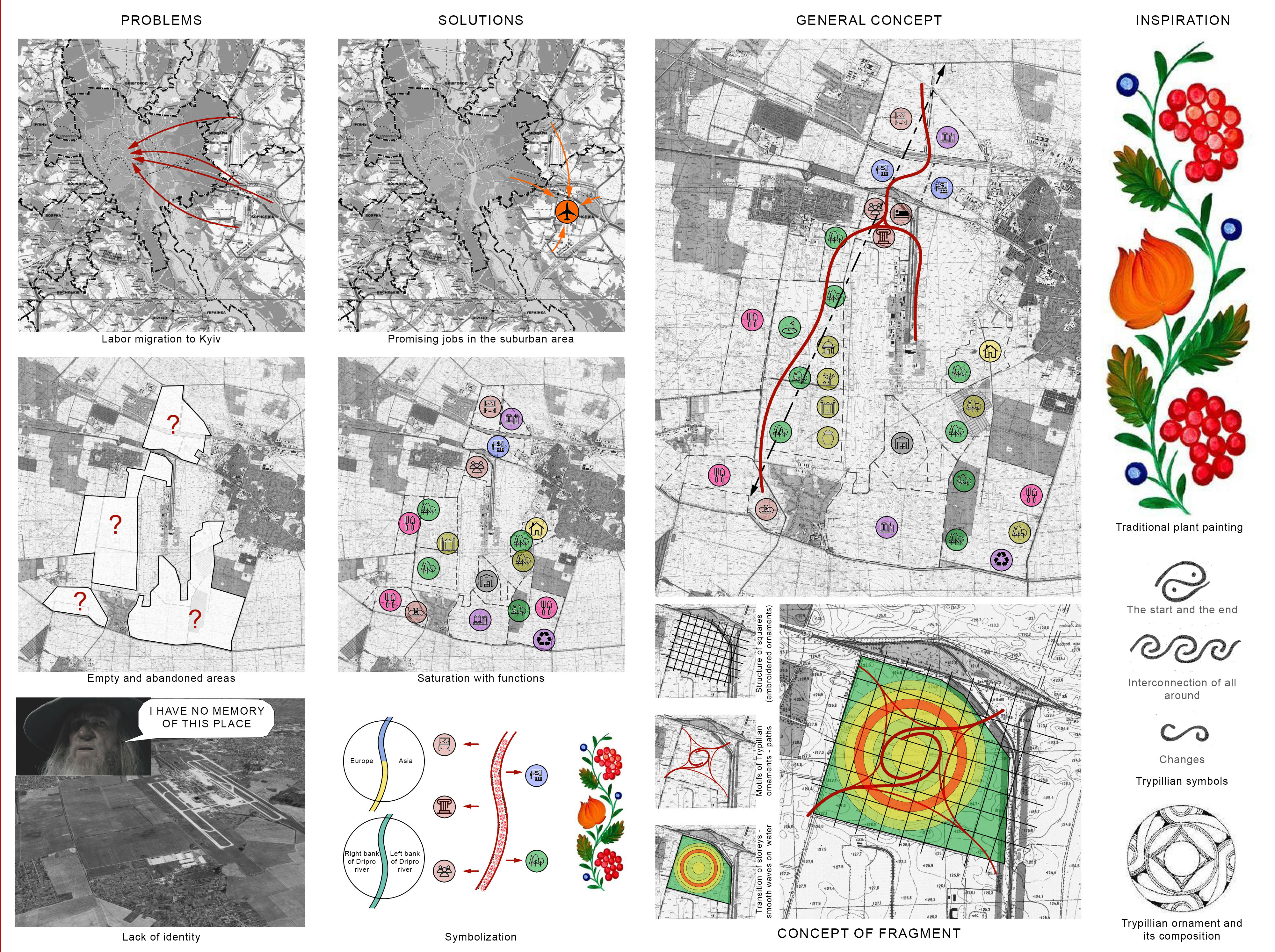 Next, information was gathered on Boryspil and its surroundings. The study covered the evolution of the area over ten centuries, its identity, and existing social, political, economic, and architectural planning challenges and constraints.