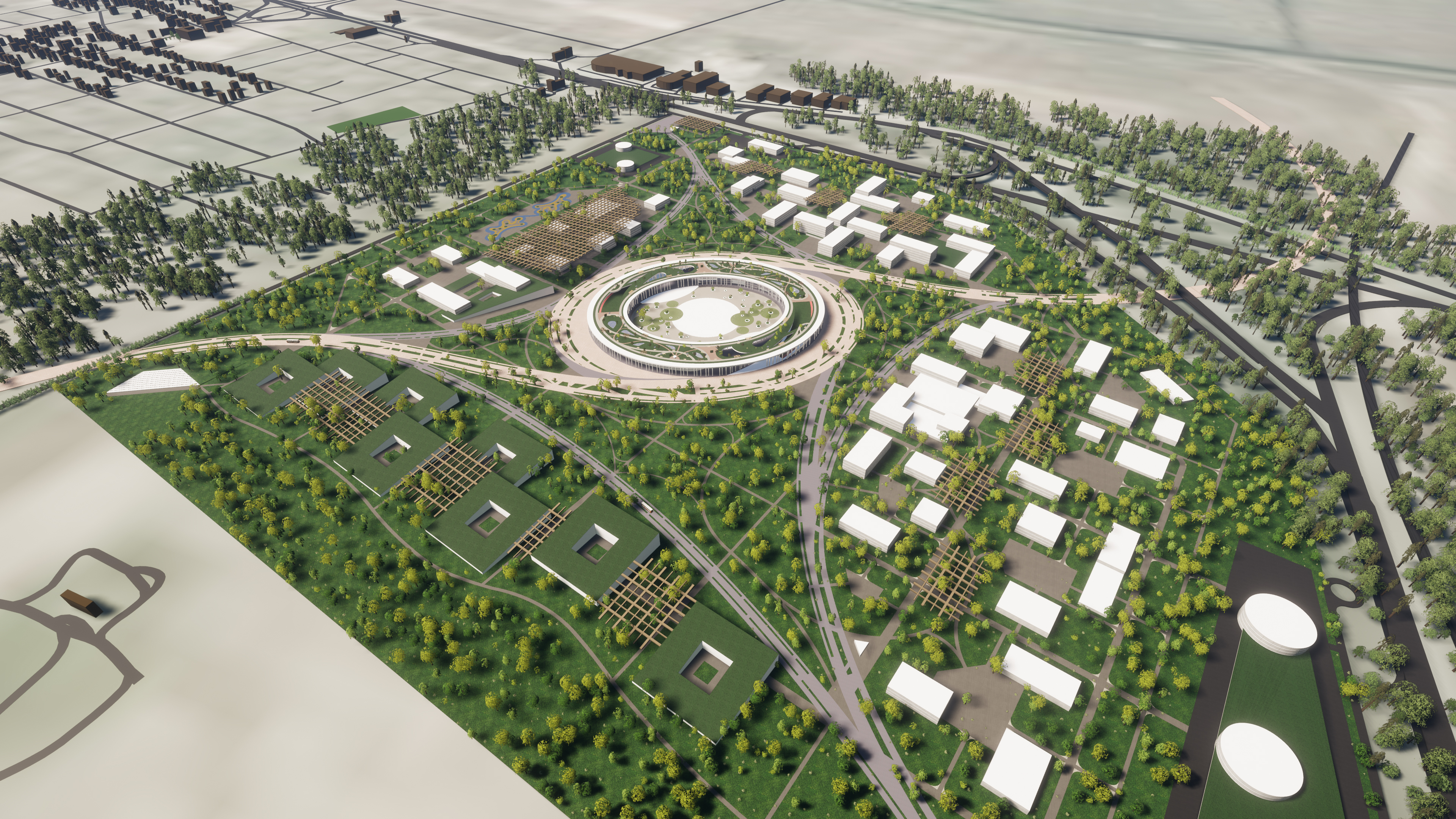 Before design began, a study identified key aspects of sustainable development for airport-adjacent areas. These include alternative energy, eco-friendly materials, efficient agro-industry, energy-efficient buildings, microclimate improvement, recycling, resilience, and adaptability. Special focus was given to noise protection, crucial for airport zones.
