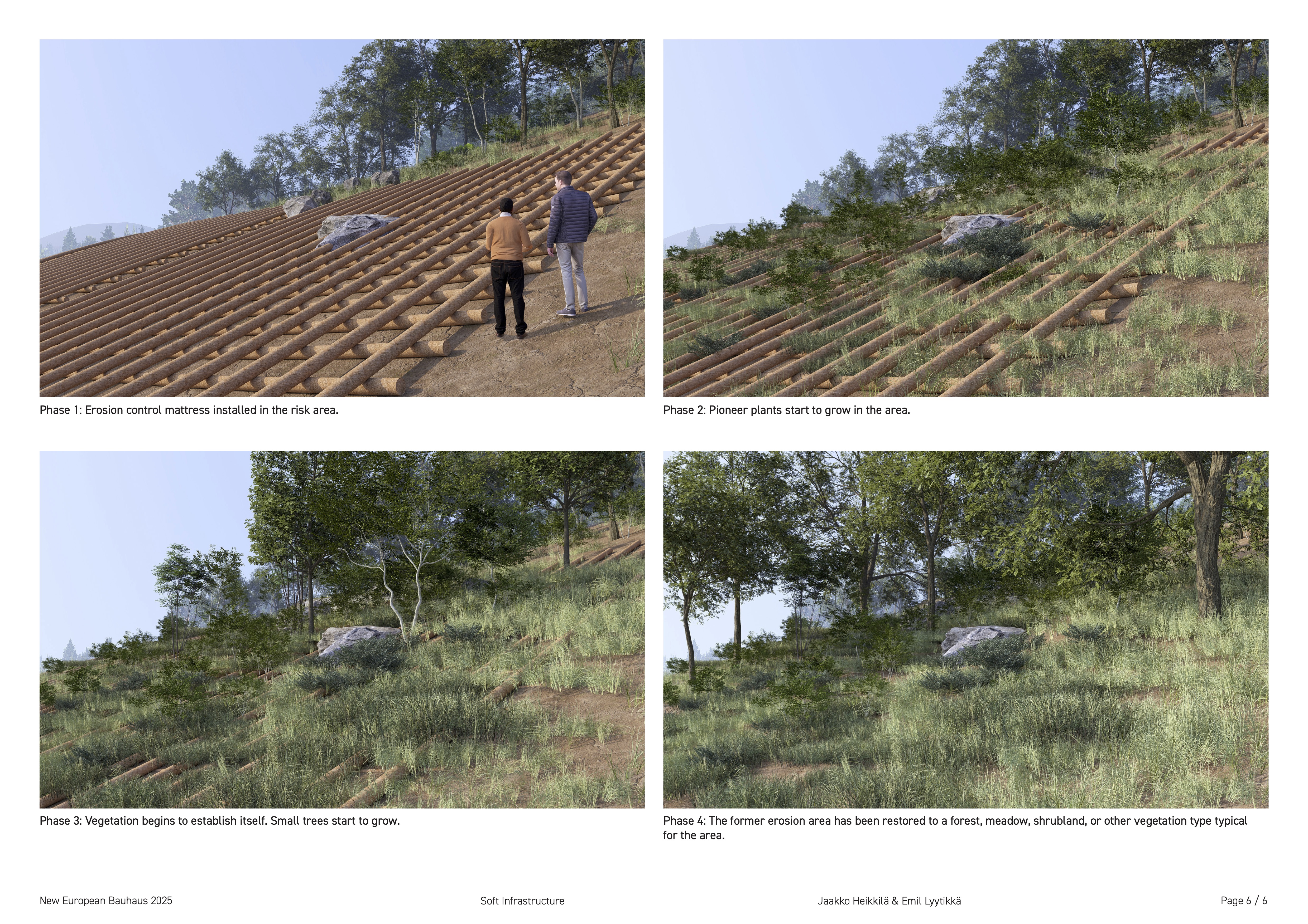 We aim to assemble reed bundles near shorelines and transport them to erosion-prone hillsides, where they are arranged into a grid structure to protect the ground. This temporary solution allows local flora to recover, eventually taking over the role of stabilising the ground.