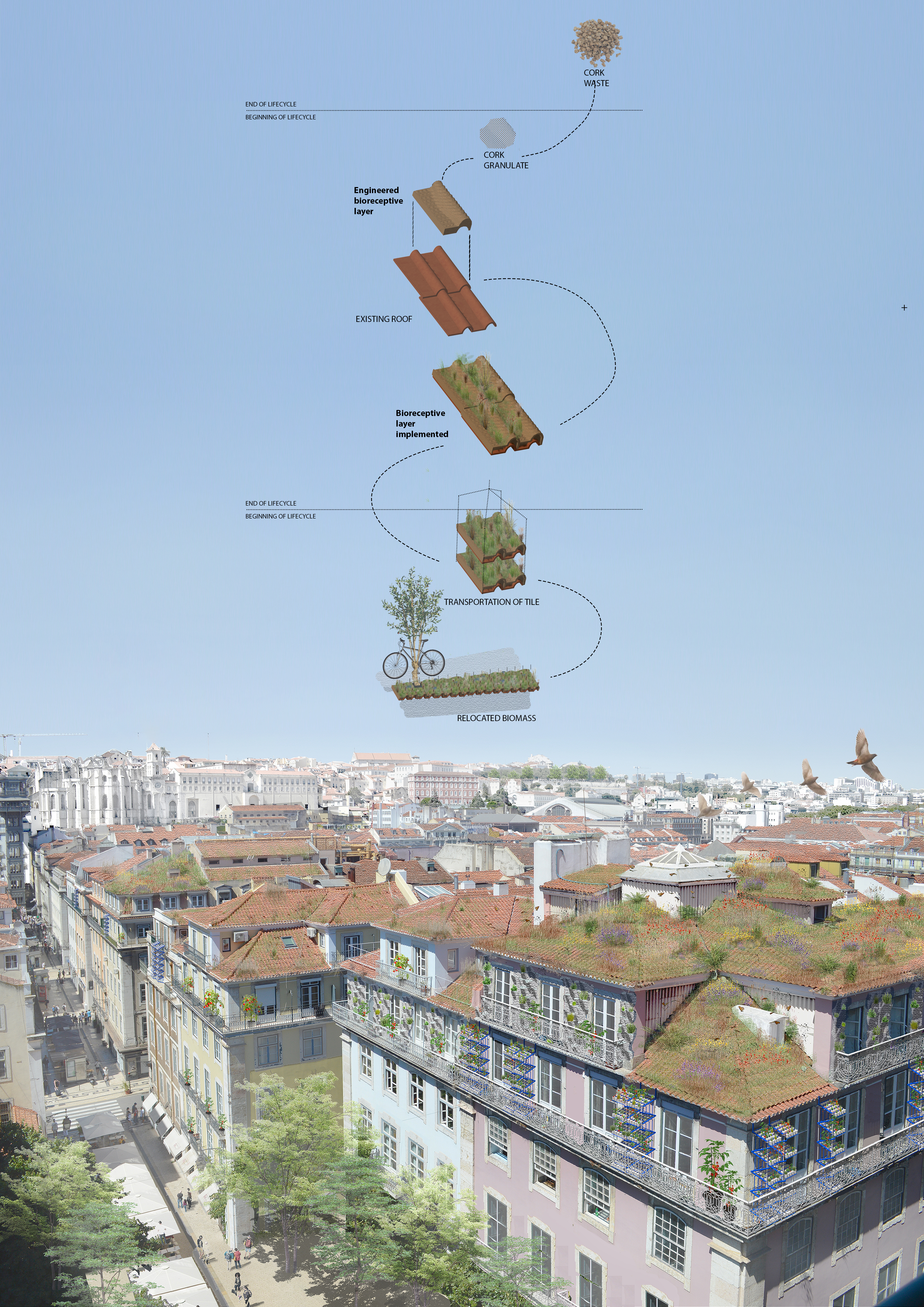 4th nature 5th facade is a platform for the seed of life to grow freely, and evolve into a continuous ecosystem. While respecting the historical fabric of the centre of Lisbon, this green infrastructure improves biodiversity by connecting fragmented habitats, and mitigates floodings and extreme heats by retaining water and regulating moisture. By following distributed design principles, this upgrade of the traditional roof tile—together with nature—can spread and make cities more resilient.