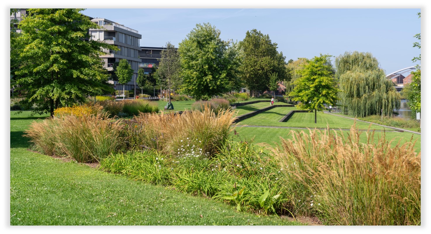 Neckarbogen spans 17 hectares of green spaces, transforming a former brownfield into a sustainable district. Five parks - Neckaruferpark, Hafenpark, Campuspark, Floßhafen, and Stadtdschungel - complement a renatured riverbank, lakes, a promenade, and diverse plant habitats to ensure rich biodiversity.