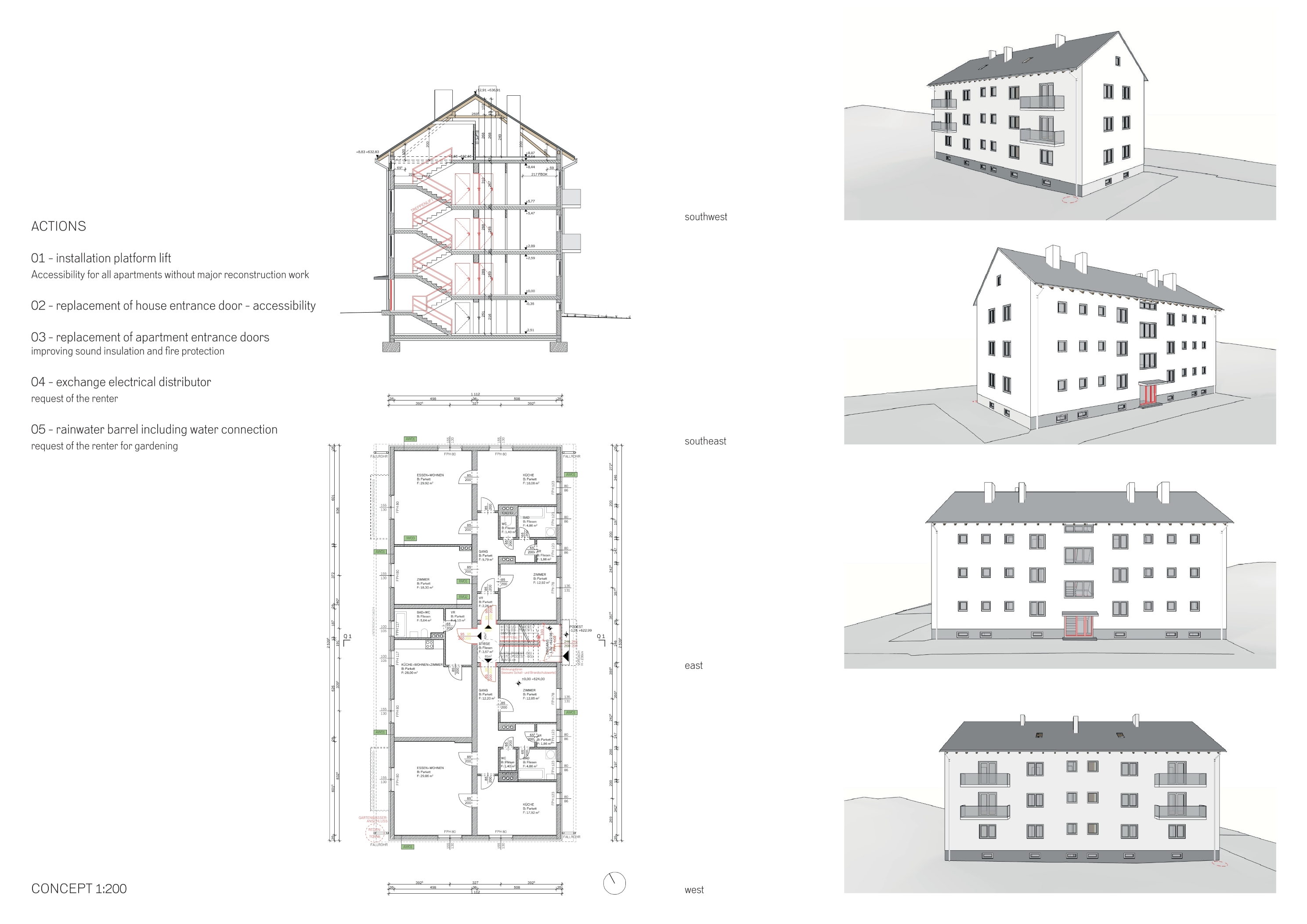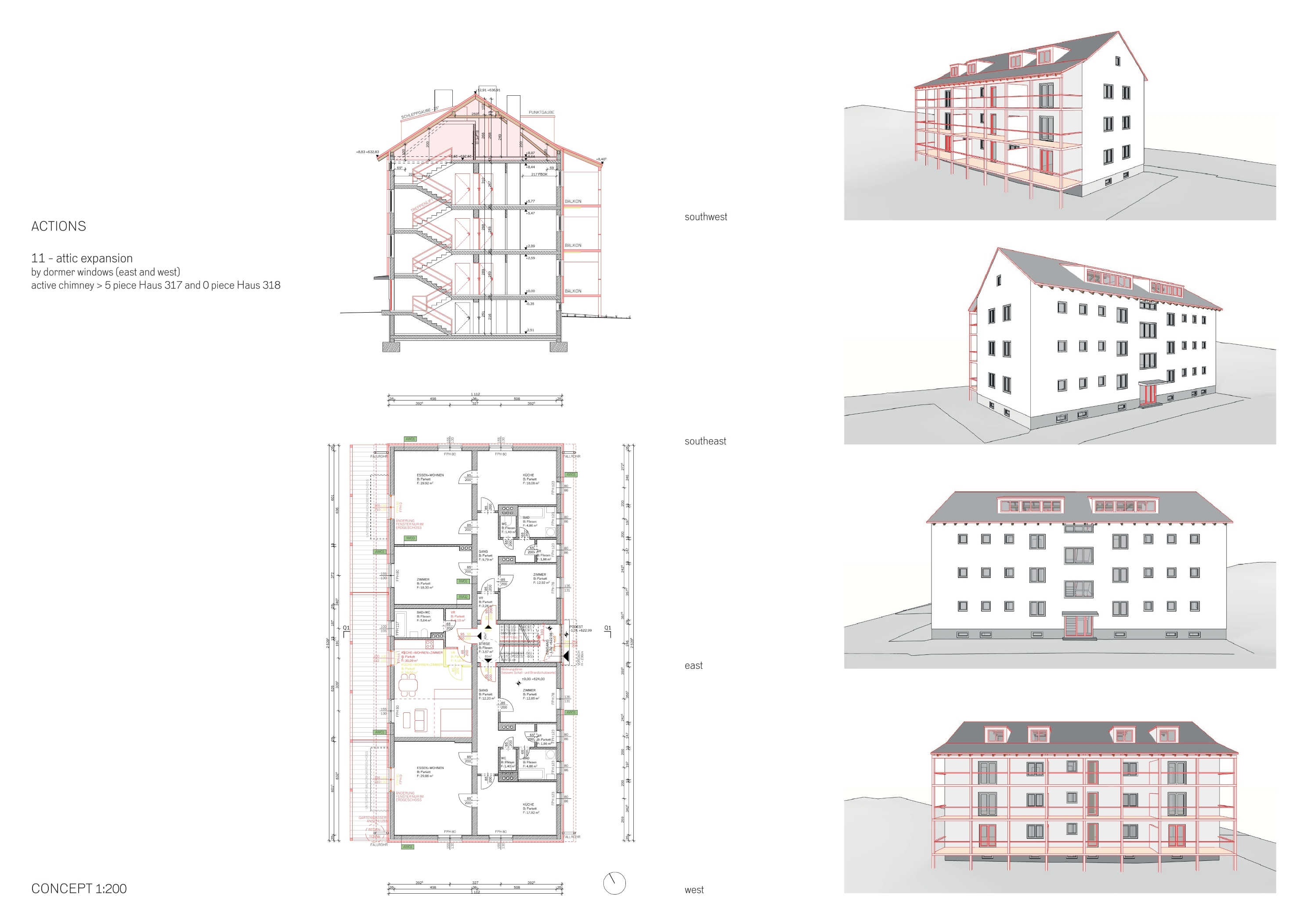 Roofs: Existing roofs will be re-covered, and eaves will be extended as weather protection for balconies. Expanding the existing dormers will allow for the extension of interior spaces and the creation of new balconies. These measures also contribute to an attractive and modern appearance of the buildings.
