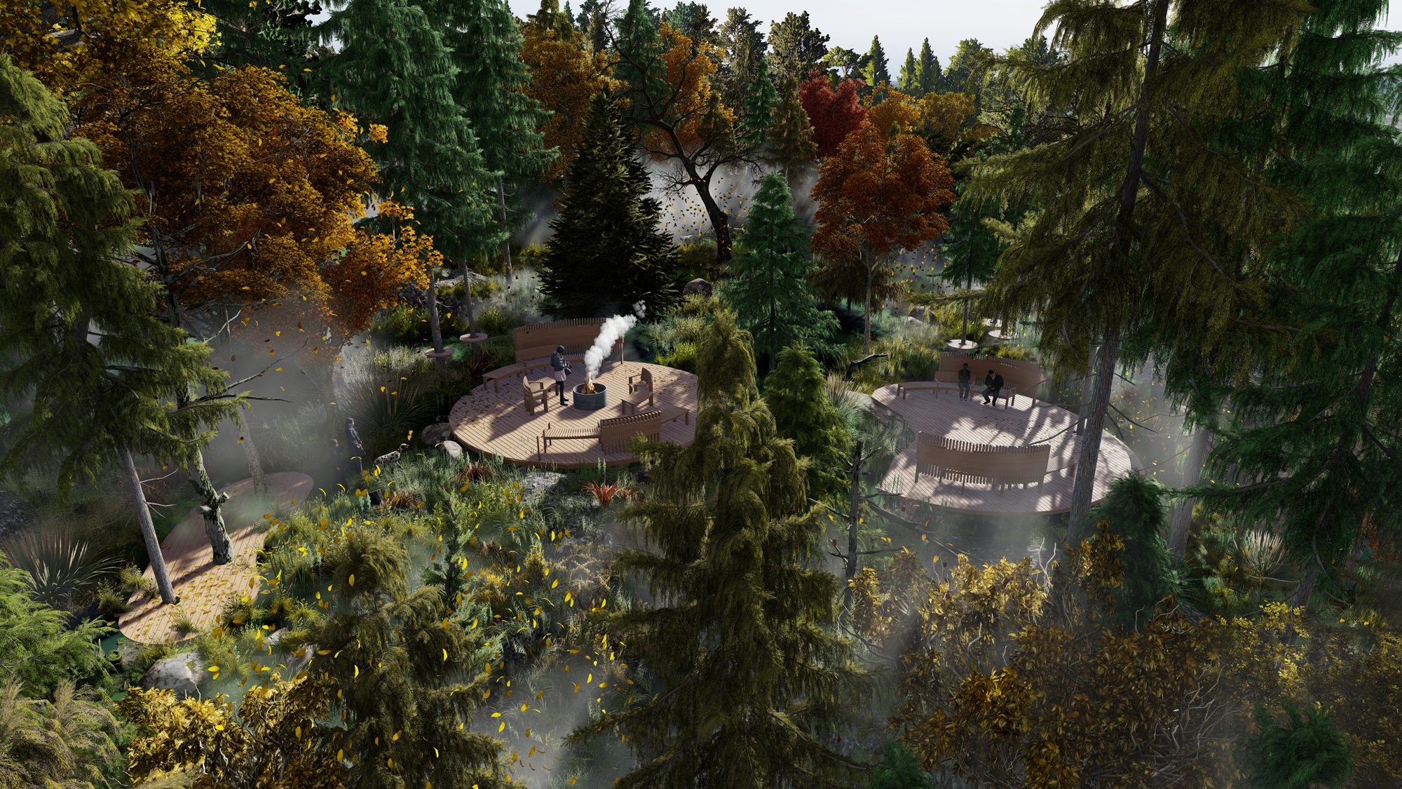 2. Architectural Qualities – The semi-permanent structures are designed for minimal environmental impact, adapting to the terrain rather than altering it. Multi-functional platforms, ramps, and a forest stage provide diverse uses while maintaining a light footprint. Wood and natural textures reinforce a sense of belonging and warmth, making the space inviting year-round.