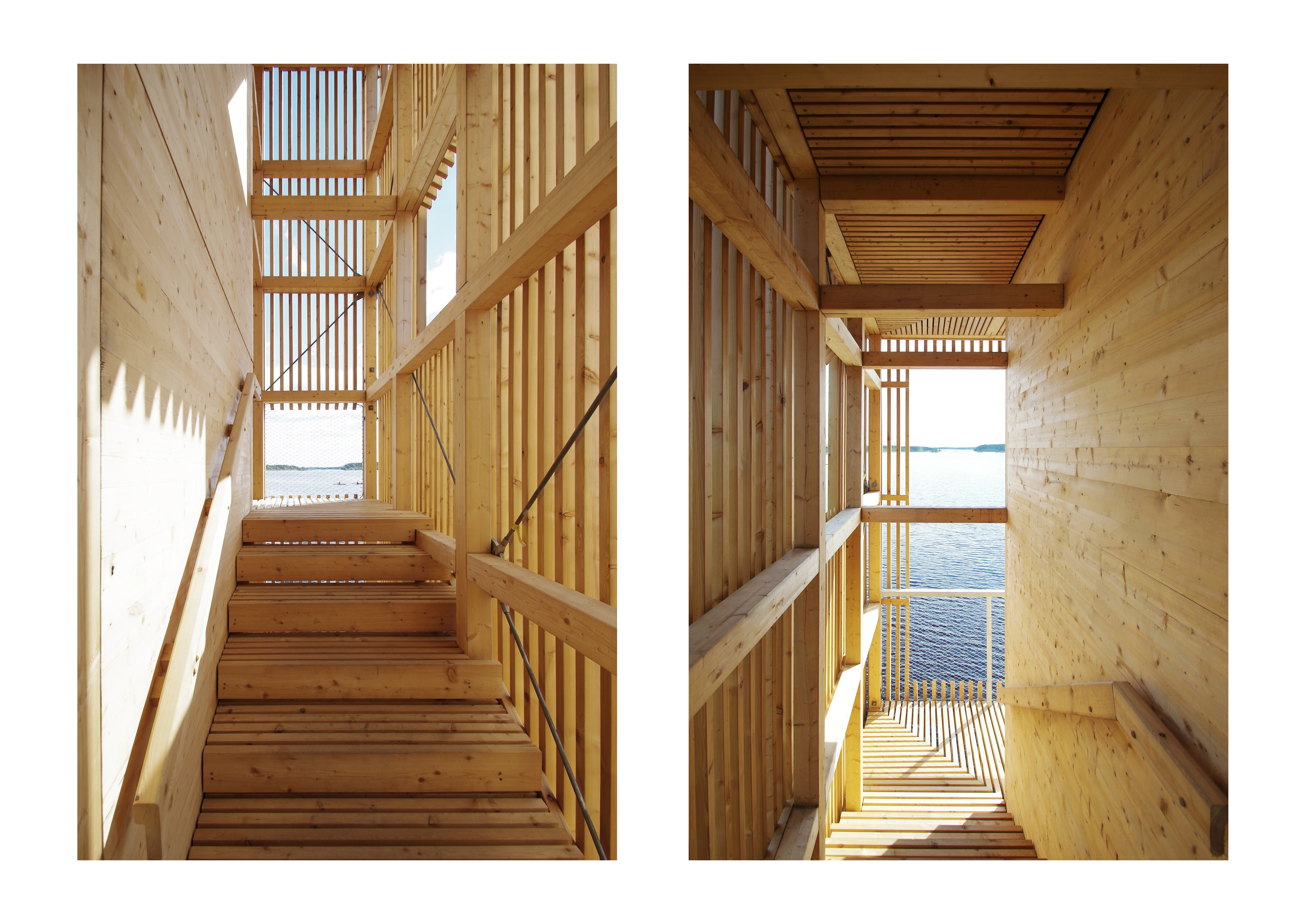 Made entirely of wood, the building is composed of an inner core of cross-laminated timber (CLT) and an external wooden frame that serves as a load bearing structure. The inner core made of CLT forms the frame for an extra large periscope with stairs circling around it. When taking the stairs up or down one can experience a rich range of views framed by the various openings cut into the structure. The tower is composed of three prefabricated elements with the roof forming a fourth element. The facades and the stairs are made of larch. The details and the security netting are of steel.