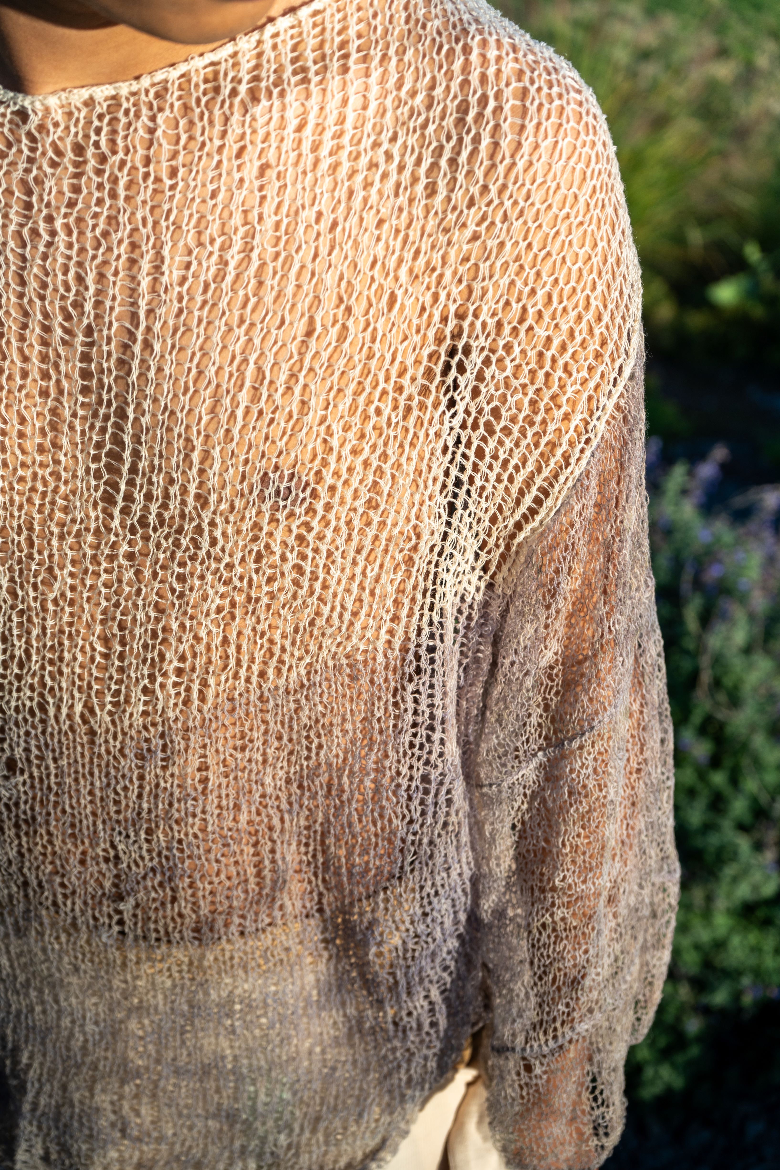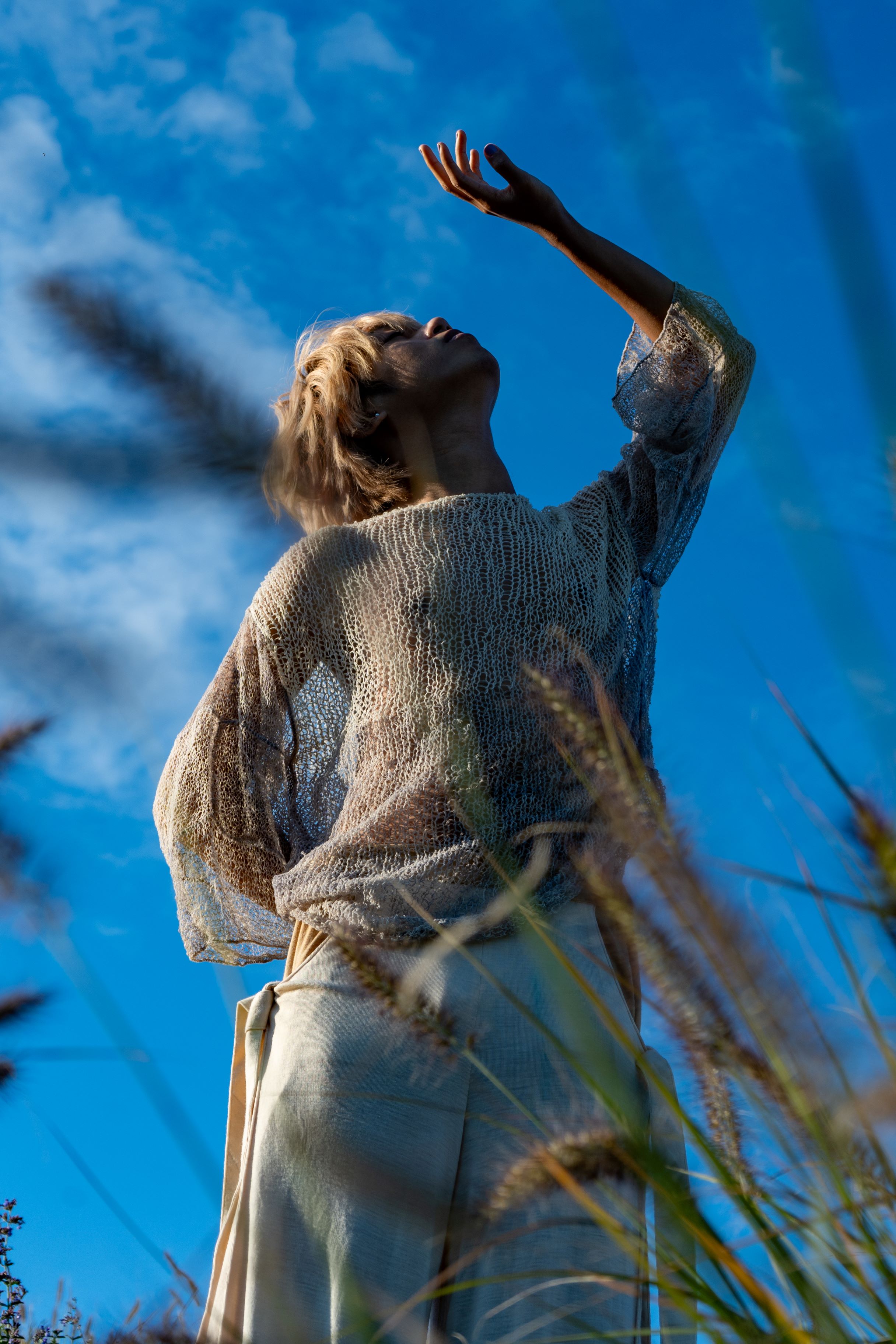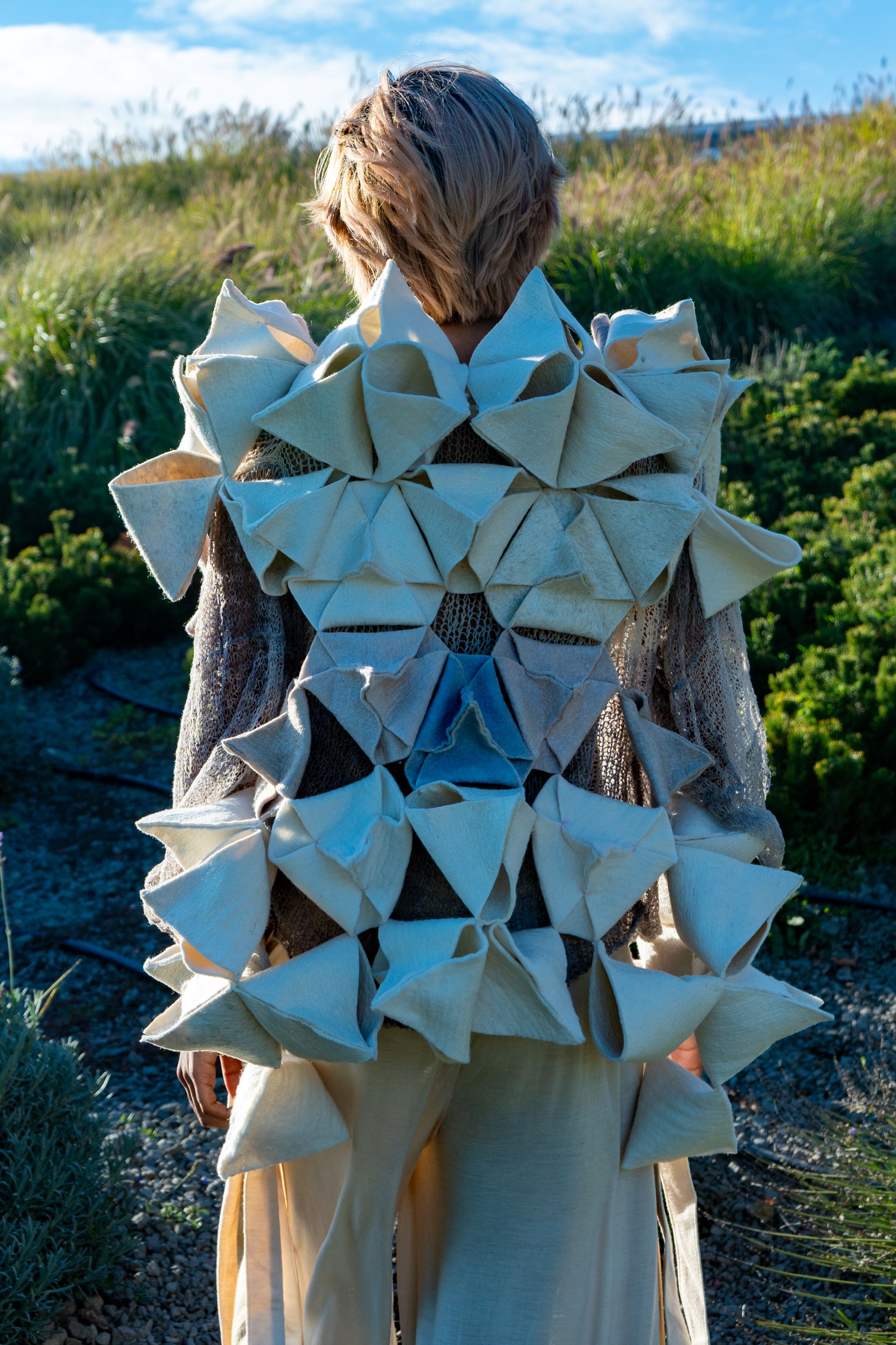 The deliberate choice of knitted materials, fine soft wool, felt, and strong knit aimed to create a unique aesthetic. The felted jacket with pyramids symbolises the future and the power of many, representing the microorganisms used to colour the wool. The meticulously finely hand knitted top is a reference to human vulnerability, and the transparency is a playing with the idea of gender identity. The pants are playful and as all pieces one size fits all.