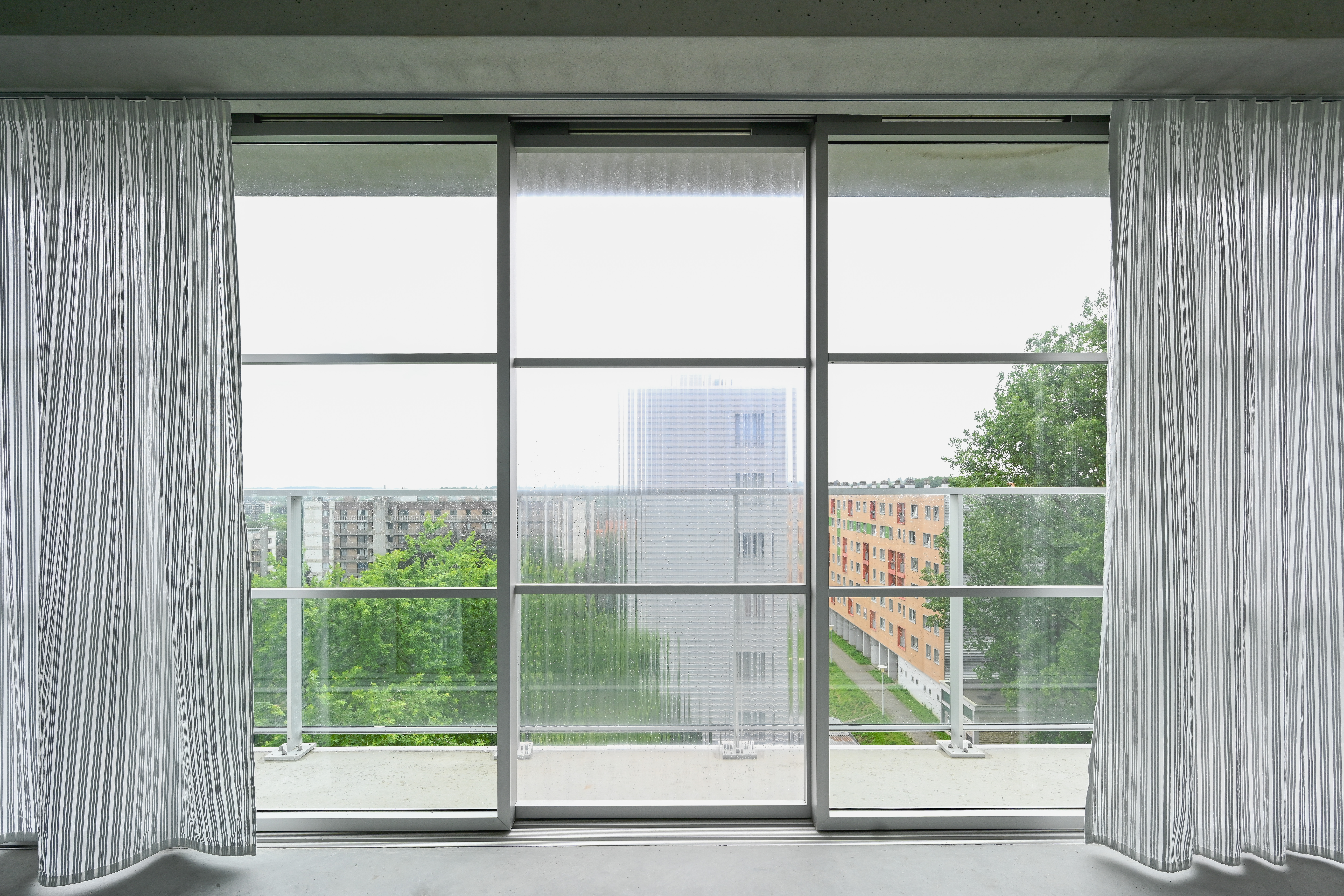 On a level of the living unit, we used the structure of the building which had an open façade arrangement but very closed frameworks, to open up maximum towards de wintergarden. By keeping the concrete structure as light as possible, we made sure light reflection and transmission through the structure into the interior of the building was kept optimal. The glazed balustrade and transparent/translucent wintergarden edge works together with the inside to provide as open a vista as possible. In a counter direction, we also took care to provide enough ways to ensure privacy and intimacy: thick, insulated curtains on the inside provide a way to control privacy, introduce a feeling of comfort and intimacy indoors. The balance between transparent and translucent panels together with greenhouse curtains, does the same on the level of the wintergarden.