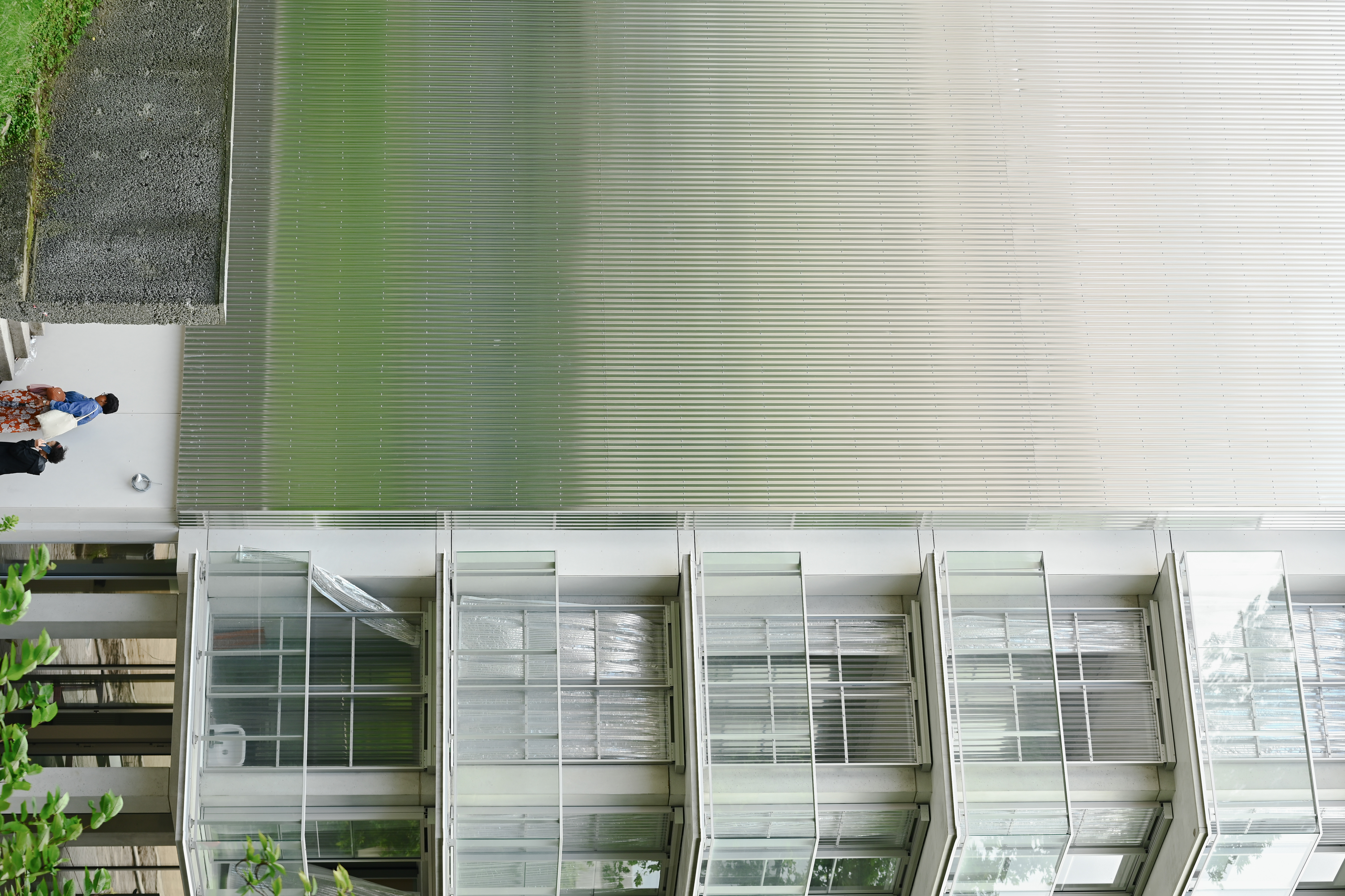 On a level of the building and the neighbourhood, two aspects are important. (1) the radical openness of the ground floor: it provides a visibility from and to the neighbourhood. It houses the offices of janitors of multiple buildings, a social antenna for the neighbourhood, a pharmacy and hopefully soon also again a small general store. (2) the simplicity but also reintroduced clear identity for the building in the neighbourhood. By combining the wintergarden structure with a simple and bright cladding for the short facades, the building resembles its former self but with a new fresh image.