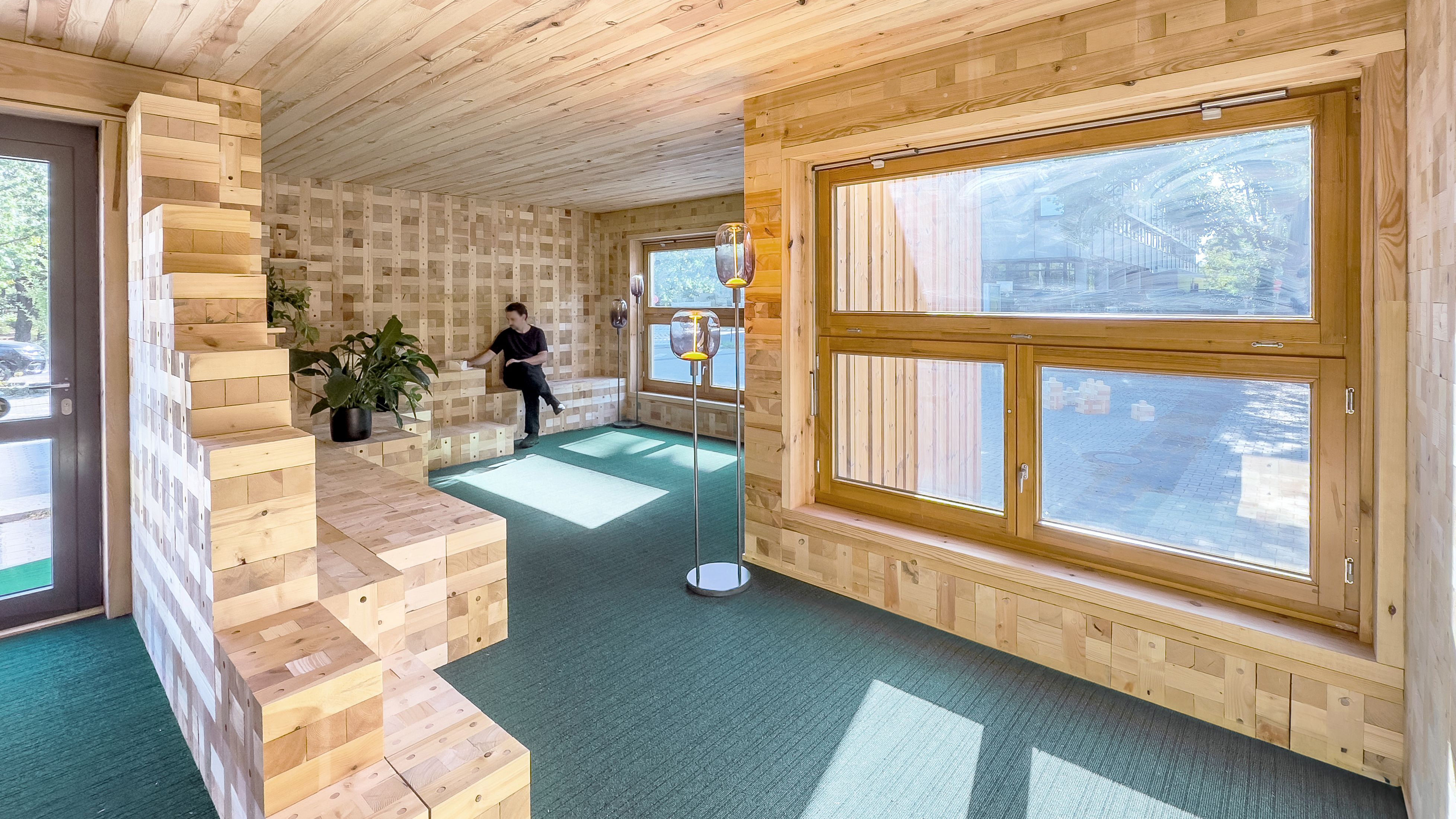 The CRCLR HUT stands as a symbol of architectural creativity, the vision for a sustainable, circular construction method, and represents the potential of innovative partnerships in the construction industry. Buildings built with circular elements bring new aesthetics, allowing for interaction in both design and functionality. The micro-modular approach is visible inside, where timber bricks seamlessly merge façade and interior furniture into a holistic principle that can evolve over time.