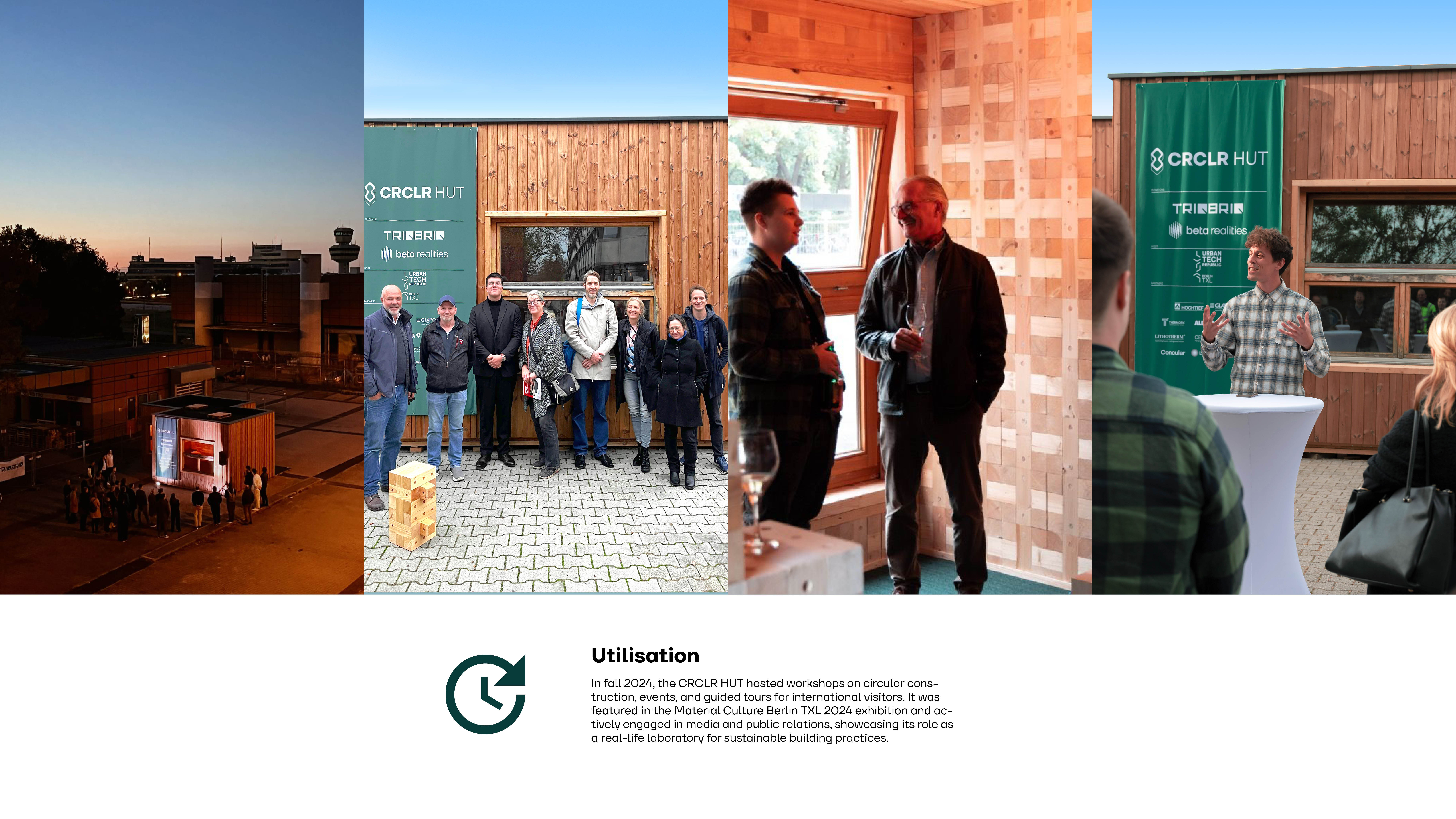 Additionally, the CRCLR HUT was featured in the exhibition MATERIAL CULTURE BERLIN TXL 2024. A Building for the Future, displayed in the information center from September 7th to November 30th. The building not only contributes to Berlin’s construction future but also serves as an initiator for a broader movement in circular, waste-free, and carbon-negative construction in Europe, with Berlin TXL as a competence center for sustainable building. The project sends a vital message for the building transition, uniting suppliers, manufacturers, builders, and planners toward a common goal.