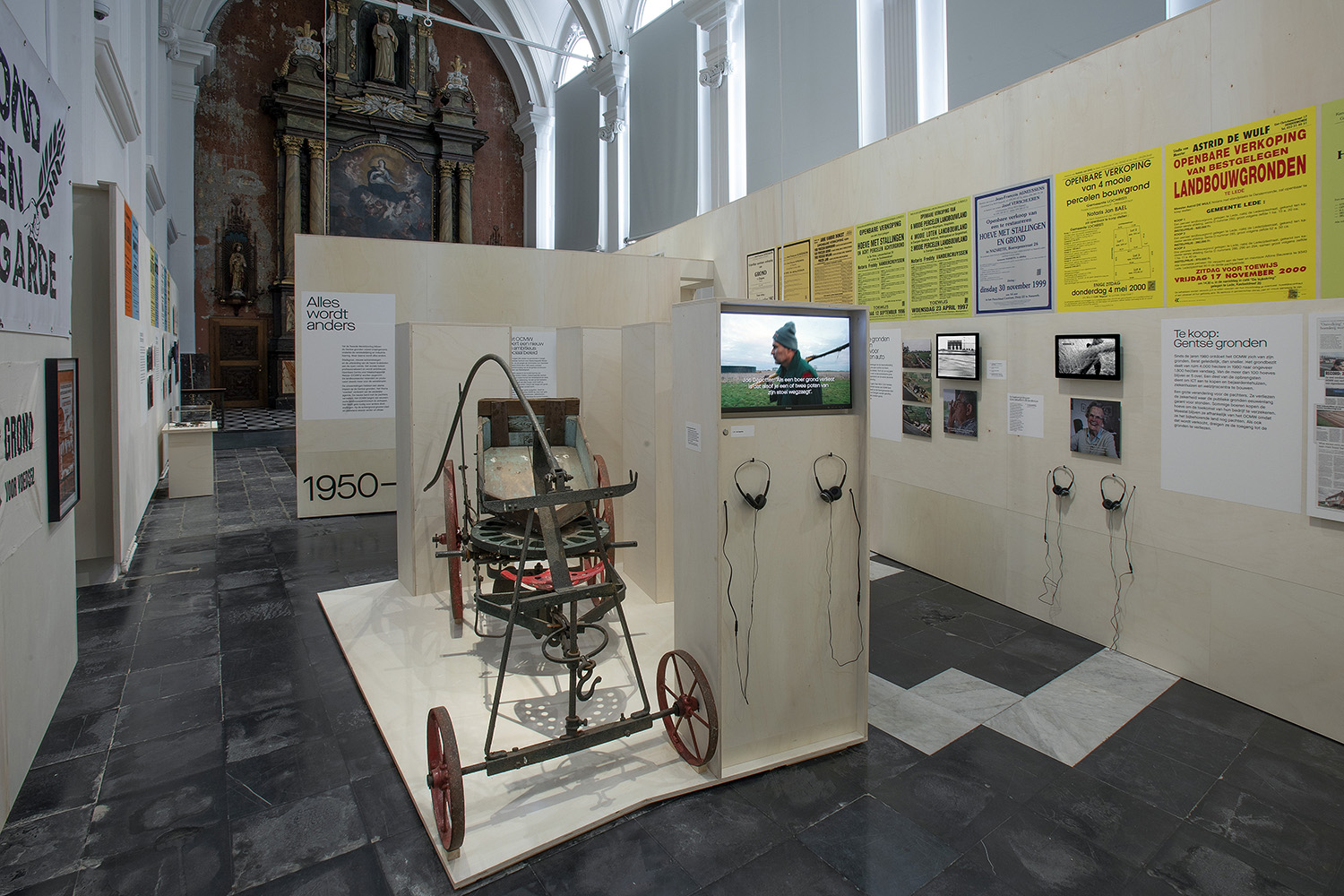 The exhibition took place in a stunning 280-square-meter church, part of STAM. This location was symbolic, as the church was once part of the Bijloke Abbey, a medieval charity institution tied to the origins of Ghent’s agricultural holdings. This location offered a unique setting that deepened the visitor’s connection to the story of the land. To enhance the visual experience, the scenographer designed imposing walls which mirrored the church's architecture, towering over visitors. Placed diagonally, they divided the space into four rooms, gradually building tension and reinforcing the exhibition’s narrative arc. The final room, enclosed by a curtain and equipped with a bench, invited visitors to watch a documentary and engage in debate.