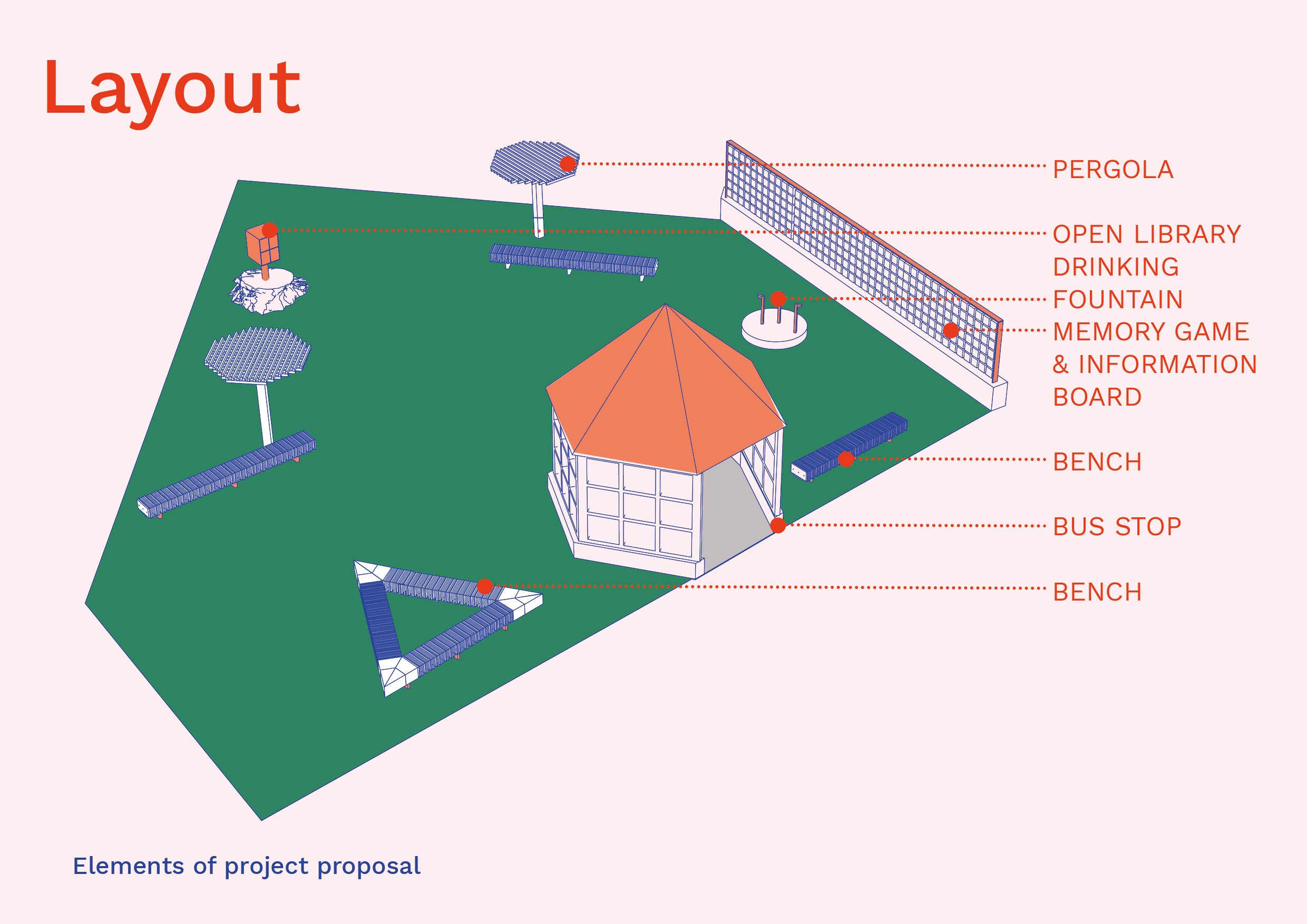The design plans also include a “little free library” box, a drinking-fountain, an information board and a board game, in order to add a more personal touch to the site, and to strengthen the community.