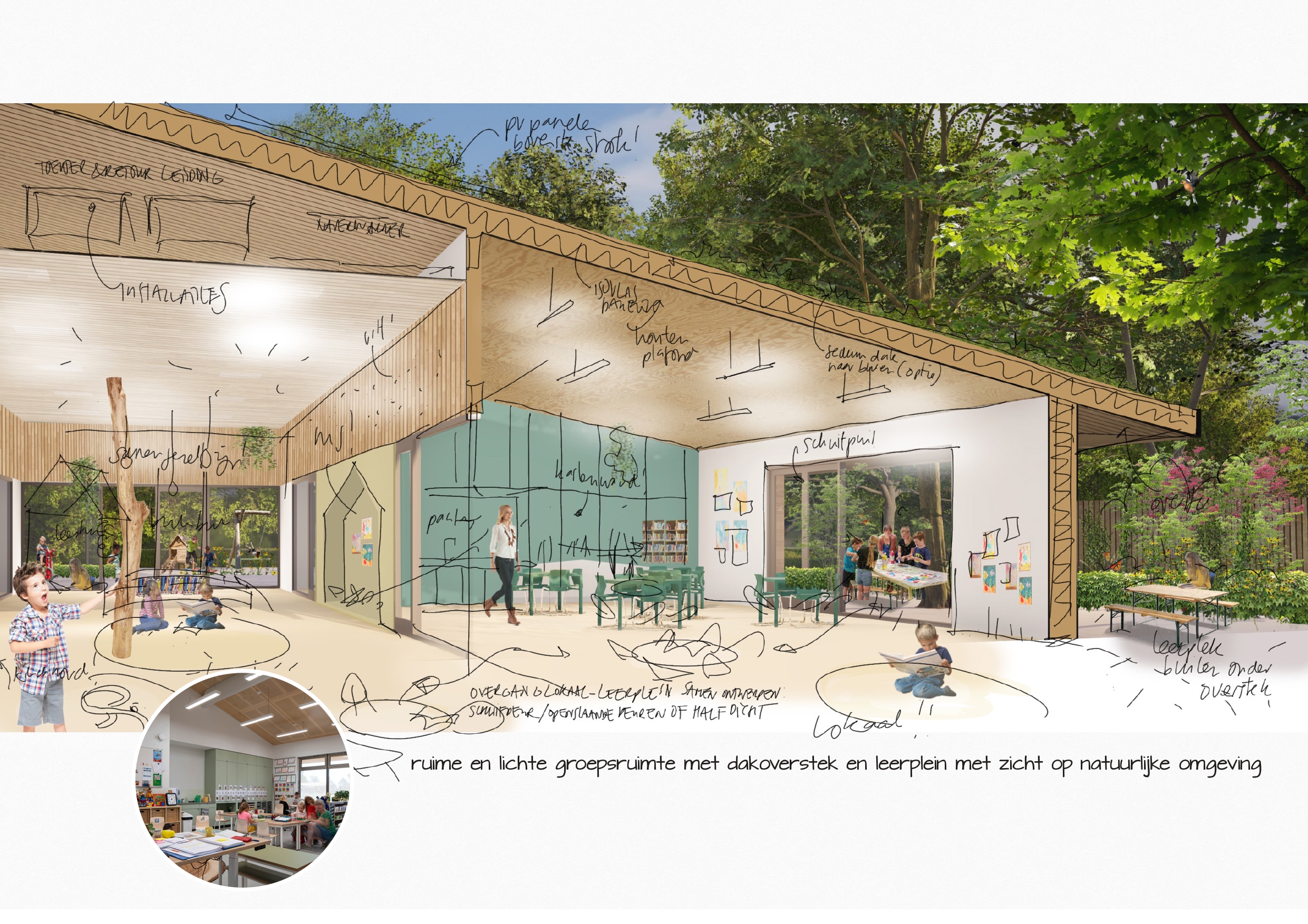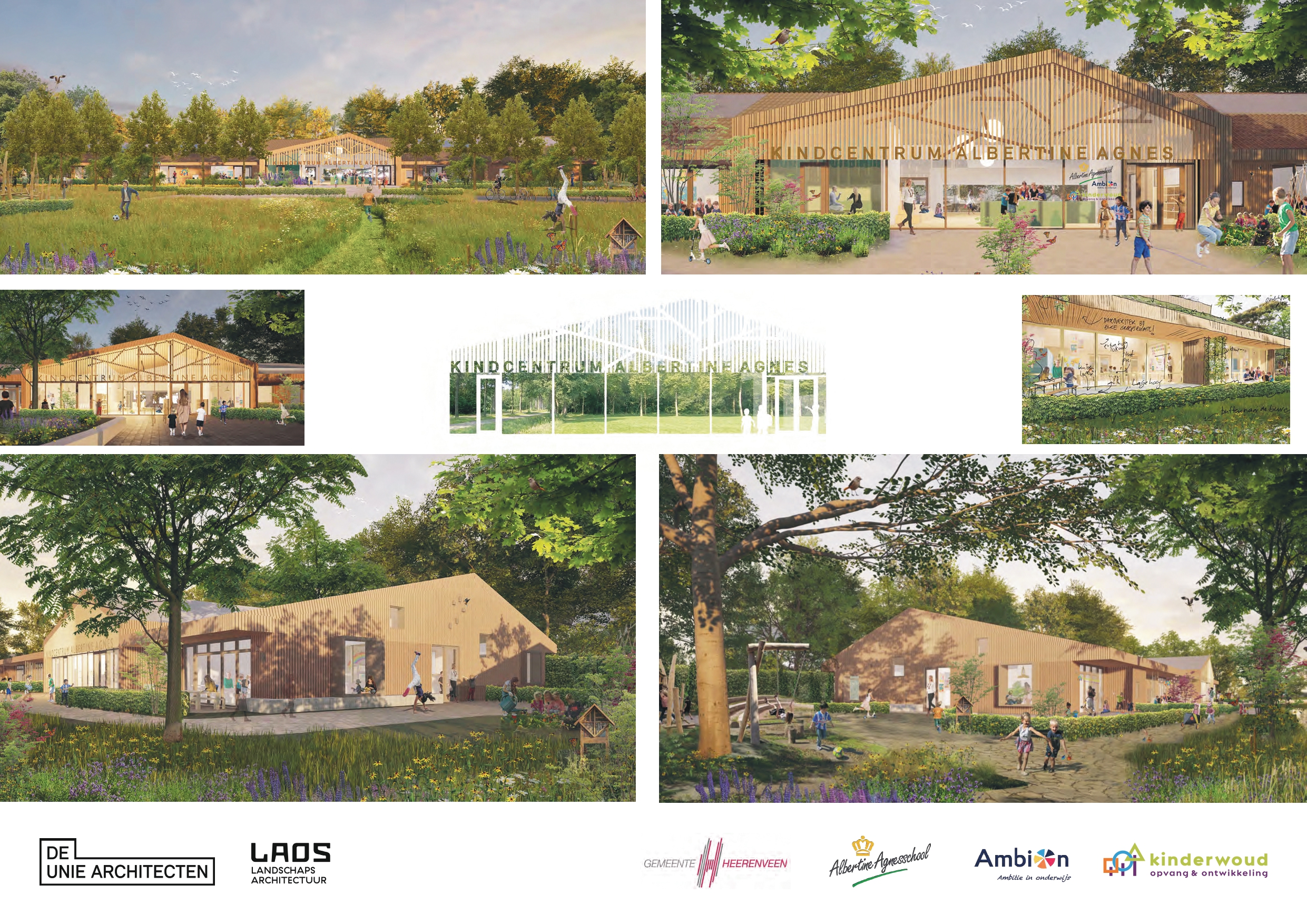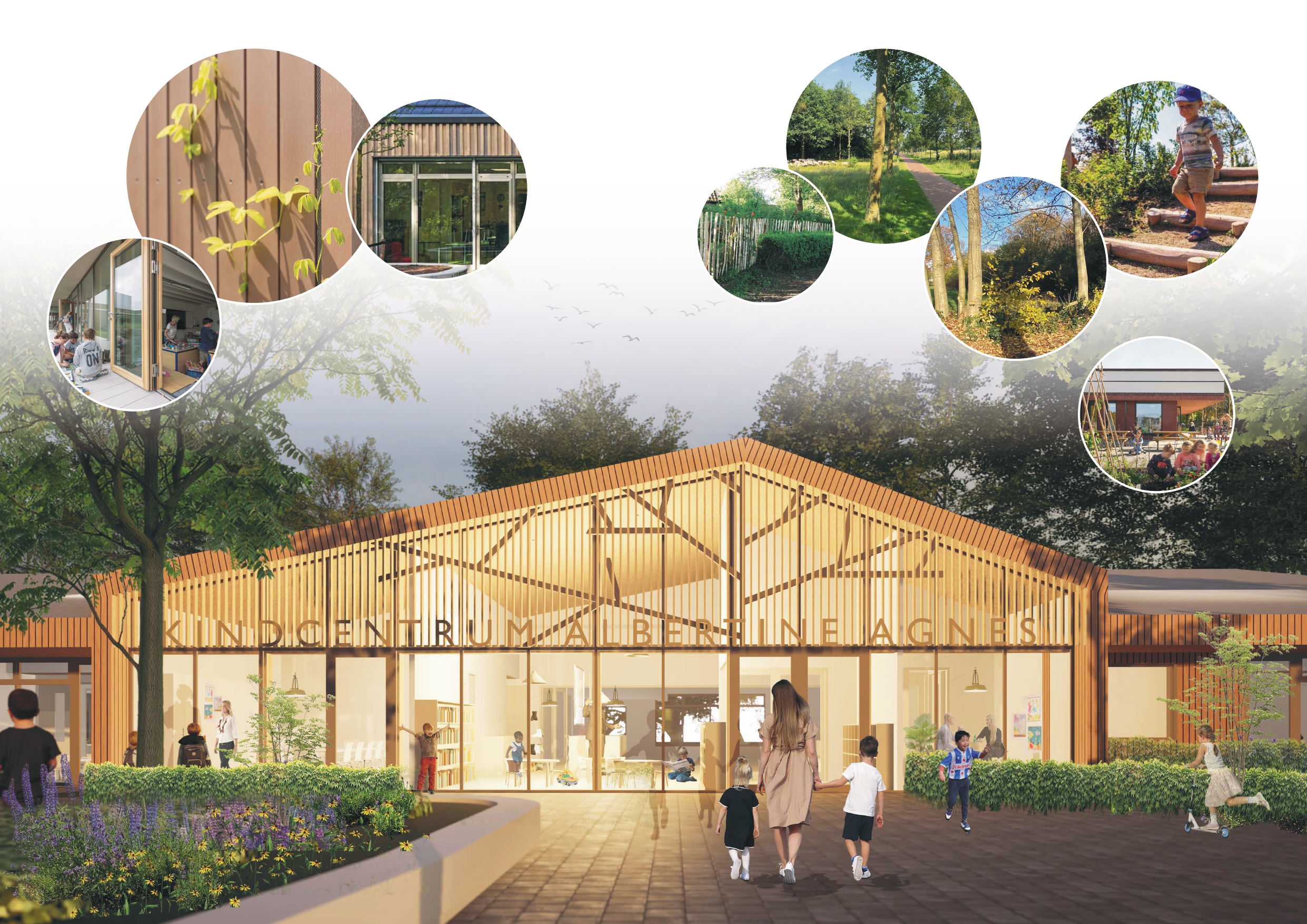The new Albertine Agnesschool will be a future-proof integrative child centre blended into the surrounding nature. It combines sustainability, innovation and community spirit. With an energy-neutral design, circular materials, green outdoor spaces and a focus on inclusion, the Albertine Agnesschool provides a healthy and inspiring environment for children to learn and develop in. It will be a vibrant hub for education and the local community, built with nature and the future in mind.