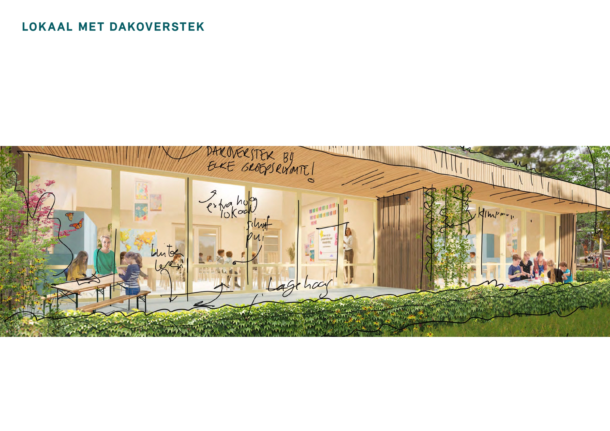 A key feature is the overhanging roof structures, which provide sheltered outdoor spaces for year-round outdoor education and play. This creates opportunities to extend the learning environment beyond the classroom. Also the central playground, with natural play equipment, encourages children to engage with nature and to actively learn about their environment.