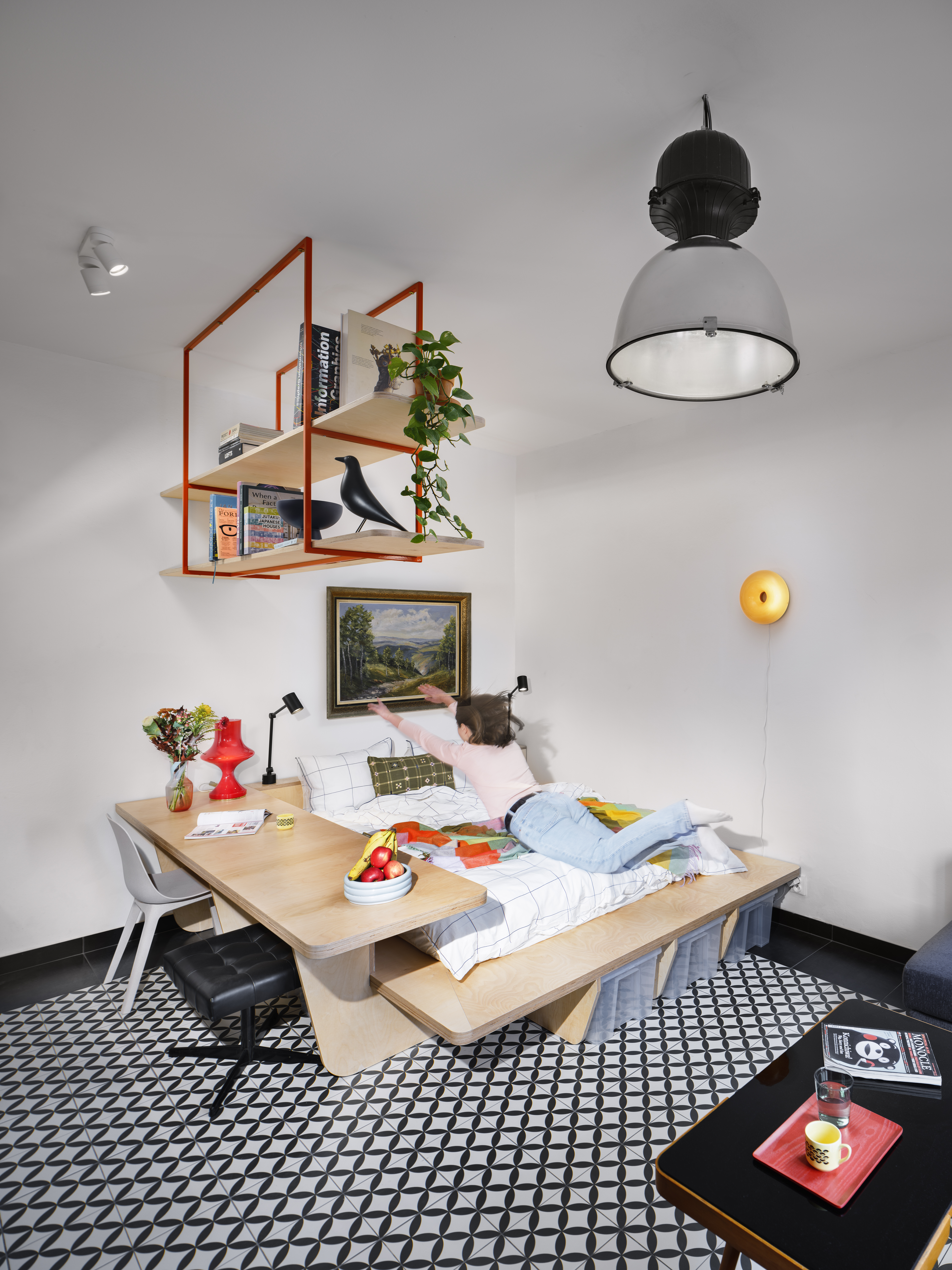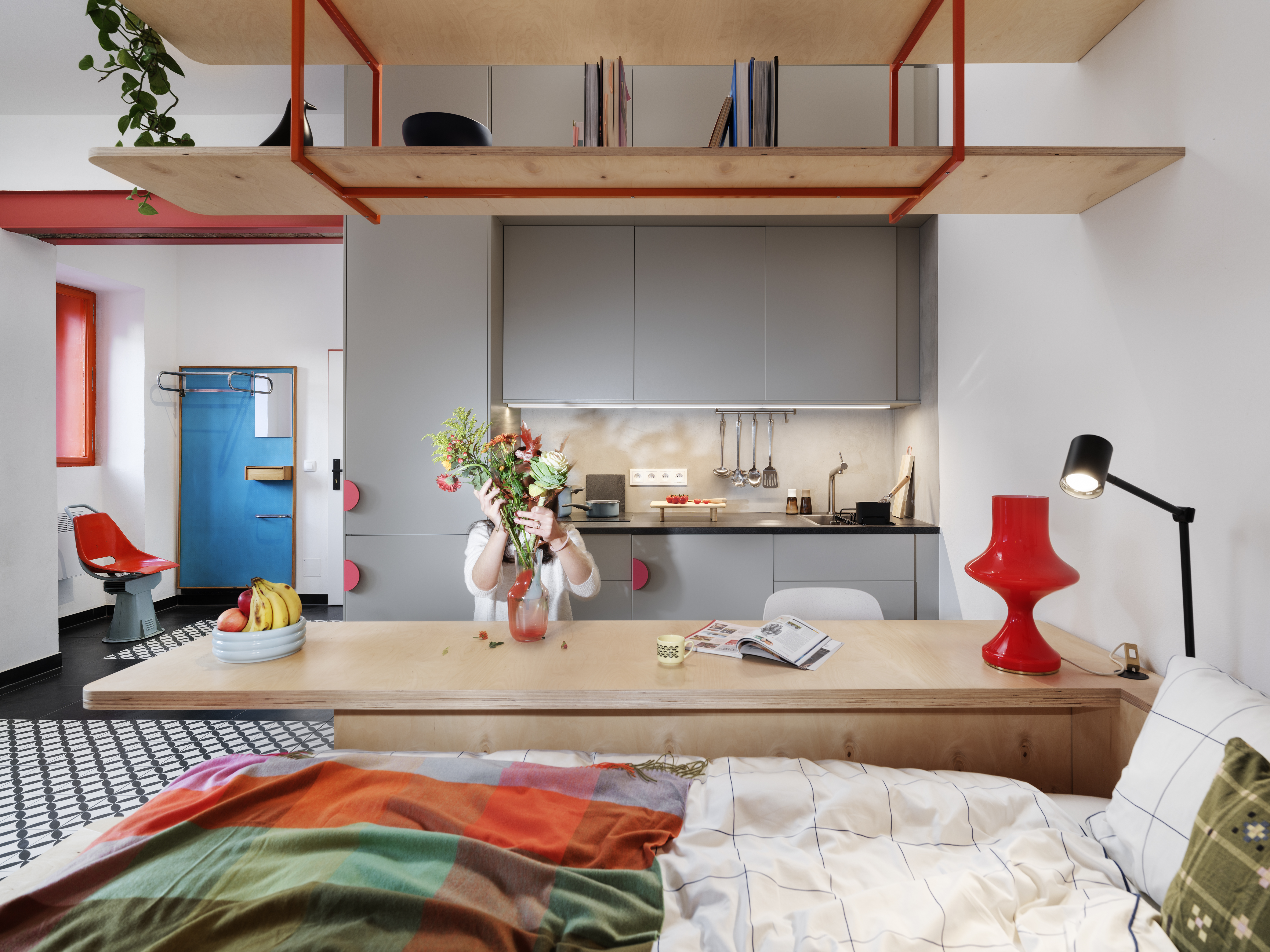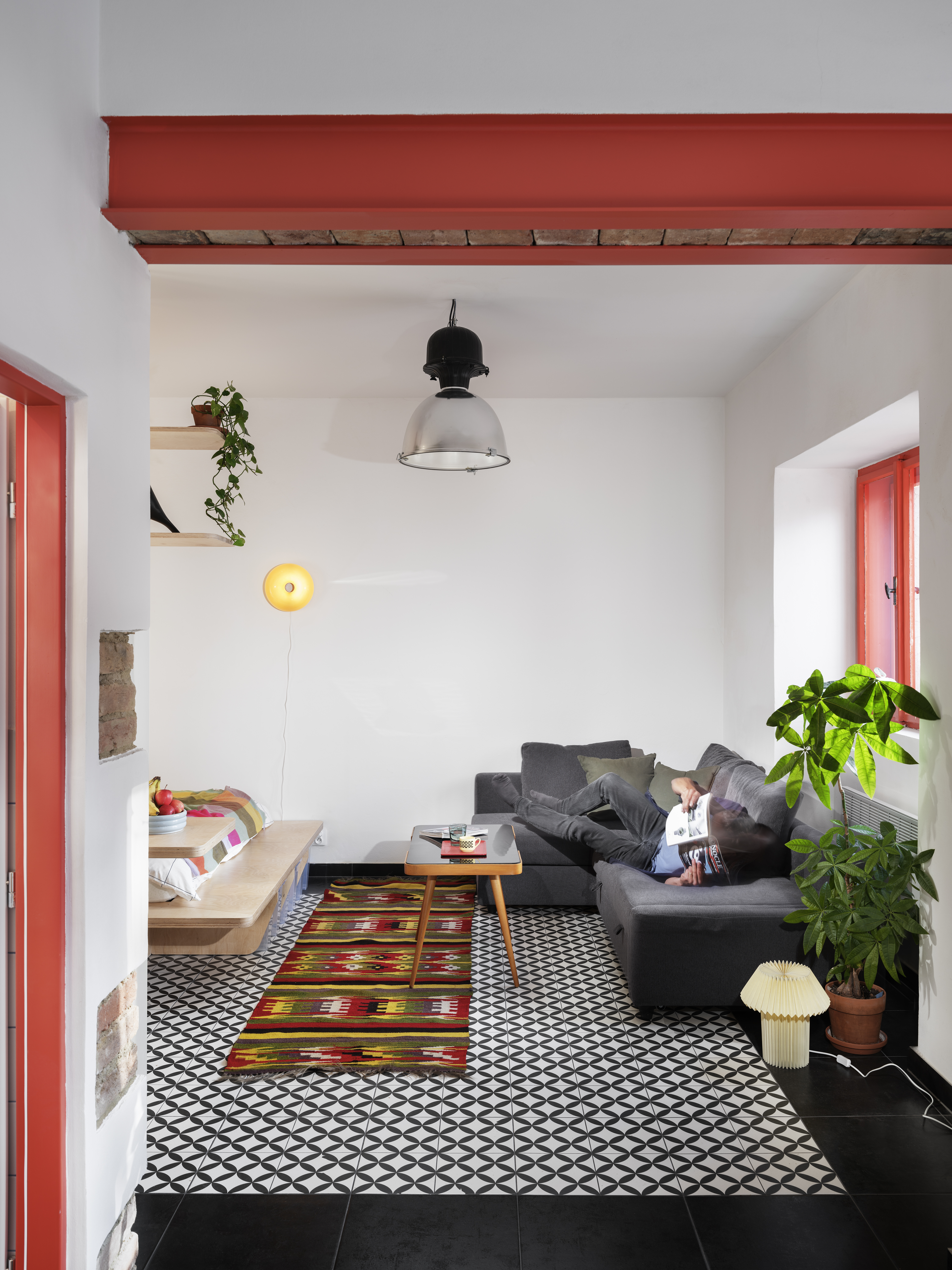 A key element of the project’s aesthetic identity is its use of vibrant accents and unexpected details. The bright red structural beams, window frames, and furniture highlights bring energy into the space, while the geometric floor tiles and layered textures add a sense of rhythm and movement. Custom plywood furniture, designed for maximum flexibility, contributes to a cohesive yet lively interior where every piece plays a role in shaping the experience.