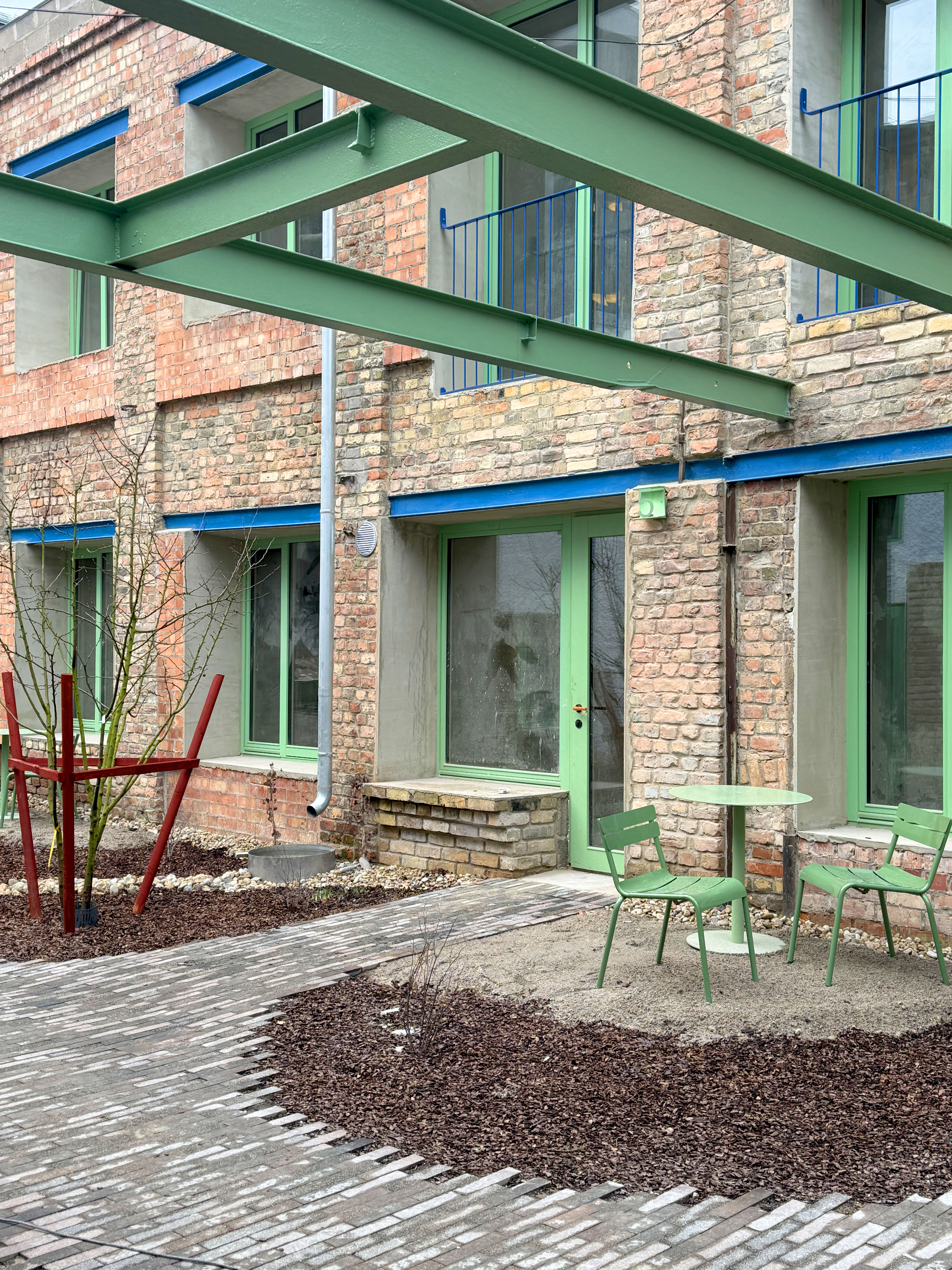 In line with the NEB key principles, the existing industrial buildings were not demolished but adapted to the residential function, with maximum efforts made to preserve all the materials on site. The new materials that were added as part of this adaptation are conceived in a similar manner: visibly introduced into the build heritage as yet another—contemporary—layer. The former industrial structures are reimagined in a contemporary architectural language, embracing the idea of adaptive reuse. At its core, this methodology aims to promote climate-neutral construction. In designing the redevelopment, we sought to preserve the authentic sense of place and openly reveal the building's history. Almost a century's worth of layers – reflecting different eras and residents – have been retained as an aesthetic asset, showcasing the story of how the development evolved into its current state. The bold yet meticulously thought-out and nuanced new additions lend the buildings a stylishly contemporary character. This ensures future residents will be encouraged to live sustainably and appreciate the adaptive approach.