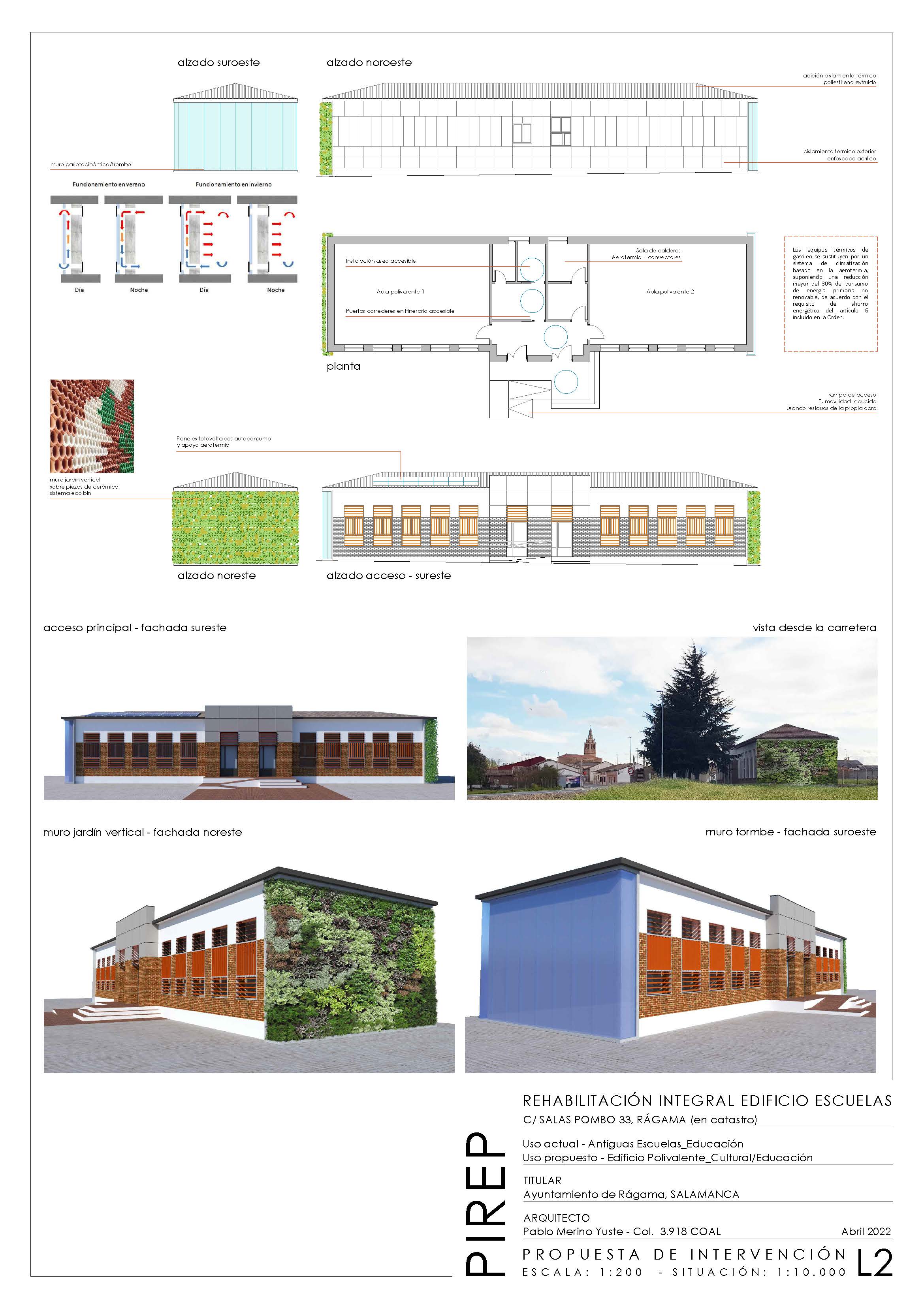 The project converts the old unused schools into a social center for the elderly population, where they can spend the day accompanied, have meals and activities in direct relationship with the rest of the population. All this in a building with almost zero consumption, which takes advantage of its orientation and location with exemplary and passive systems. In a second phase, a future building is planned for overnight stays of the same type of population.