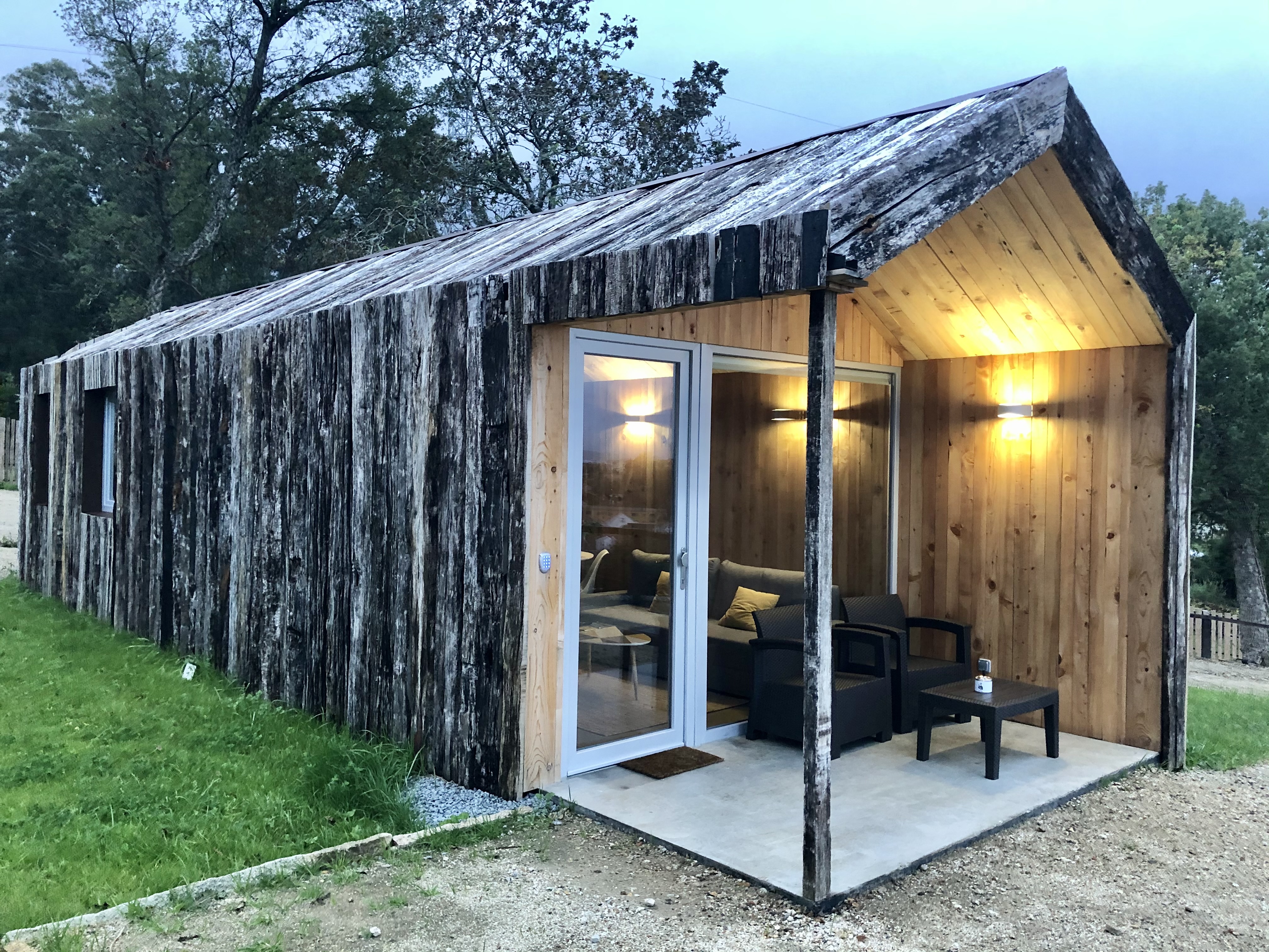 Eco-efficient cabins of our own design and construction made from recycled mussel raft wood after 25 years in the ocean, achieving the highest energy rating A, utilizing aerothermal energy, biomass and construction system