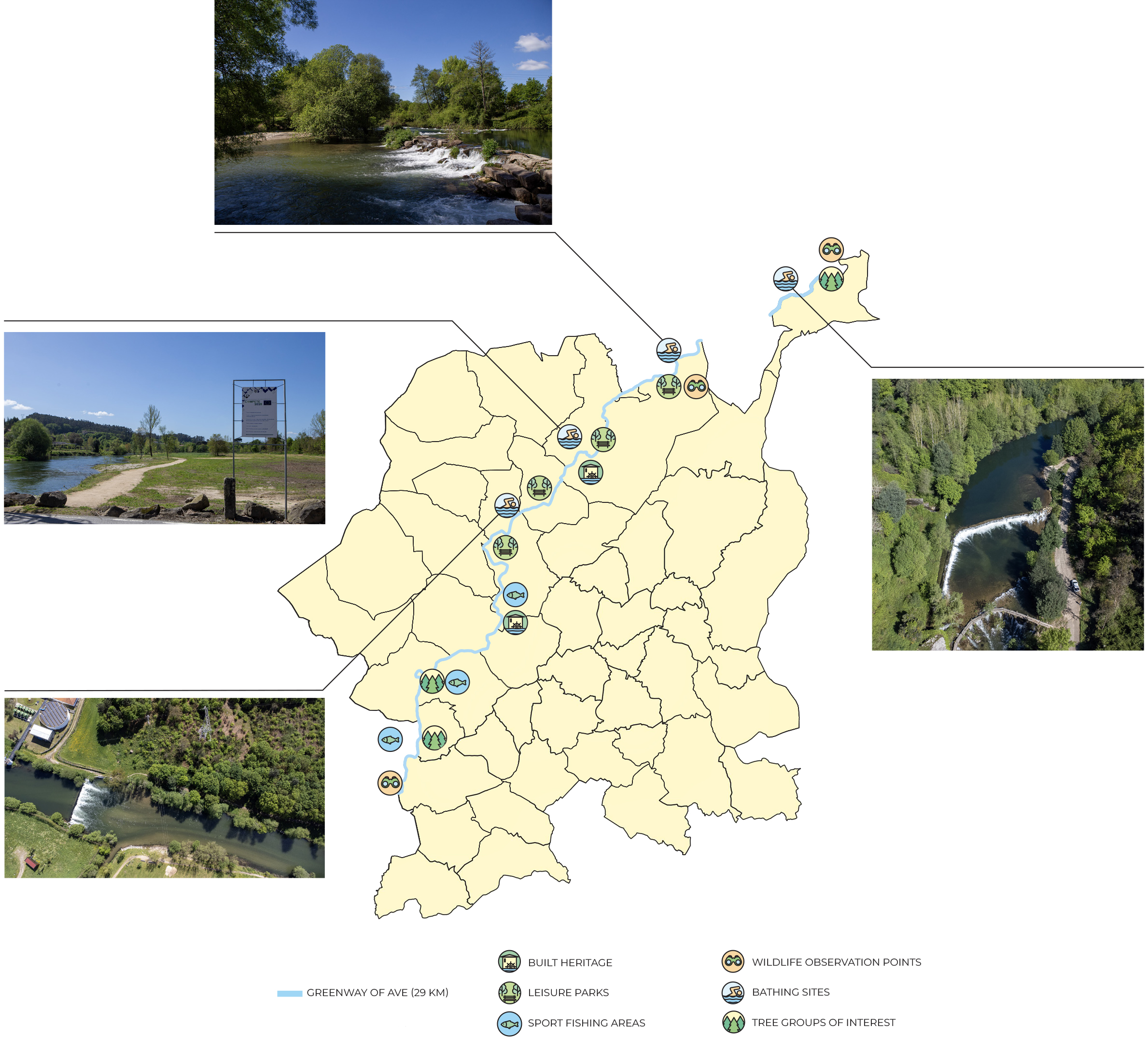 At the core of this initiative is the Ave River greenway, a 29 km continuous route that promotes sustainable mobility, environmental education, and recreation. Covering 14 parishes, it offers an immersive experience in biodiversity and incorporates Nature-based Solutions (NbS), such as riparian reforestation, which support biodiversity conservation and water management and can be replicated in other landscapes.