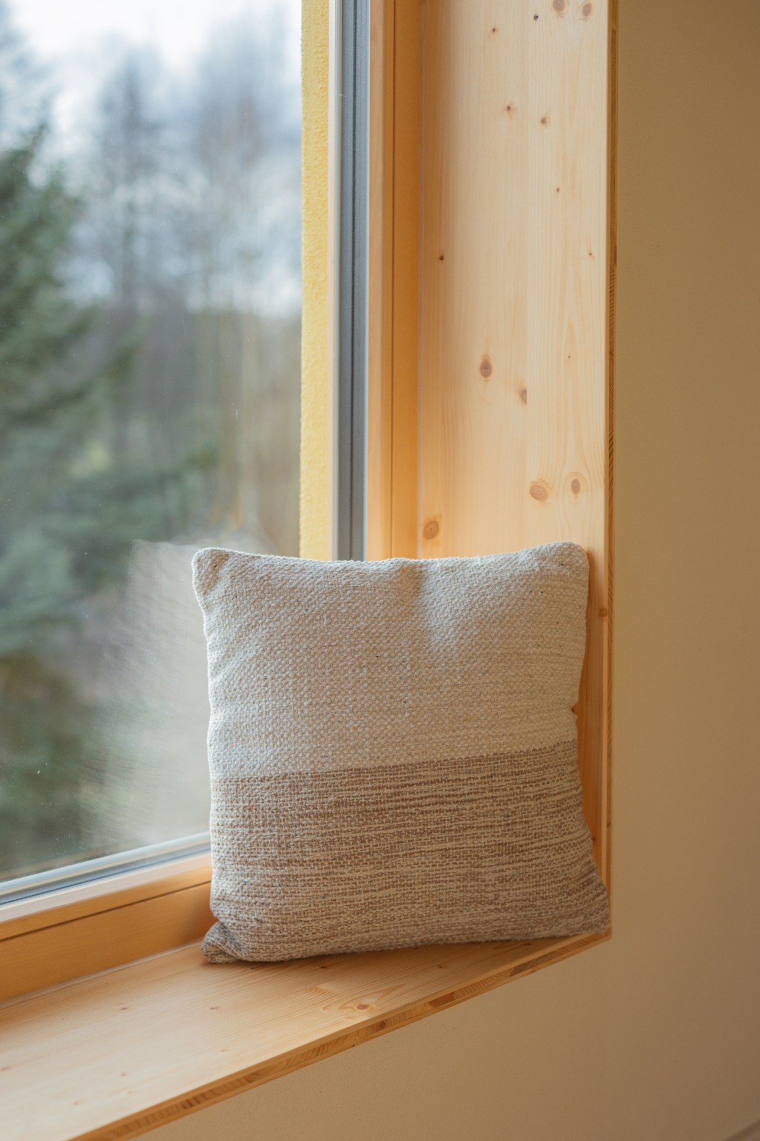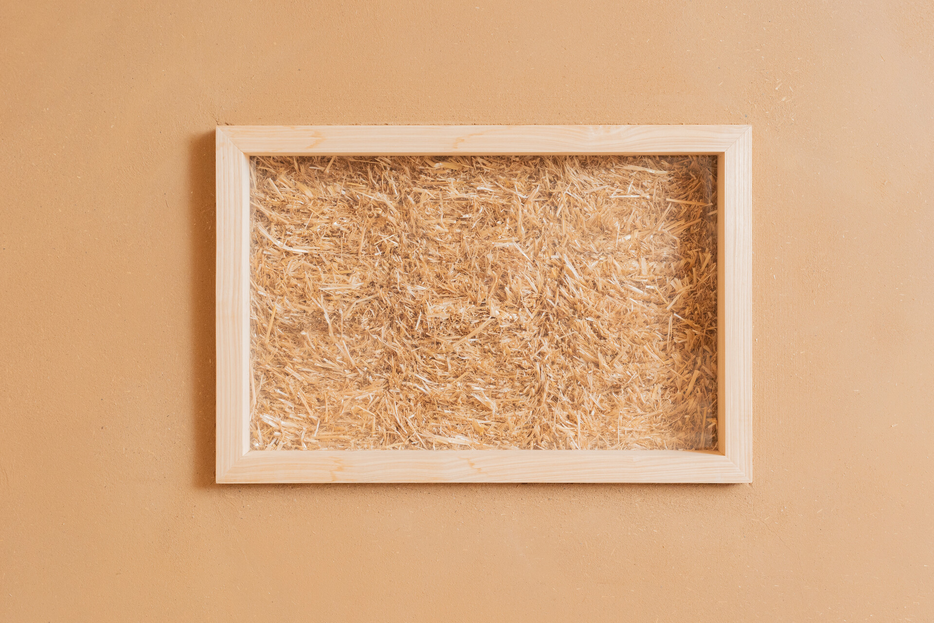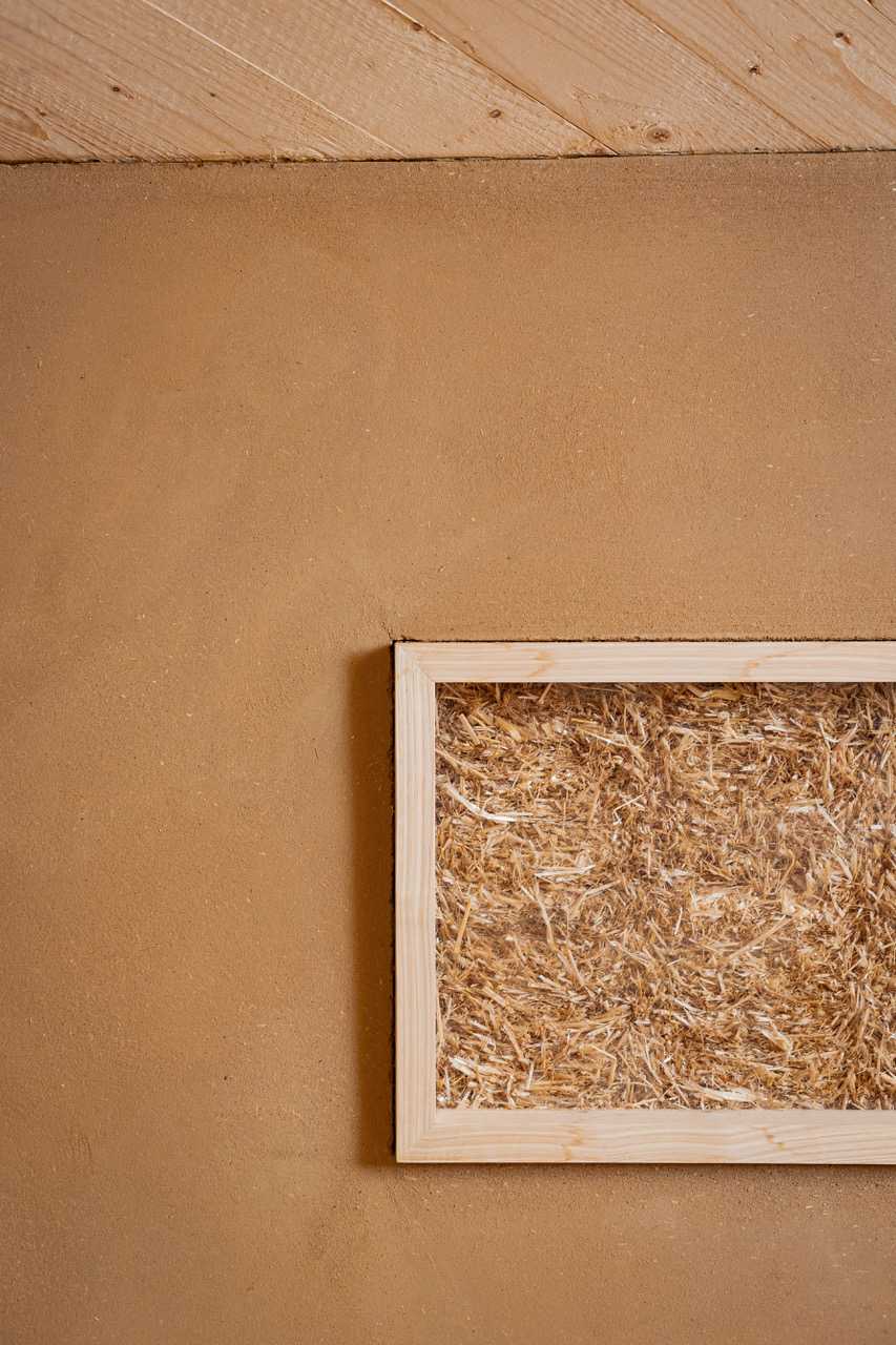Straw is a rapid renewable material, regenerating in only 1 year, it is the main material, with 80 m³ used, storing 10 tonnes of CO2 in the project. Straw bales were pressed into wall, floor, and roof elements during prefabrication and fixed without any connections. The straw remains untreated, protected by lime plaster outside and clay plaster inside, which can be recycled separately. The nylon of the straw bale was removed and used for stool production.