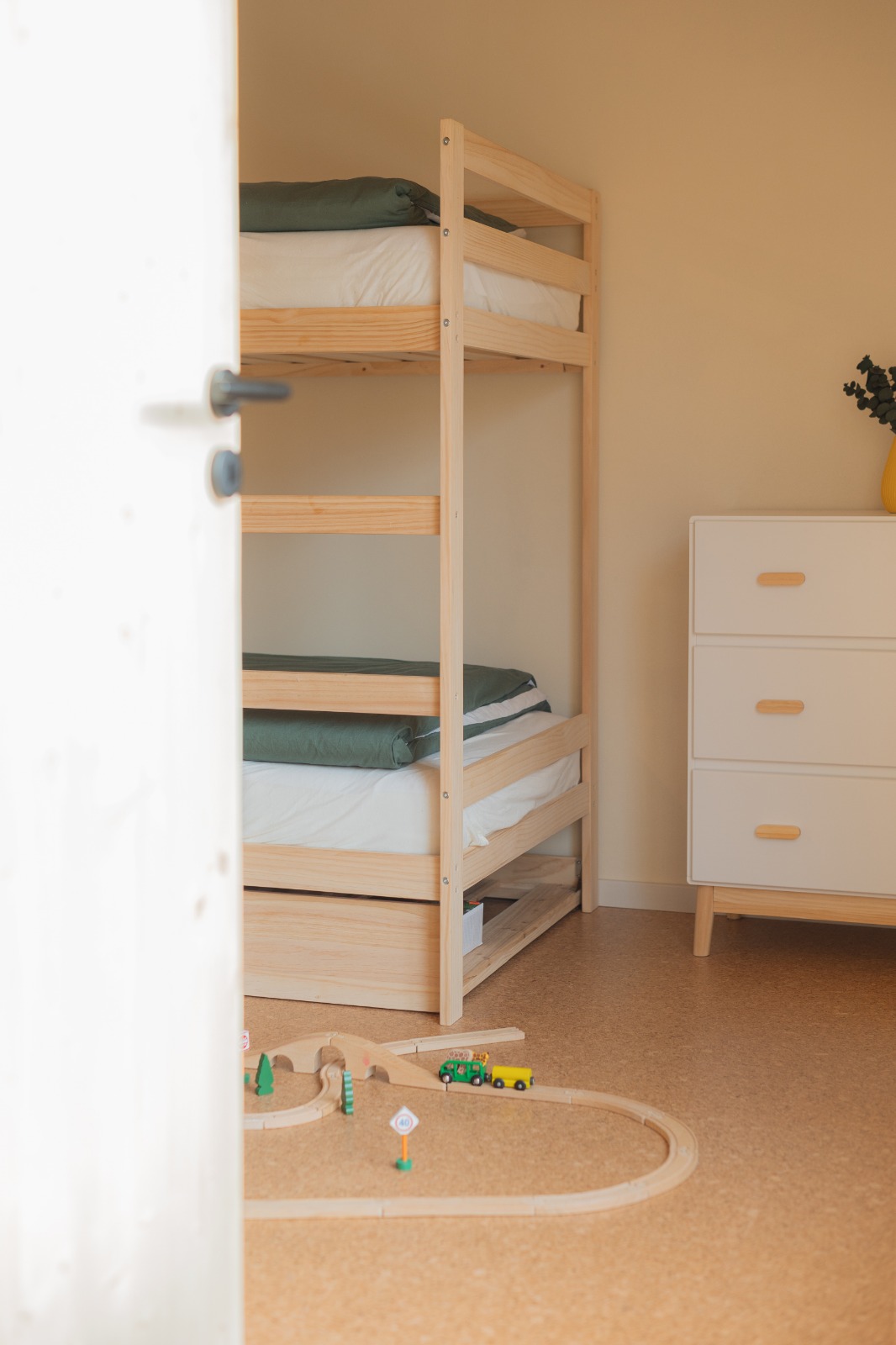 Large windows with seating areas, suitable for both children and adults, encourage looking out into the distance, which benefits health. Ample daylight floods the living spaces, making the relatively small rooms feel open and generous.
