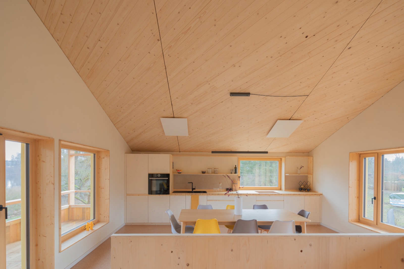 Through technical interpolations involving all disciplines: architects, builders, structural engineers, geologists, ecologists and energy consultants, measured results, goals, and impacts were discussed, and solutions were developed collaboratively. This process led to the building shape, the roof design with shading elements and the innovative layout, with the kitchen and living areas placed upstairs and the sleeping areas downstairs. Views and sightlines were considered alongside temperature, indoor climate, material efficiency, and energy consumption.