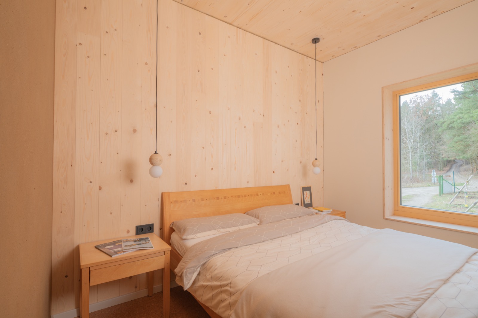 NOW Lindow aims to create an aesthetic of simplicity and honesty that fosters a natural sense of comfort. This is reflected in elements such as the exposed ceiling, the wood of the load-bearing interior walls, a window revealing the straw components, and the visible clay wall surfaces. The tactile quality of the materials invites touch and exploration, from the textured clay with embedded straw to the knots in the wood and soft wooden reveals finished only with linseed oil.
