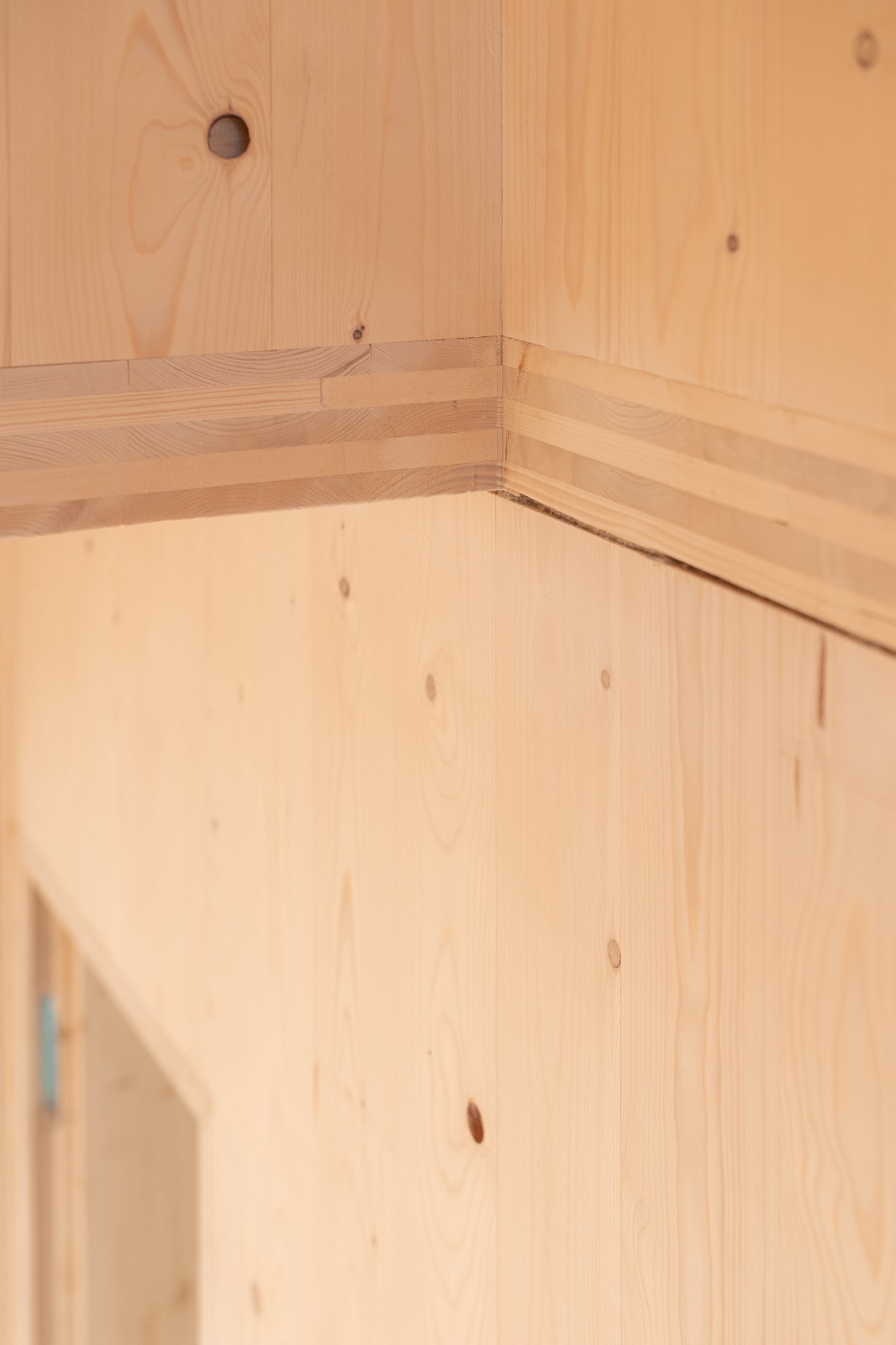 Several measures in material selection and component construction were taken to achieve economic goals. For example, the 150 m² wooden ceilings were left raw, without creating unnecessary layers. Wires were hidden with a thorough planning and in-between building joints. The visible quality of the CLT wood was deliberately chosen as “non-visible quality” or use simple wood-planks for the roof to use material-efficient and economical products that only have optical irregularities.