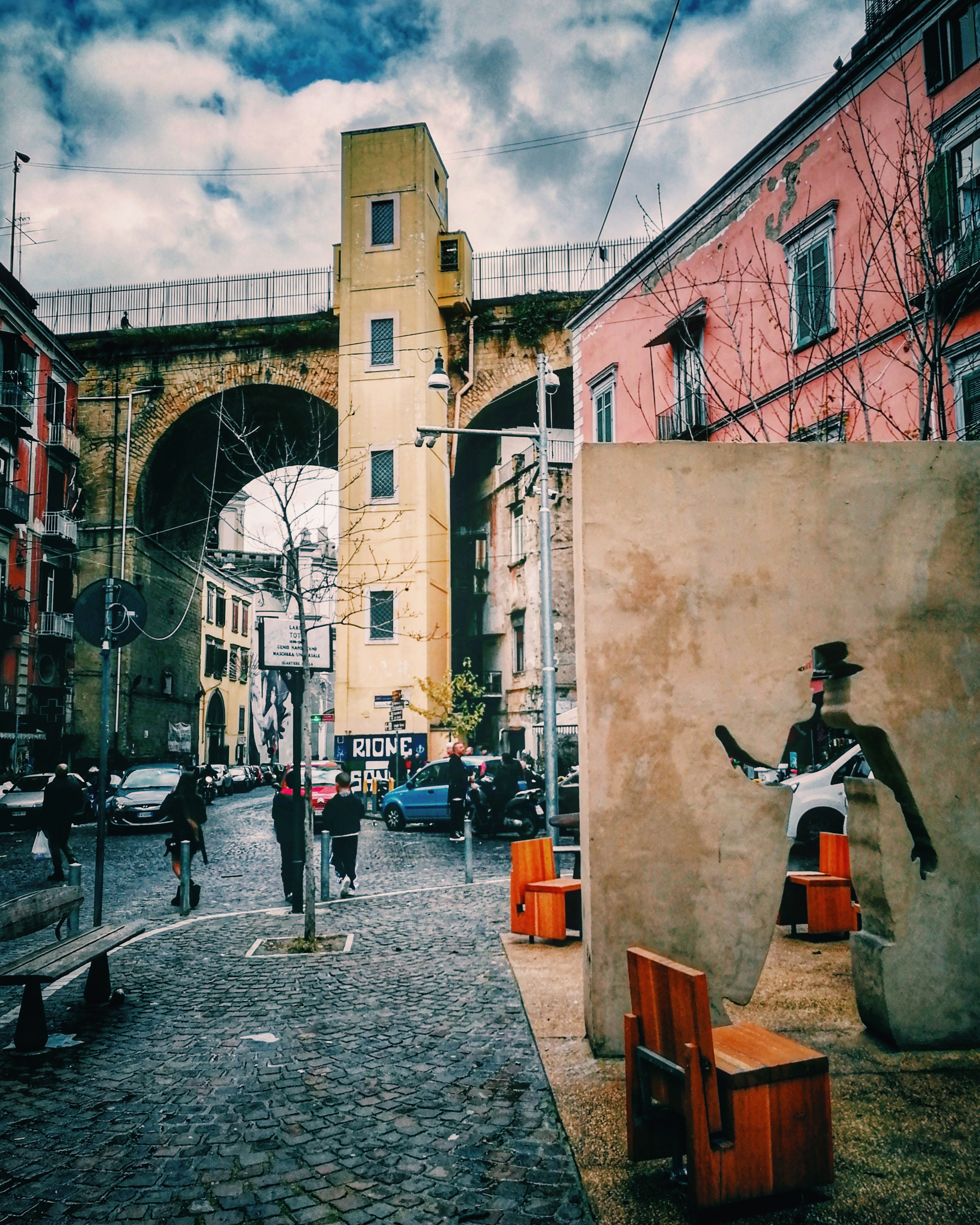 In 2019 the international artist Jago decided to donate his sculpture named “Il Figlio Velato” to the neighbourood and its citizens. During the quarantine, in 2020, Jago decided to establish his laboratory in the Rione, in one of the Rione Sanità's churches, S. Aspreno ai Crociferi (it began “Jago Museum” from 2022) This 17th century church has been finally reopened after more than 40 years. The artist created two other works inspired by the events of the neighbourhood, which had a huge international echo and attracted tourists from all over the world: “Look down” and "La Pietà”.