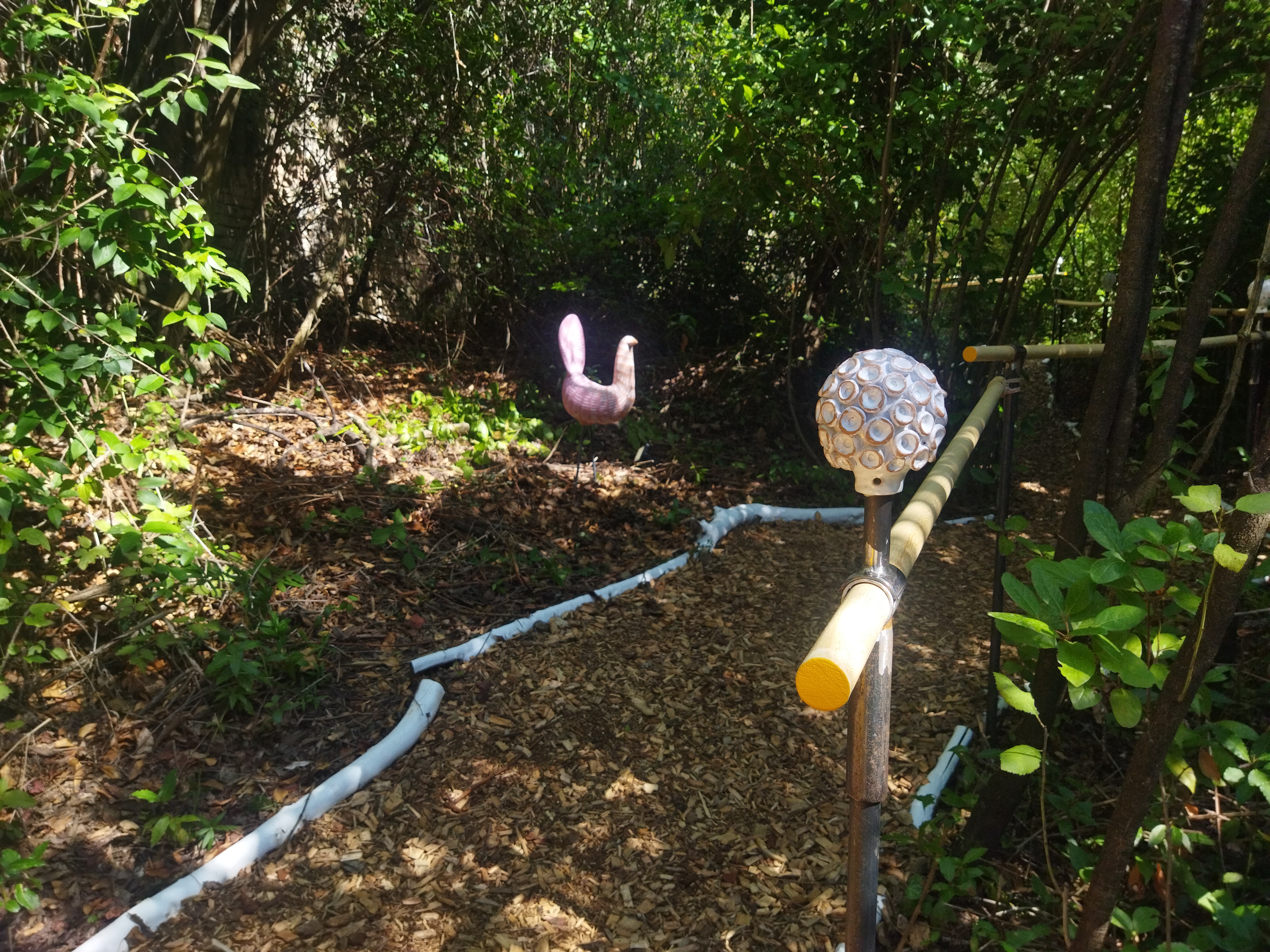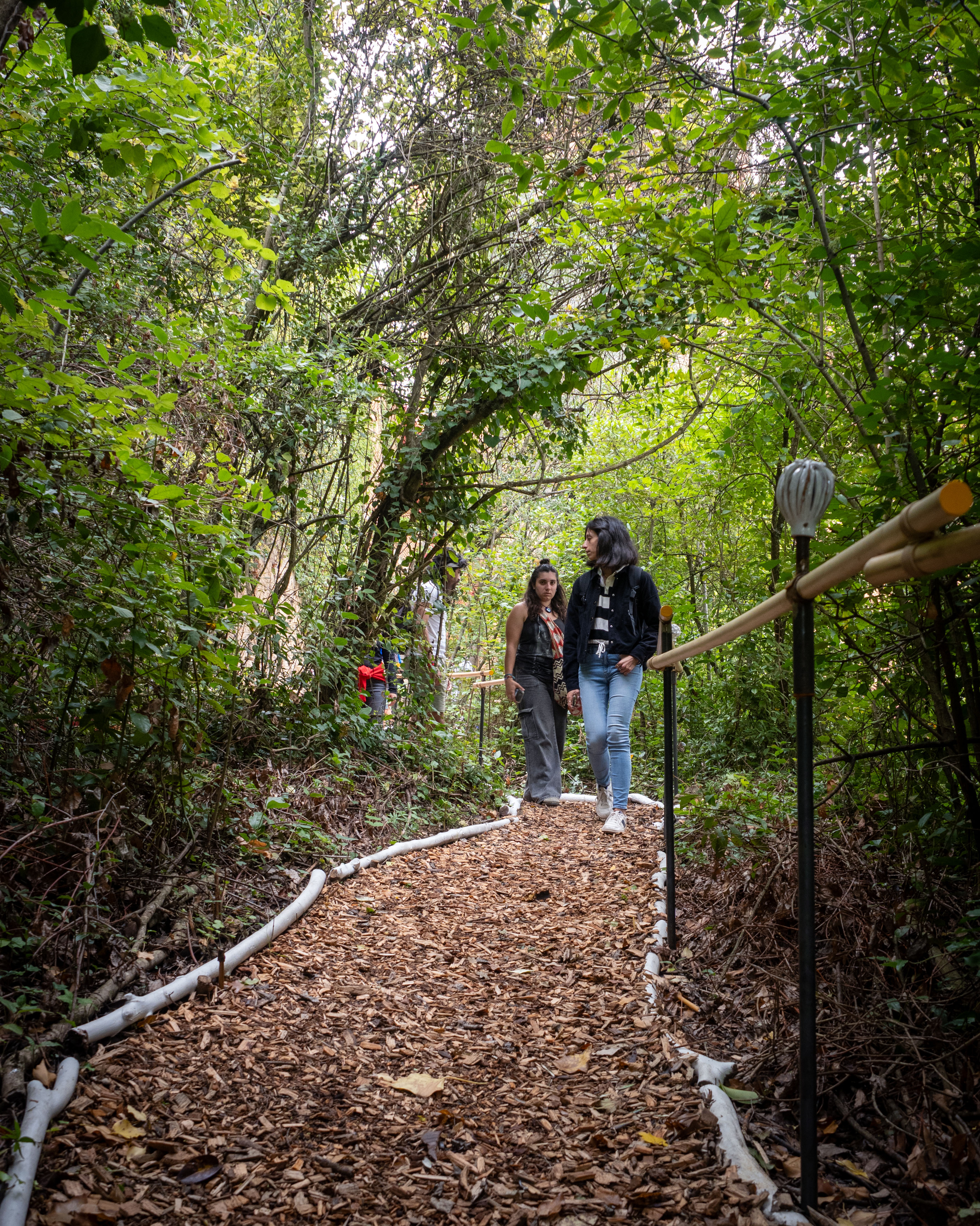 The design and implementation process of the project was carried out by an interdisciplinary team in a collaborative way. Permaculture experts handled the first part of the projects which consisted of observation and study of the previously abandoned semi-forested area, which resulted in the design of a trail based on the morphology of the terrain, the condition of the existing vegetation and the characteristics of the soil, and which harmoniously follows the natural lines of the forest. Subsequently, team members with architectural expertise identified further areas alongside the pathway, which were shaped accordingly, to facilitate personal or group stay and activities, to house art installations and to promote the connection both with the medieval walls and the natural environment itself. A collaborative process among permacultural and architectural designers gave shape to the general design direction and continued throughout the more concentrated design and implementation phase, during which an intergenerational team of architects worked in detail on all the individual interventions. At the same time, accessible design principles were also central, as with the direct involvement of deaf-blind experts who co-developed the elements that emphasize Deaf inclusion and culture. The added value from this interdisciplinary collaboration was that the design solutions that were implemented derived from a very meaningful dialogical process where a fine balance had to be found between the different focus of each field of knowledge. This parallel process was handled by another small team with expertise on cultural management, architecture, social practice and art, in order for the general role that the garden would serve to be guaranteed. Meanwhile, the craft skills of the carpenters and blacksmiths that were involved in the construction of individual pieces were also taken into account, together with the more artistic approach of the ceramist that created the tactile path.