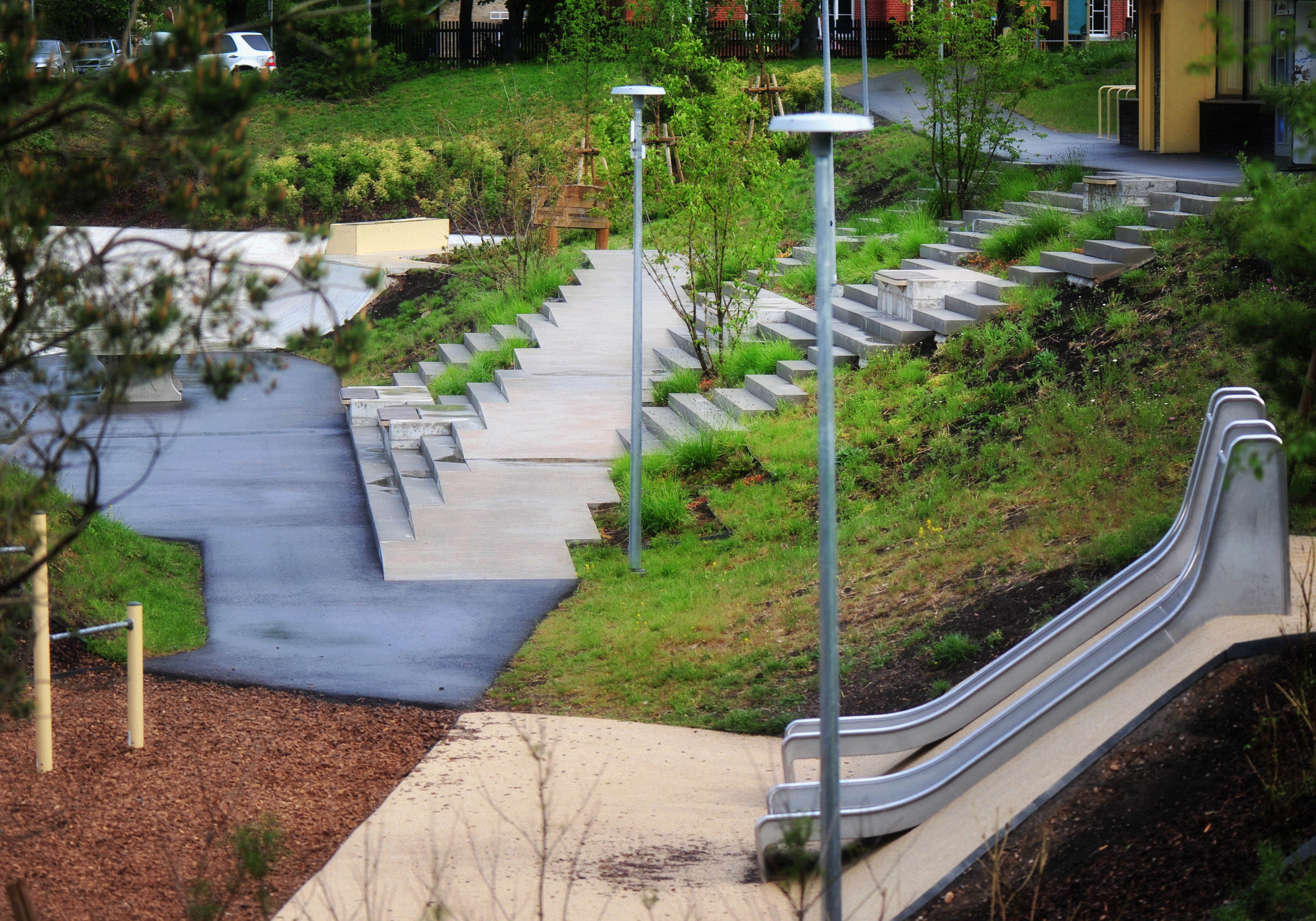 - The adaptive use of existing playground structures, relocated and refurbished elsewhere in the city, follows circular economy principles.