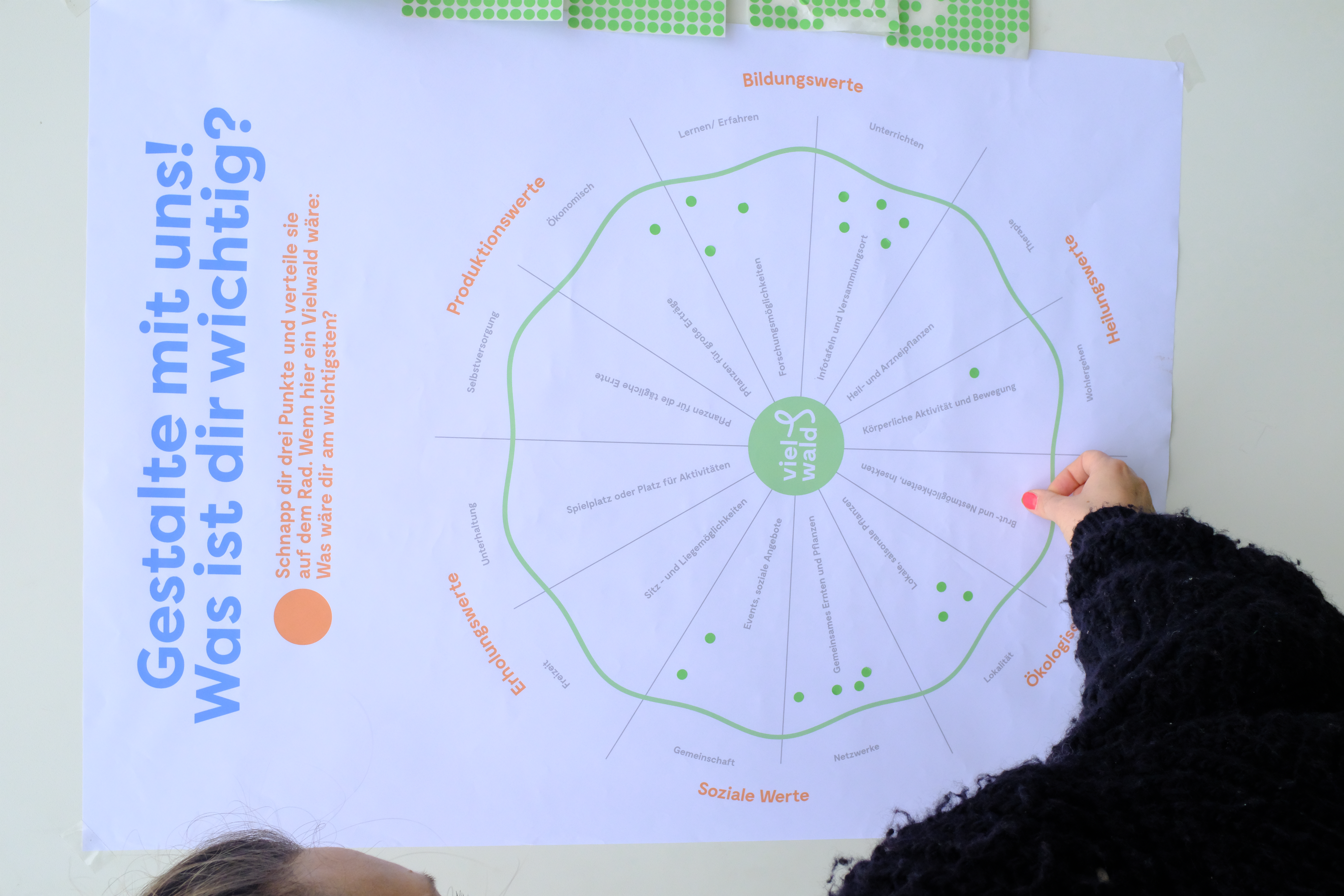 The design school and the space of the Vielwald are both located in the Sudstadt, an area of Cologne populated by many generations, backgrounds and origins. During our field research, we observed that green spaces are already used as a social space: dog walking areas, playgrounds for kids or exercise spots for adults. Because the forest garden will be grown in this public space, the current users of the site are invited from the beginning to co-design the space with us, as part of the decision-making. For example, our value wheels are currently on site for users to decide on the types of plants they would like to grow.
