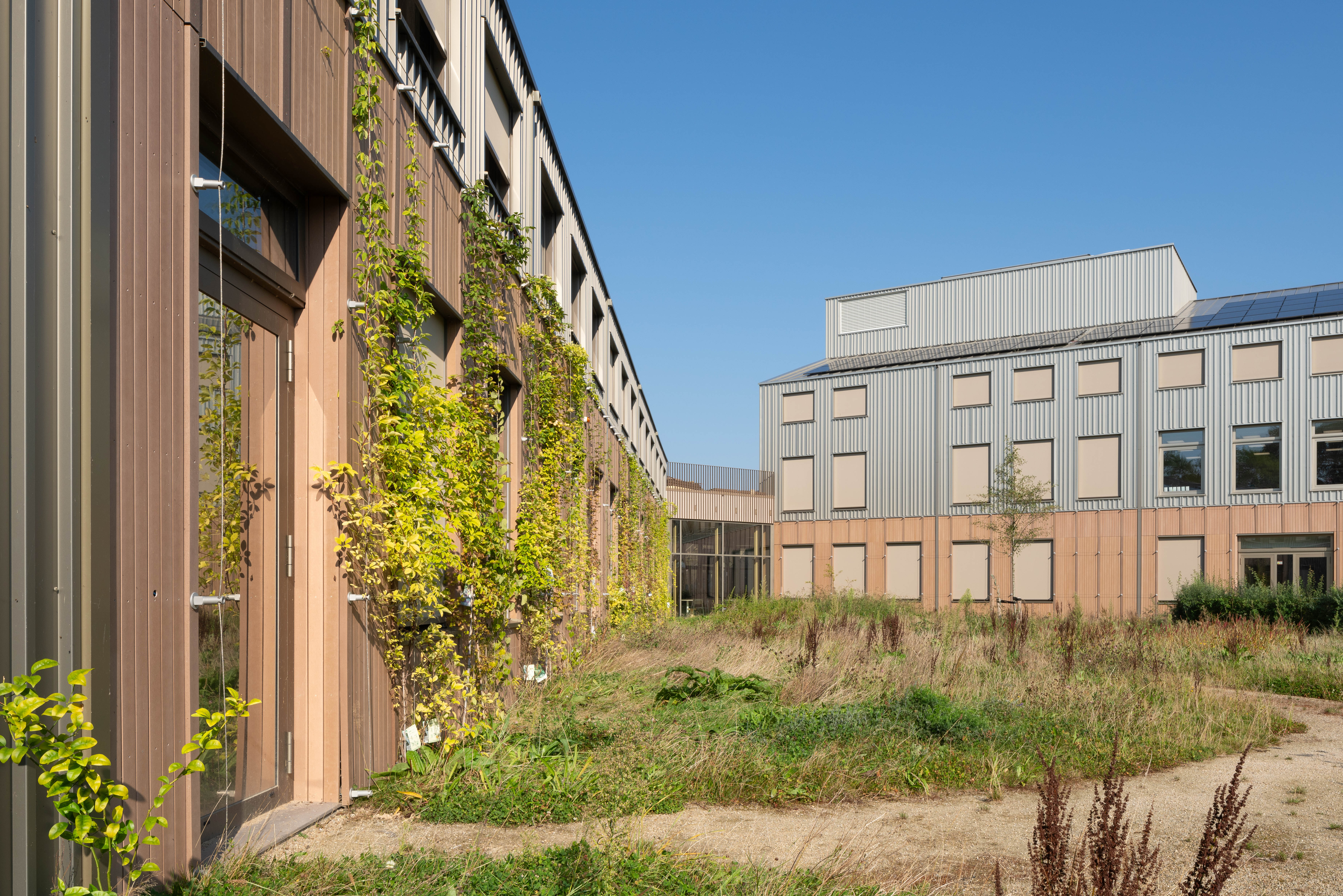 The development provides valuable ecosystem services. Nature-Based Solutions were implemented and integrated in the entire area. A water pond collects and buffers all rainwater from the building, helping to prevent flooding while also offering natural cooling during high summer temperatures. Additionally, the diverse landscape creates a rich environment that strengthens local biodiversity, making the campus a sustainable and vibrant place for both education and nature.