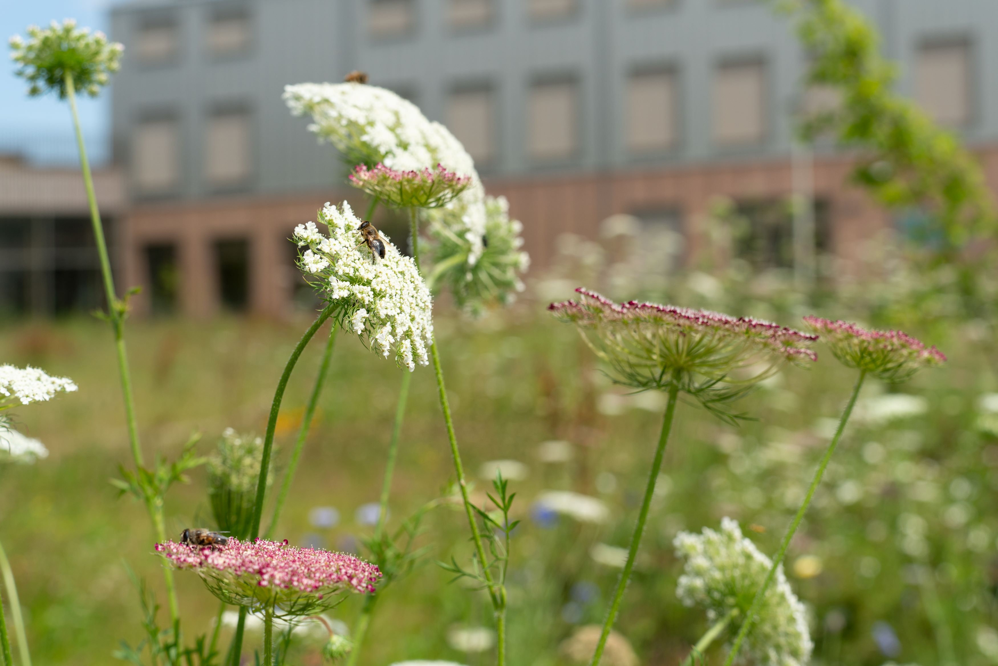 In addition to the sustainable construction and social sustainability, the landscape provides valuable ecosystem services. Nature-Based Solutions were implemented and integrated in the entire area. A water pond collects and buffers all rainwater from the building, helping to prevent flooding while also offering natural cooling during high summer temperatures. This feature does not only enhances climate resilience, it also serves as an attractive resting spot for students. Additionally, the diverse landscape creates a rich environment that strengthens local biodiversity, making the campus a sustainable and vibrant place for both education and nature.