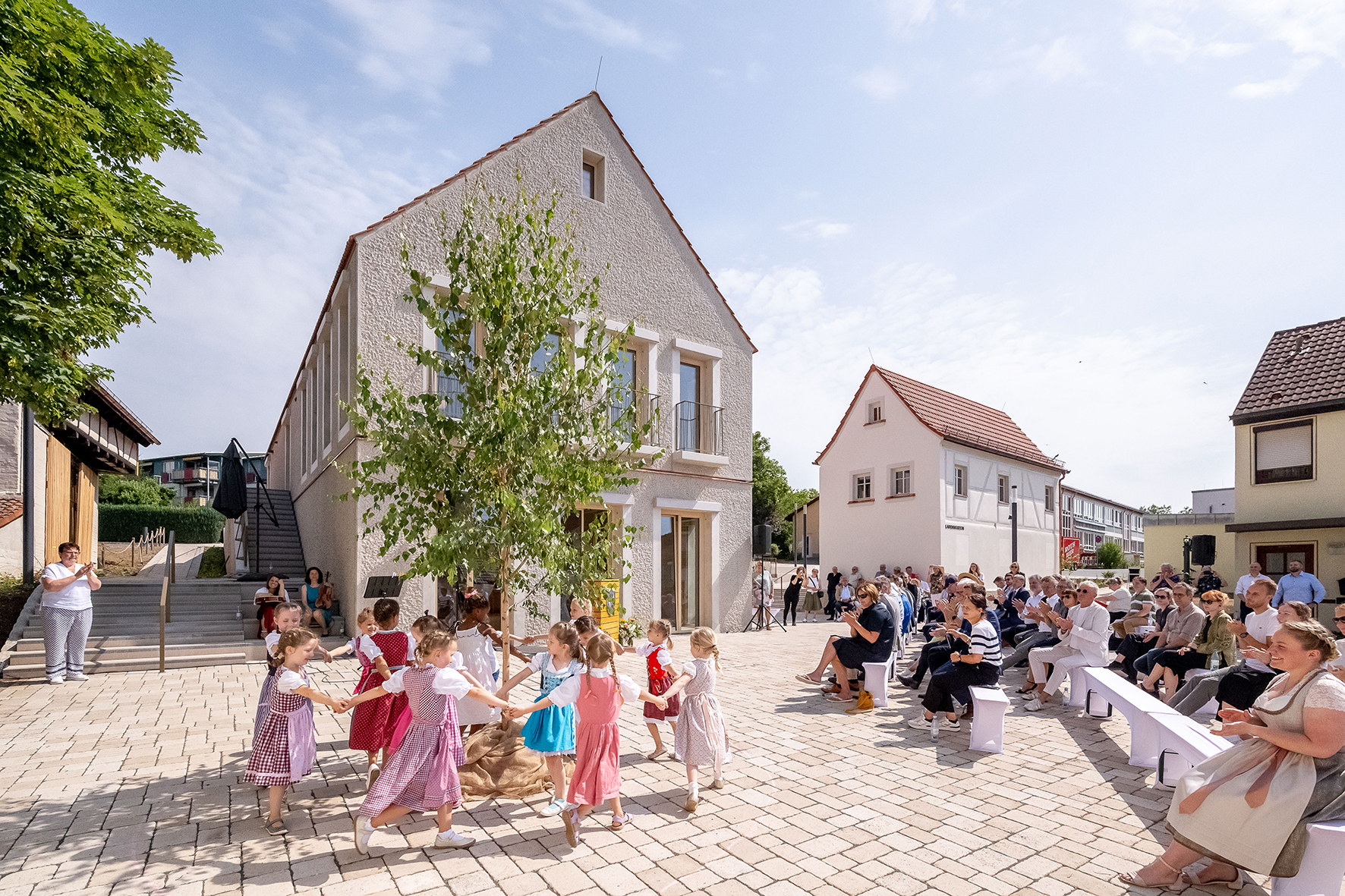 Together: In a participatory process, needs and wishes of the citizens were determined and the utilisation concept was jointly developed, with meeting places, a café, a village square for markets and traditional Bavarian dances as well as an outdoor ‘theatrum’ for the library. The municipality then purposefully purchased or exchanged the required properties for other vacant properties in the village or for barrier-free apartments in the nearby retirement home. After many years of engagement by the community, the implementation of the sustainable usage concept began, with the aim of counteracting the ‘extinction’ of the old centre.