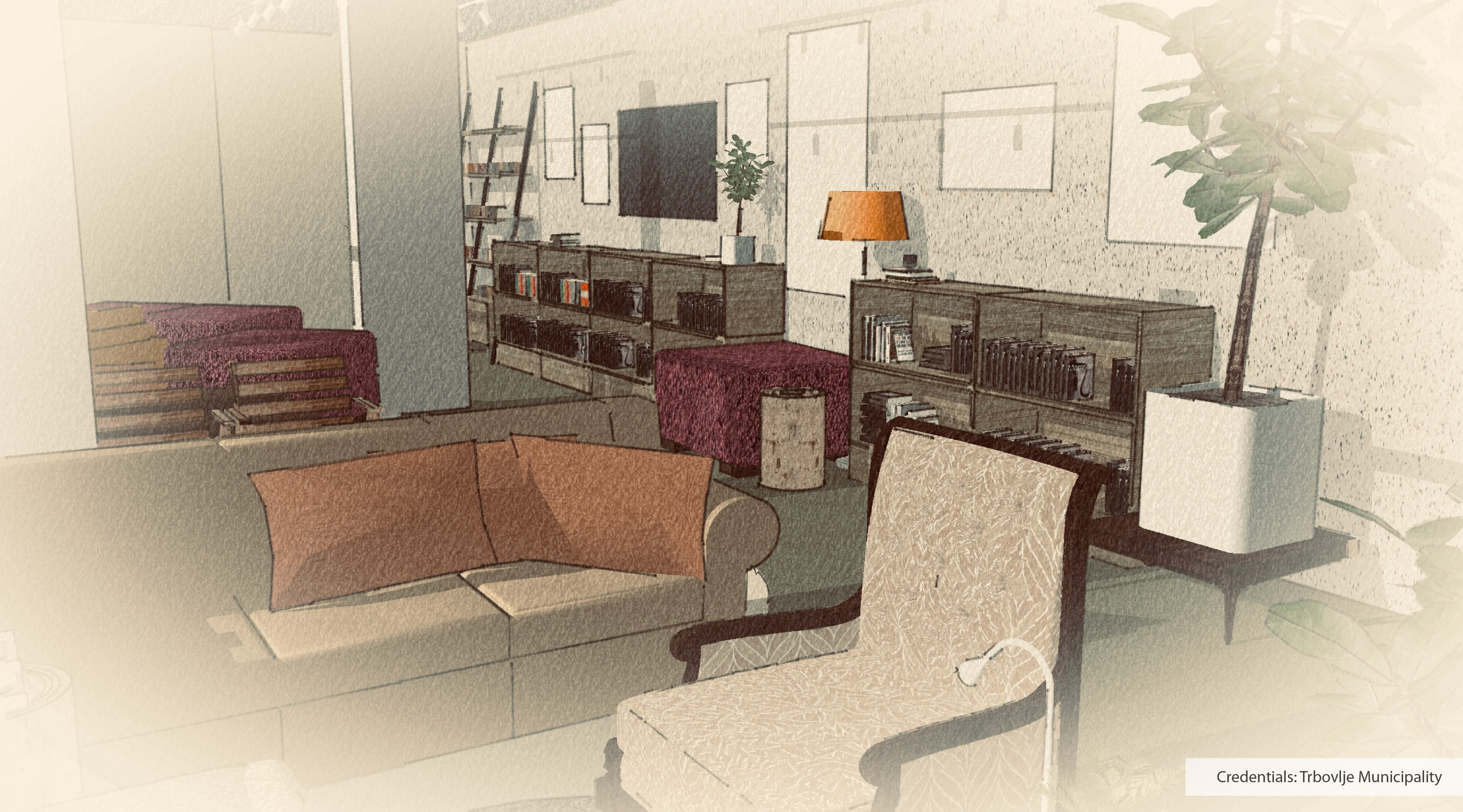 "The Healthy Public Living Room is a pioneering public space concept in Trbovlje, redefining urban renewal through inclusivity, sustainability and biophilic design. Named ""Living Room"", it embodies comfort, accessibility, and social engagement while demonstrating the benefits of non-toxic, biobased materials. Situated within the Library, the project transforms an underutilized commercial space into a vibrant hub for learning, relaxation and interaction.