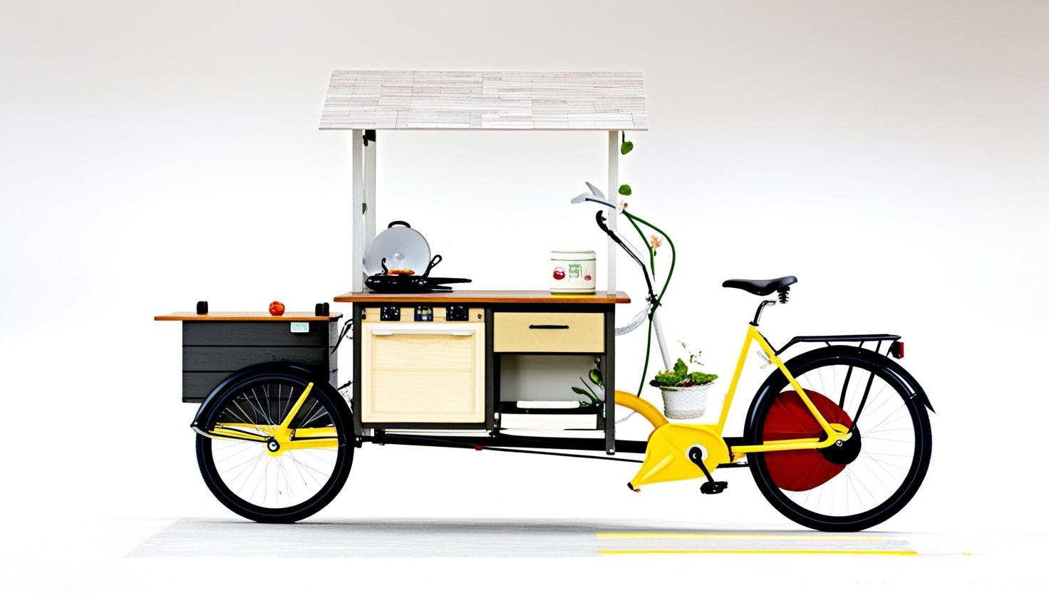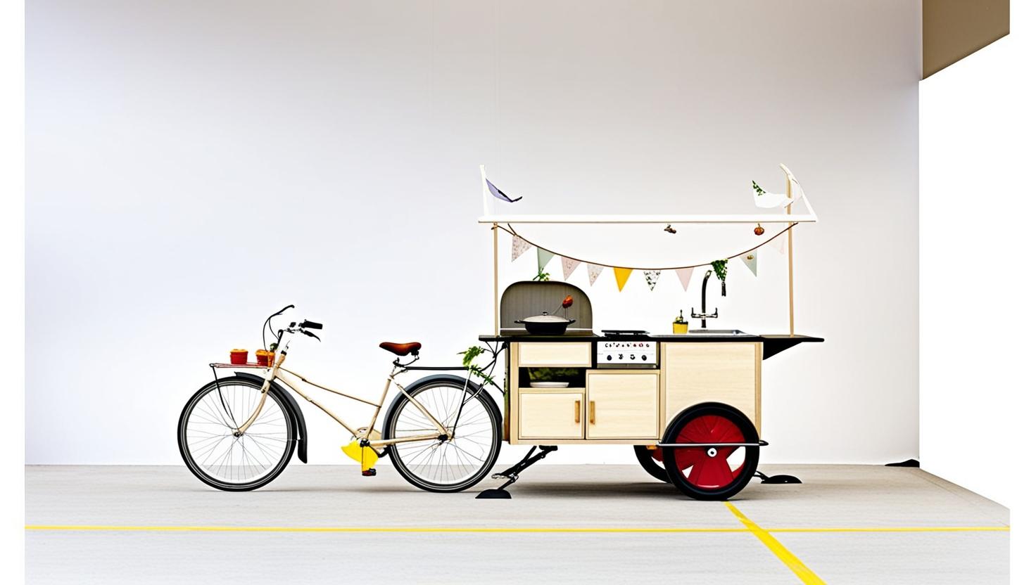 Mobile Design Aesthetics: The bicycle-attached kitchen combines functionality with visual appeal, creating a unique presence in urban spaces. This mobile design serves as a conversation starter, drawing people in with its innovative approach to community engagement.