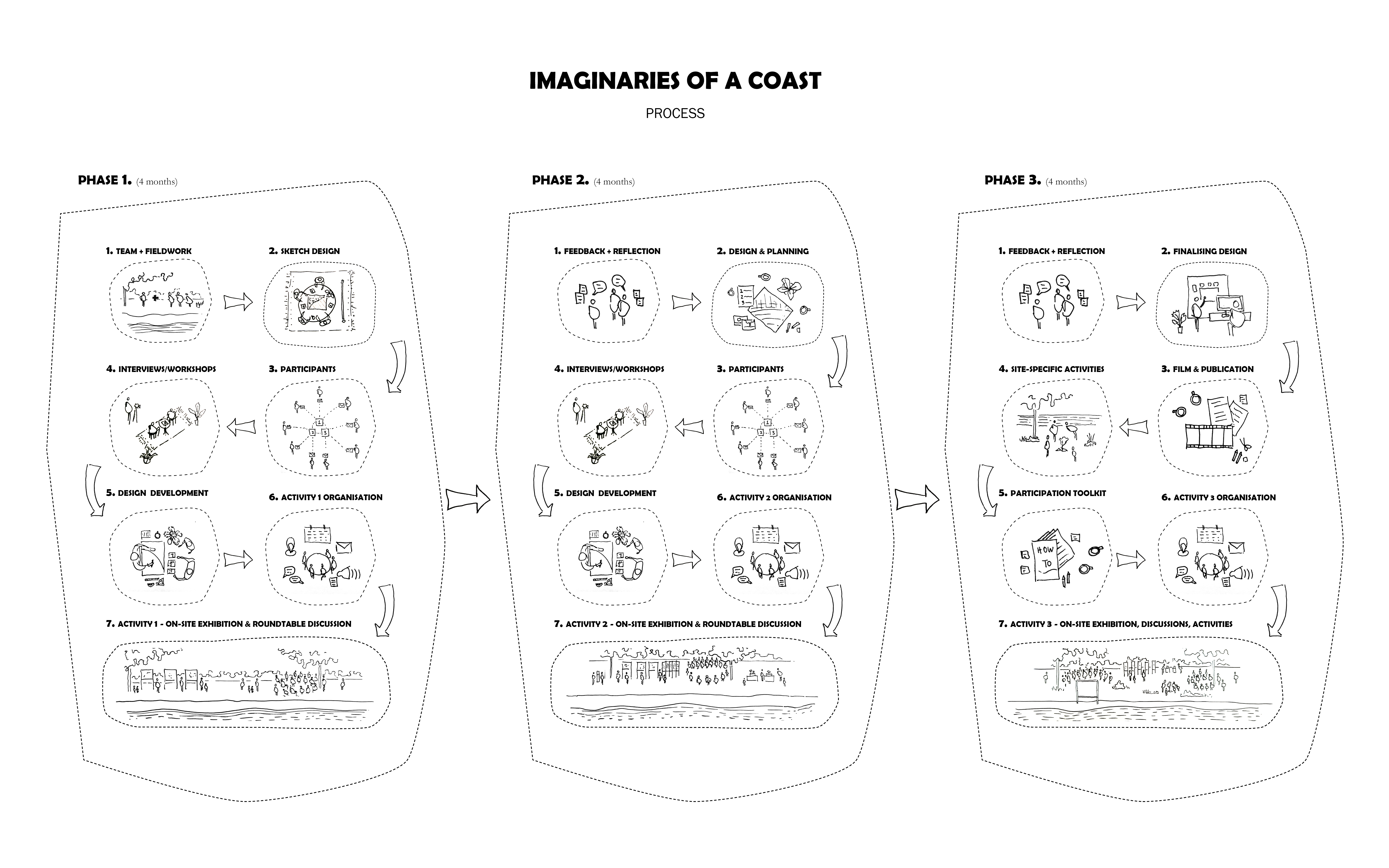 Phase 1: During the first phase of the project the core team is established consisting of the lead architect/urbanist (author) and three interdisciplinary members (marine biology and coastal governance specialist, sociologist/filmographer and visual artist/activist). The team undertakes research and fieldwork and prepares sketch designs for the three scenarios. It identifies and contacts participants to arrange interviews and design workshops. Through these activities (that are recorded), the team develops the design scenarios and organises a public activity at the end of Phase 1 to present and collectively discuss the scenarios.