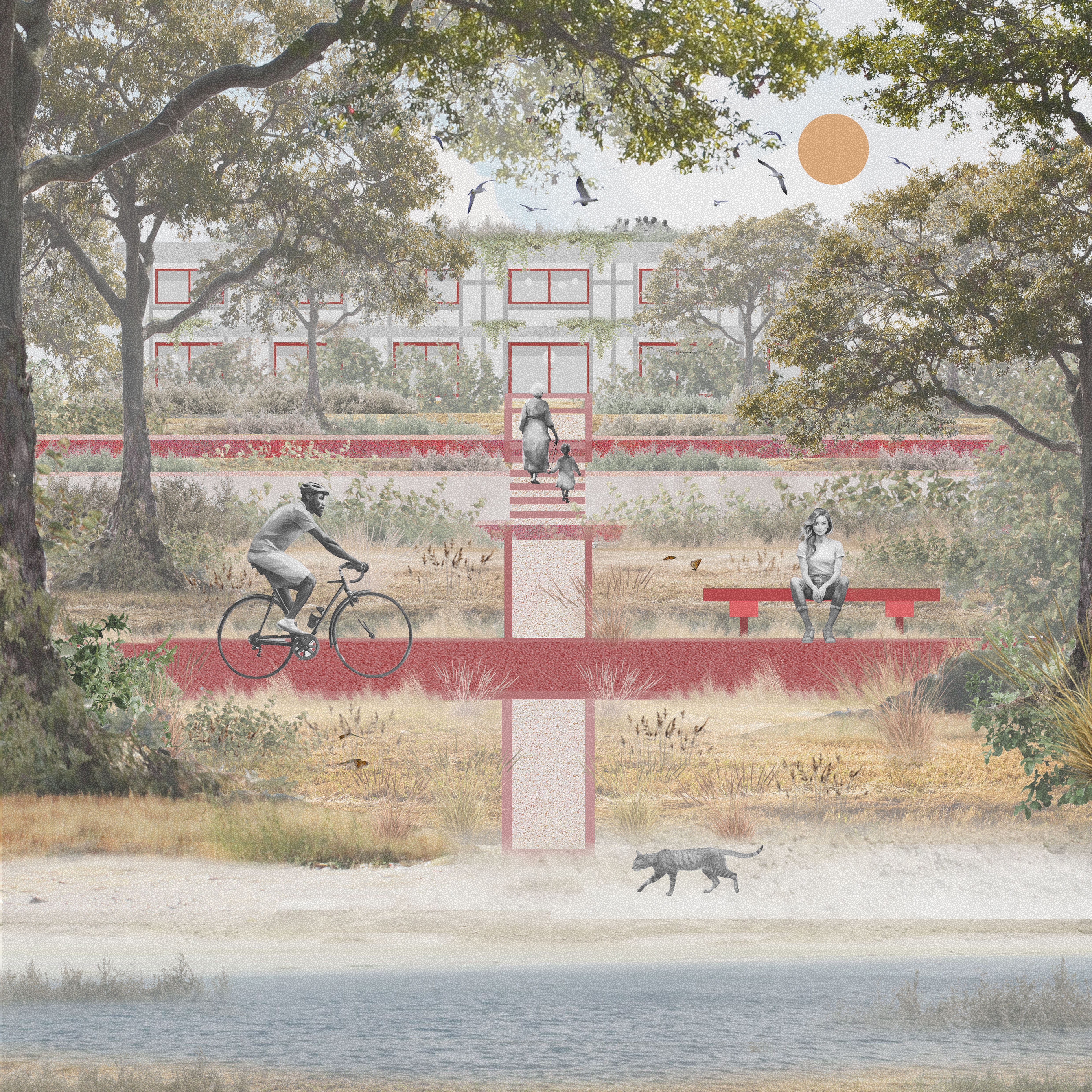 The project proposes the restriction of urban development in the coastal zone, the adaptive reuse of existing infrastructure and circularity practices to reduce the environmental impact of urban development. The project also proposes coastal regeneration through nature-based solutions to mitigate environmental degradation and enhance biodiversity.