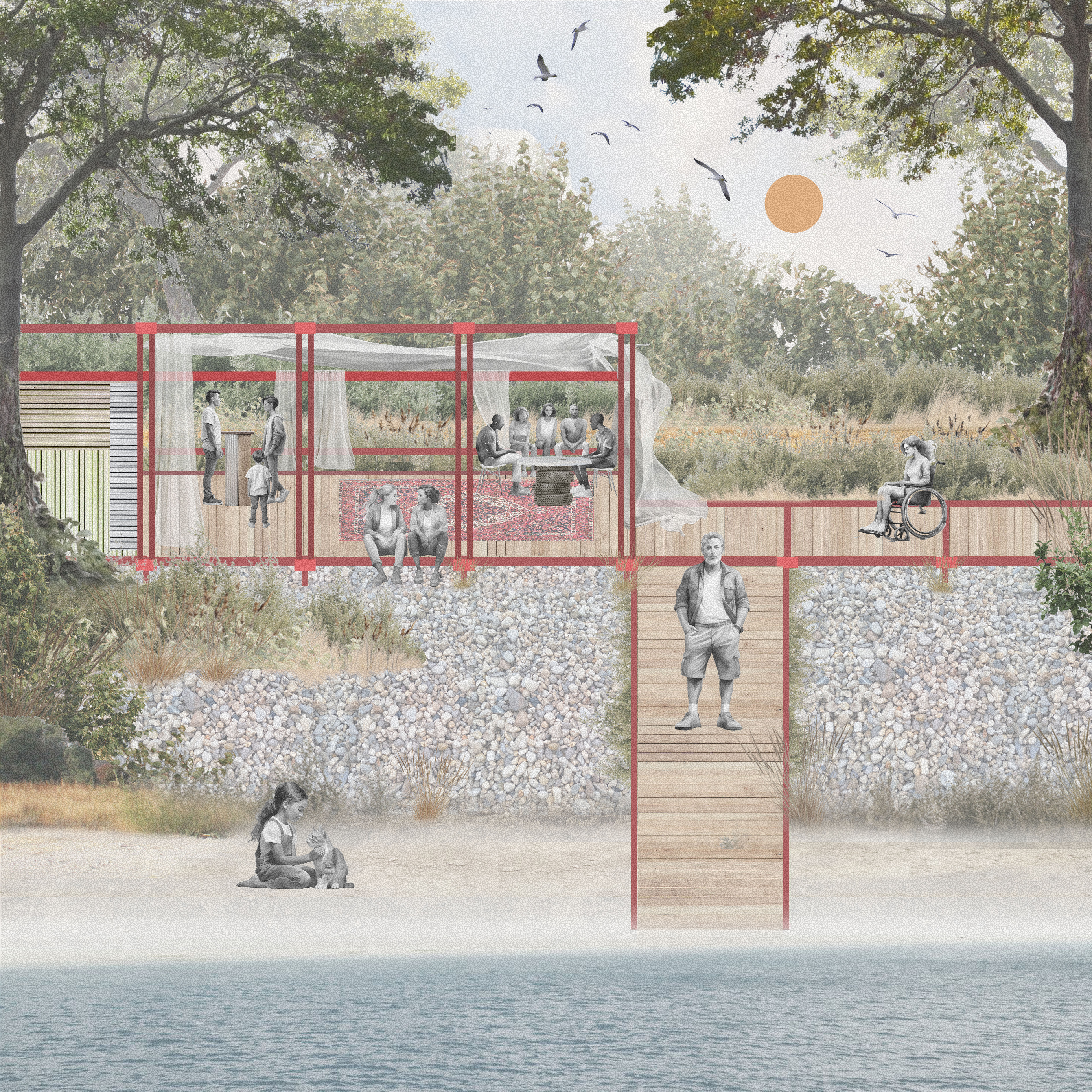 The project proposes an urban degrowth zone and nature-based solutions that transforms the coastal zone of the former industrial site into a thriving wetland ecosystem and a beautiful public space that is able to respond to rising sea levels and extreme weather phenomena.