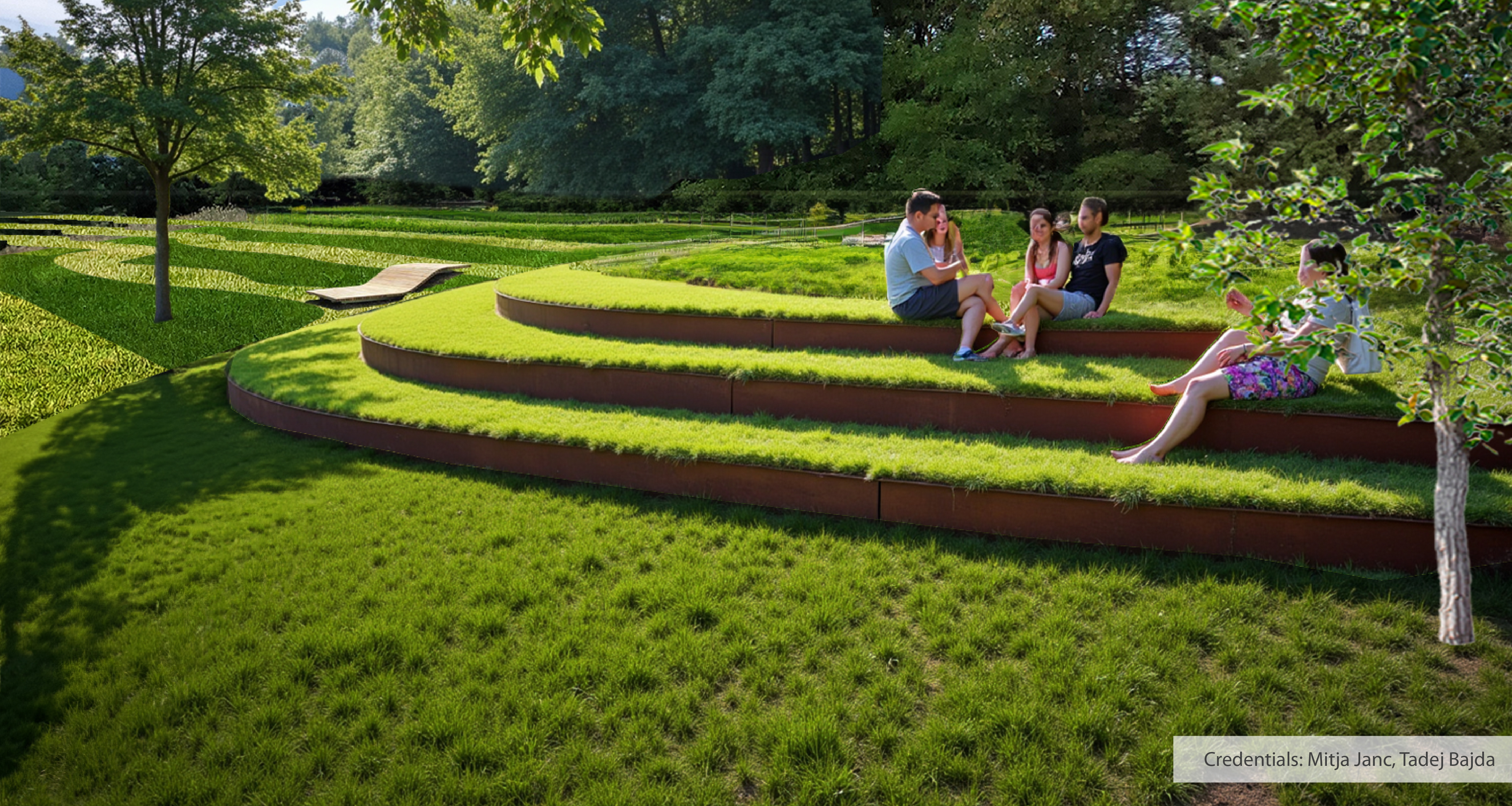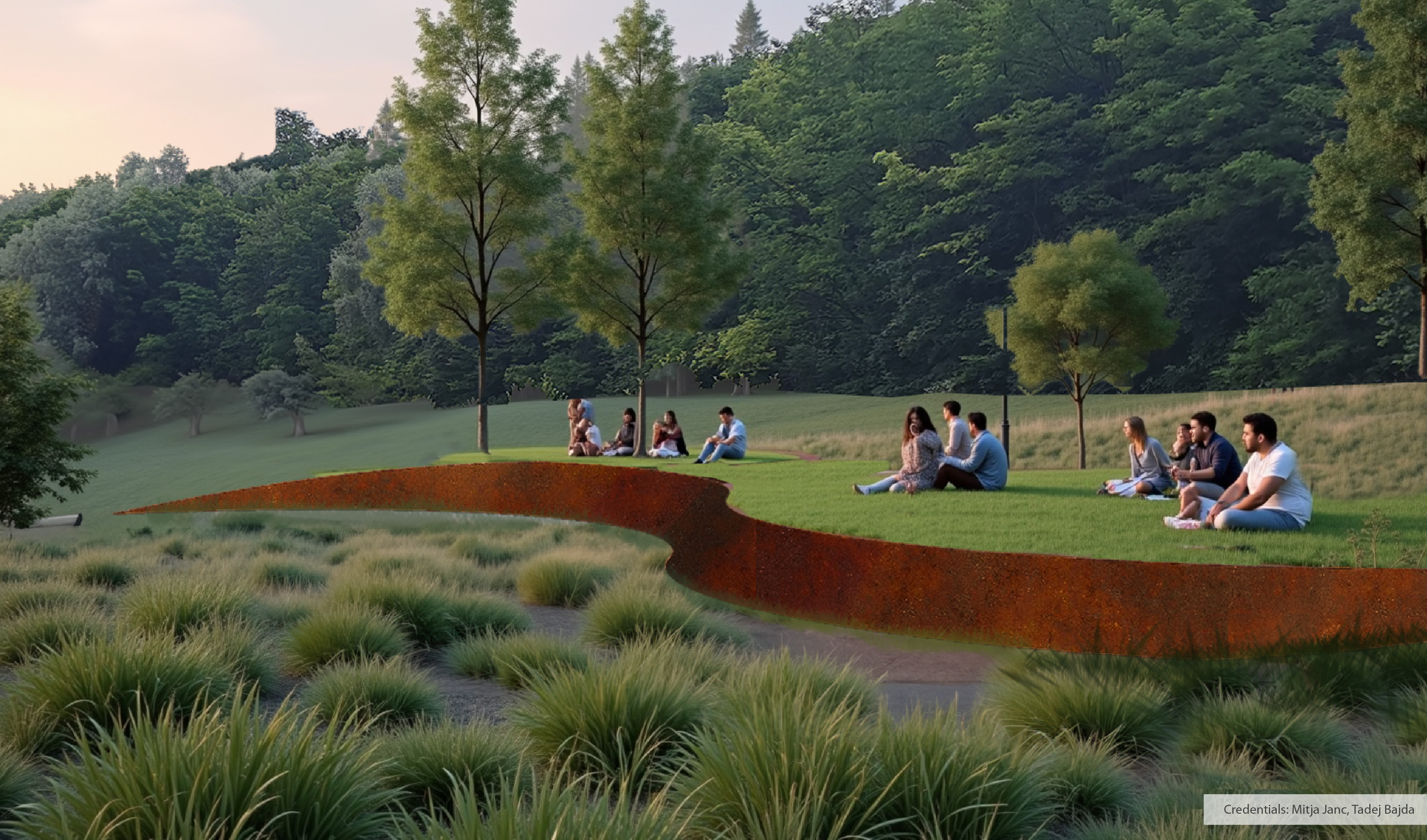 "The Green Bond Ojstro Trbovlje merges aesthetics and experience by integrating landscape architecture, artistic storytelling, and material symbolism. Designed to evoke deep emotional connections with the region’s natural and cultural heritage, the project transforms a degraded mining site into a visually striking, inviting, and historically meaningful public space.