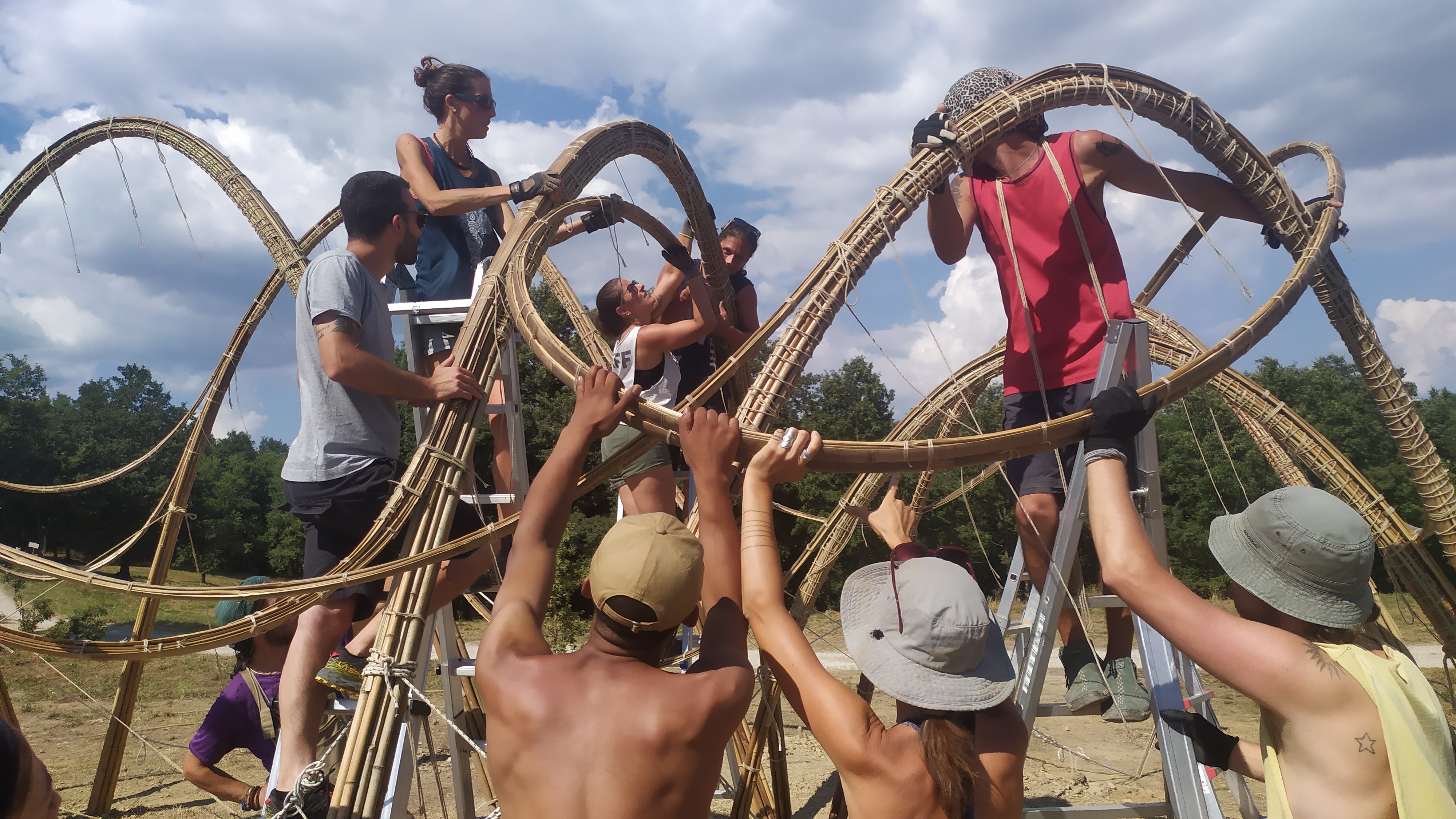 The A project successfully engages stakeholders at various levels—local, regional, national, and European. Each level of engagement has brought unique contributions, reinforcing the project's impact and effectiveness. It is crucial to mention how ARUNDO is an ongoing practice, that continuously envolves stakeholders transversally, in order to navigate and stimulate values of nature reconnection and multi-level impacts. In terms of local engagement, the inclusion of community-based organizations, in Italy and among Europe ensures that knowledge and techniques are shared, creating a grassroots movement that promotes sustainable practices. These organizations have played a crucial role in involving local communities, promoting hands-on learning, and addressing specific environmental challenges posed by invasive species such as Arundo donax. Moreover, ARUNDO collaborates today with italian and spanish municipal authorities and environmental agencies to integrate sustainable design into broader ecological strategies. At national and European levels, ARUNDO has been recognized by universities and institutions that see the value in standardizing its methodologies. Collaborations with the Faculty of Architecture of Bologna and the Escuela Universitaria de Arquitectura Técnica e Ingeniería de la Edificación at the Universidad Politécnica de Catalunya (UPC) have led to the codification of raw material selection, classification, and structural assembly processes. These partnerships validate the scientific and architectural relevance of ARUNDO’s approach. Participation in festivals such as Boom Festival (Portugal), Freedom Festival (Portugal), and Burning Mountain (Switzerland) has allowed the project to reach an international audience, promoting best practices in sustainability and innovation. Additionally, ARUNDO’s methodology aligns with European environmental policies, encouraging cross-border collaboration and policy alignment.