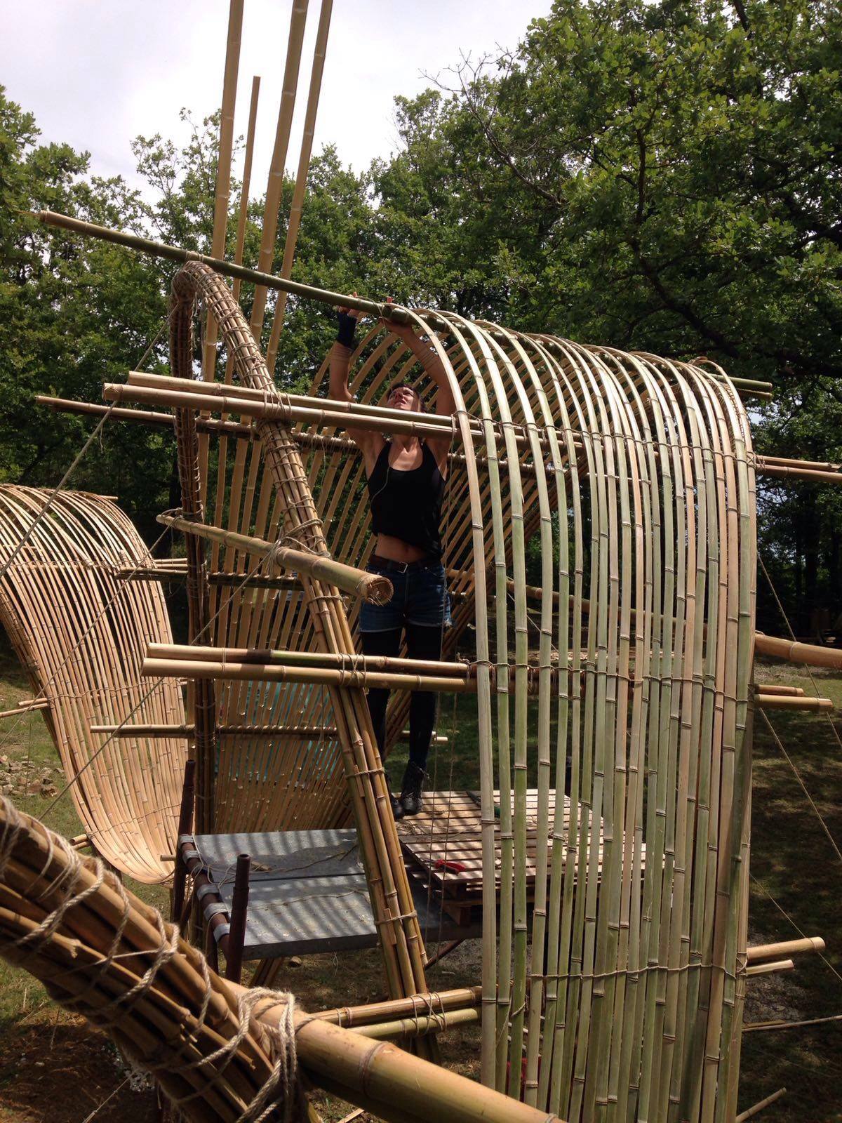 A. engages local communities, artisans, and environmental groups in the protection, the revitalization, and the regeneration of natural ecosystems, while concentrating in the selection of materials, the design of structures, and the construction process itself. The creation of A’s bio-architectural designs holds deep symbolic significance, as it is an inherently collaborative and inclusive process. Each bamboo or Arundo donax branch is unique in its curvature, strength, and texture, requiring collective evaluation to determine its role in the final design.