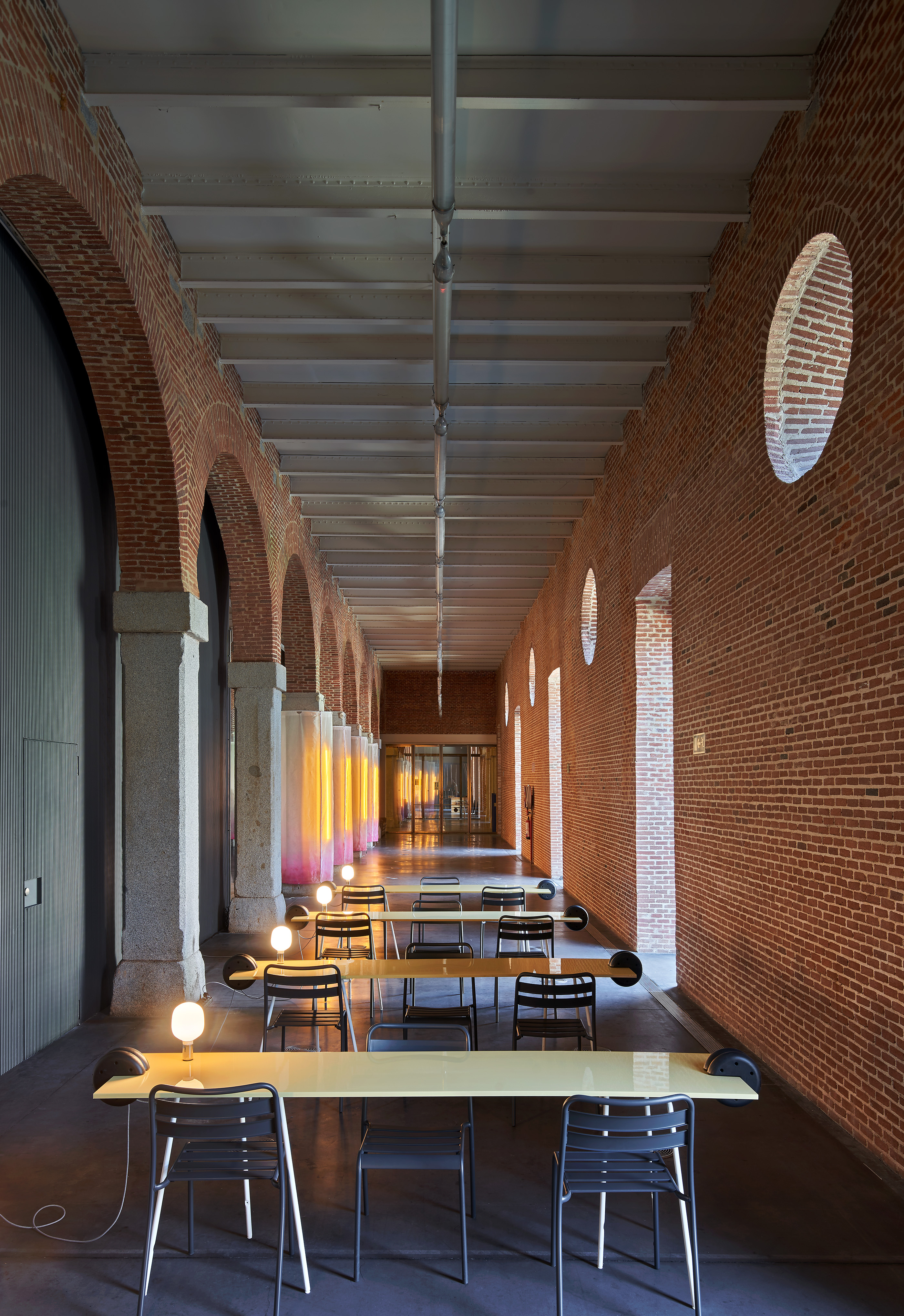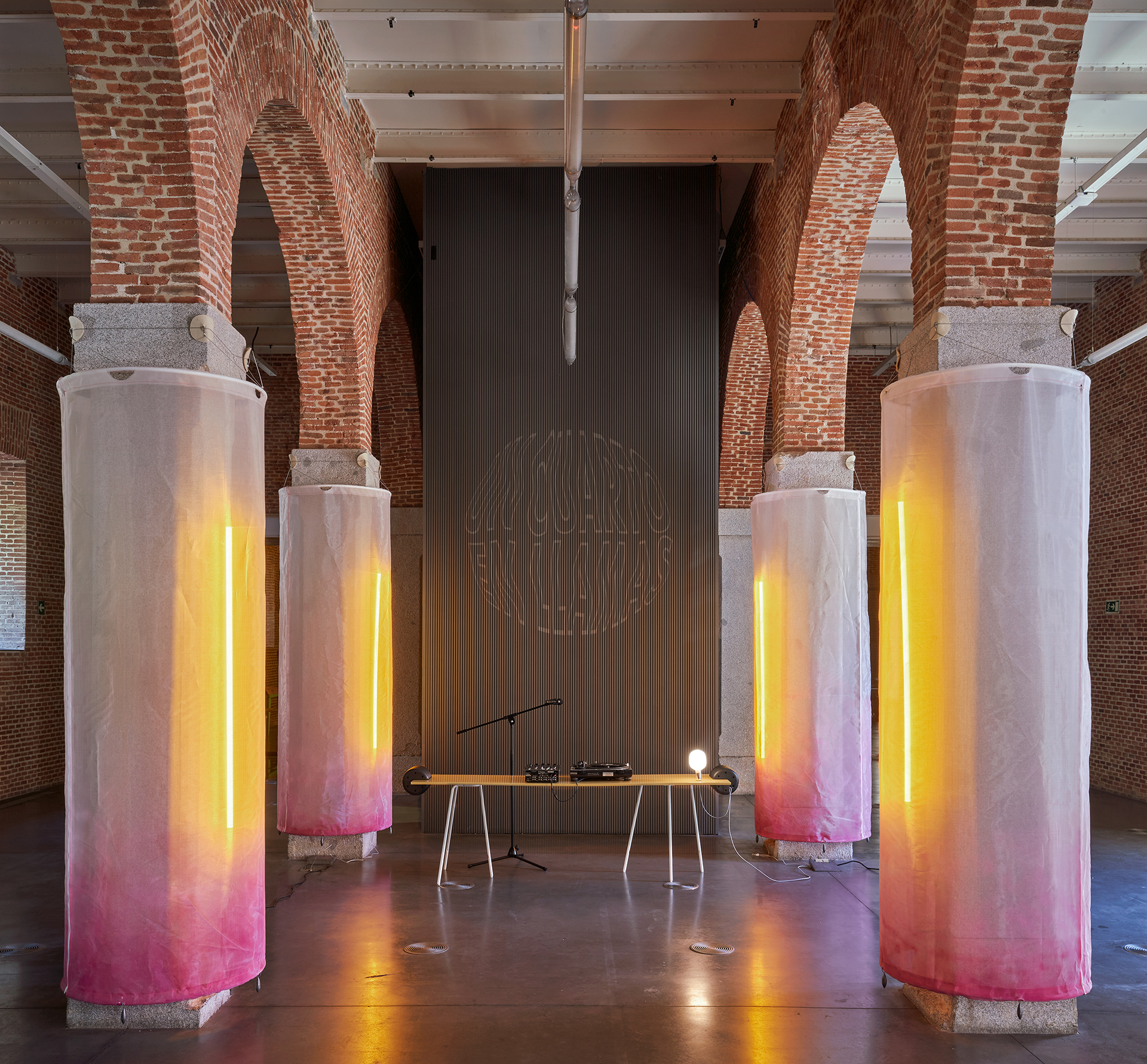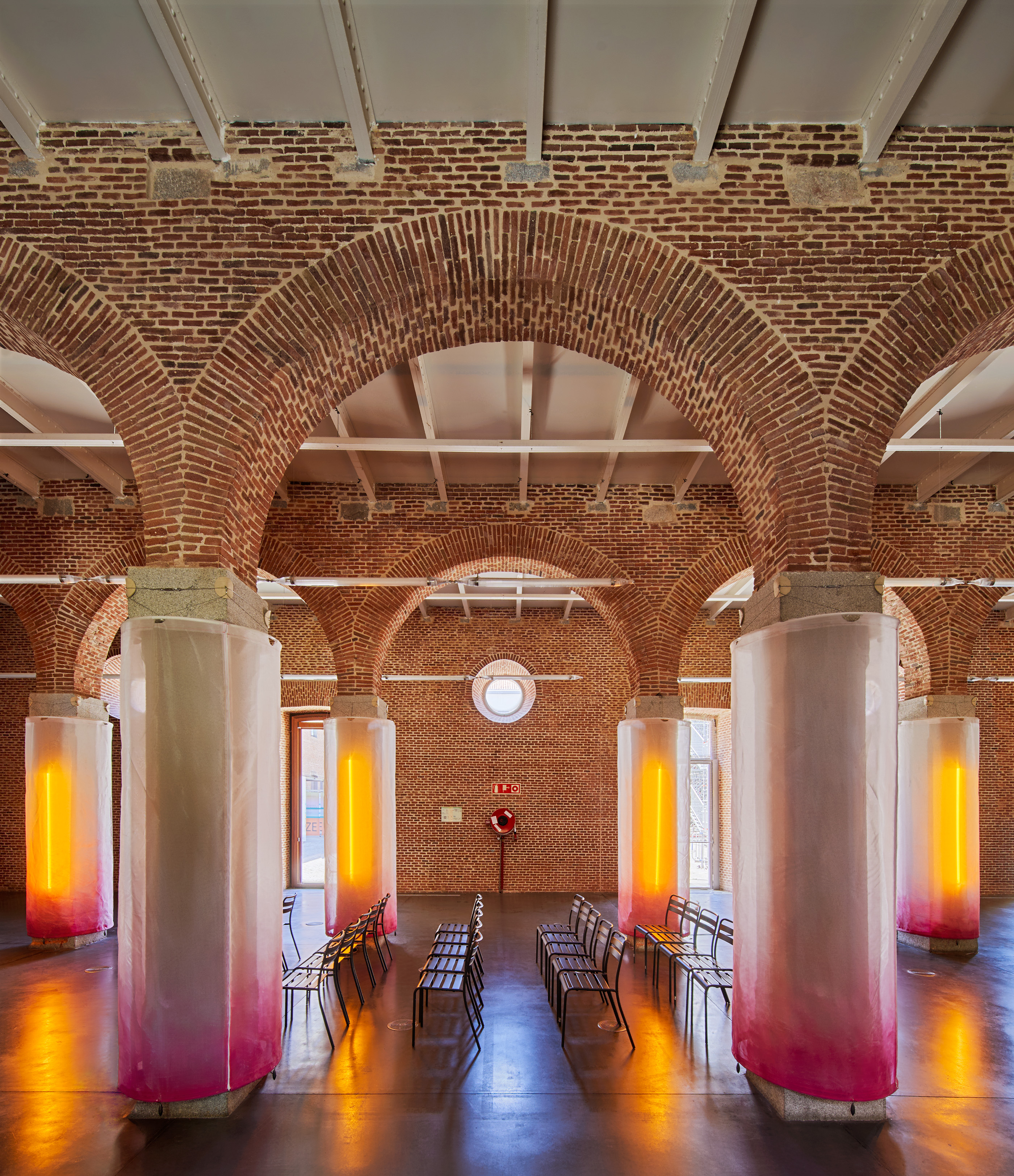 Un Cuarto en Llamas was developed at the Sala Polivalente (Multipurpose Room) of the Conde Duque military barracks. The Sala Polivalente at Conde Duque is an open space with a basilica-like floor plan defined by three bays of granite columns, delimited by brick walls. As it is a listed building, all interventions on the pre-existing architecture are limited, prohibiting any alteration of the original elements or the mounting of pieces employing holes or chemical adhesives.